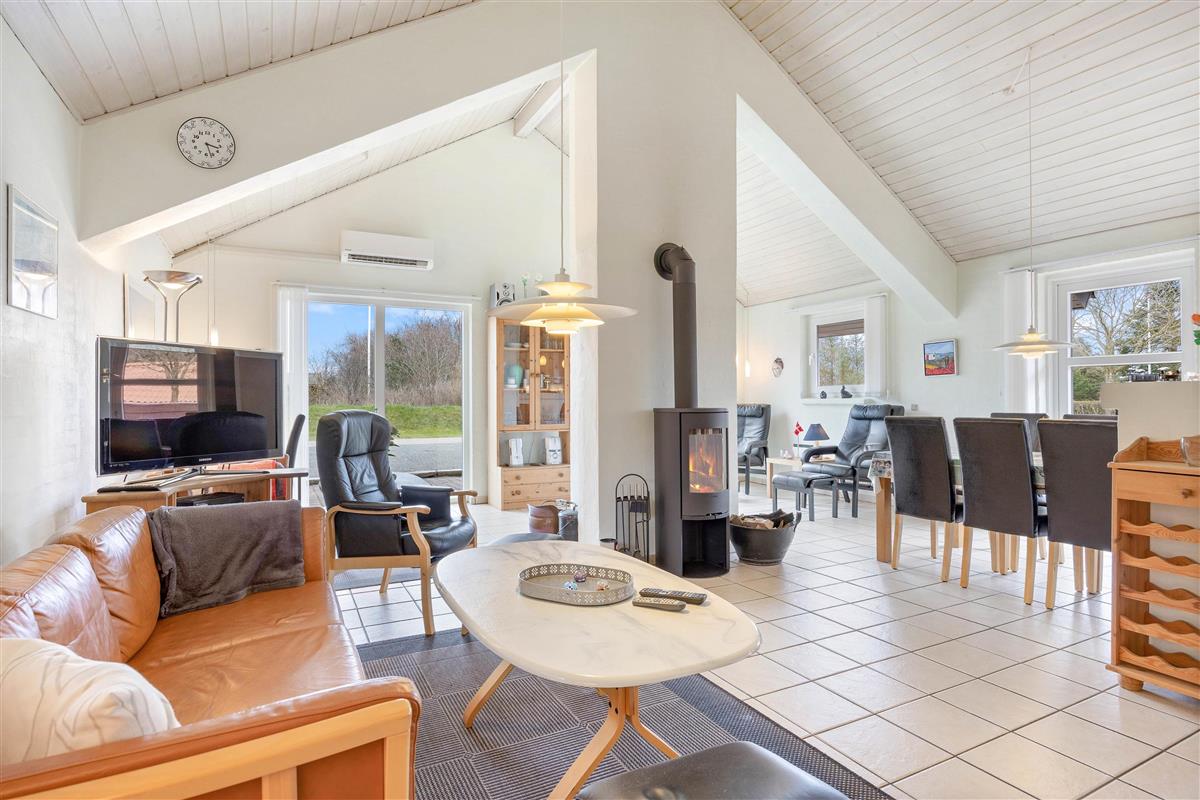 The heart of the holiday home is the spacious living area, combining kitchen, dining area and living room. Here you can cook together, enjoy meals, play games or simply relax. A wood-burning stove in the living area provides that typical holiday home atmosphere and cosy warmth. Additionally, an energy-efficient air-to-air heat pump has been installed, ensuring a consistently comfortable temperature throughout the holiday home.