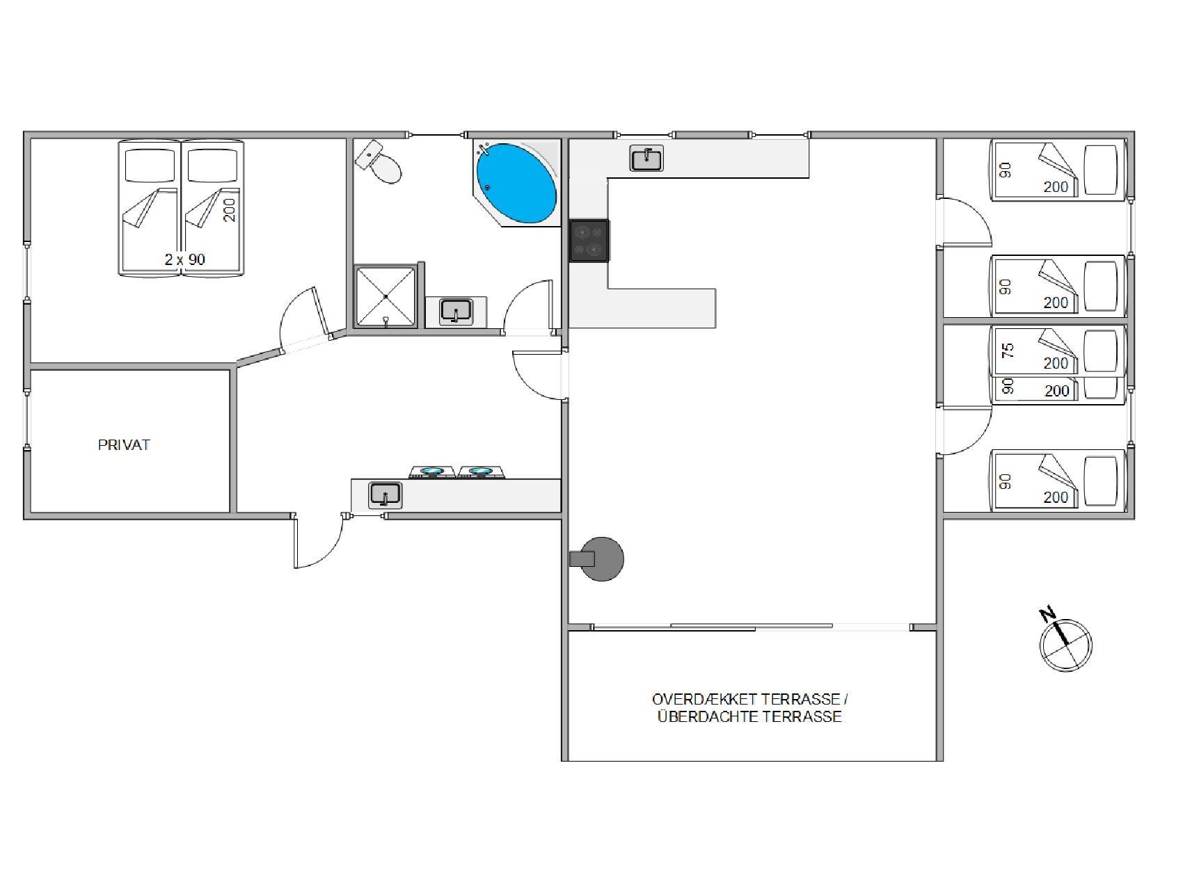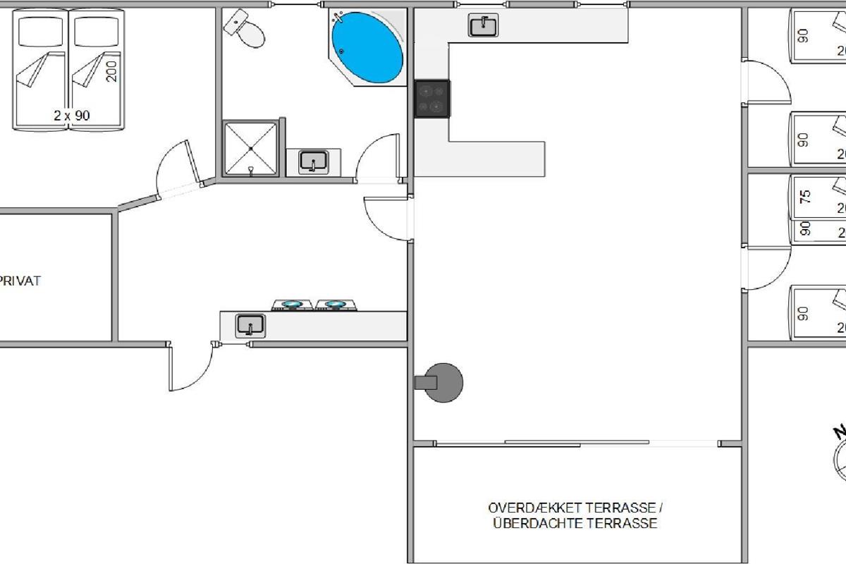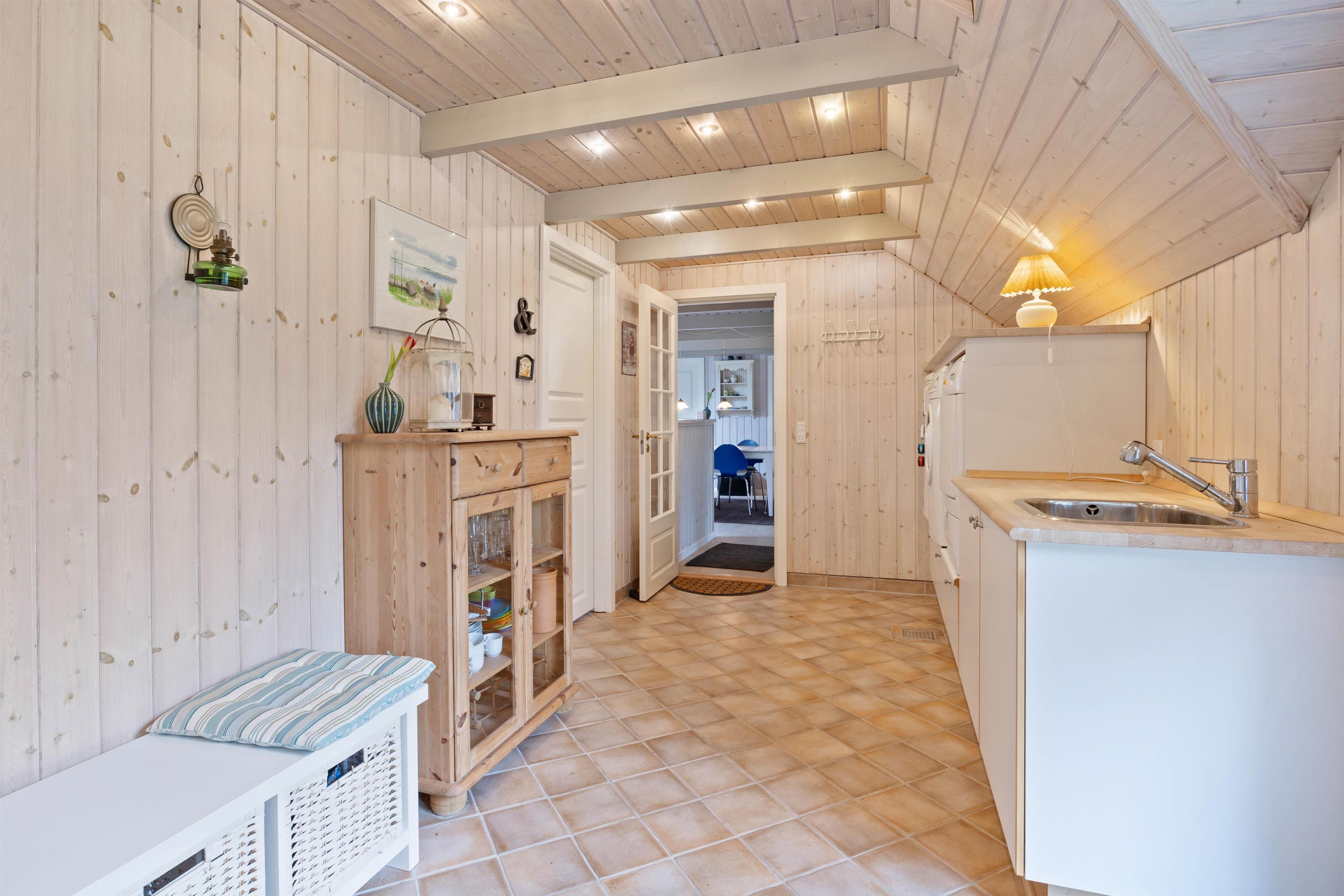 The bathroom, accessed from the entrance area, features underfloor heating to keep your feet warm on chilly mornings. Here you'll find the holiday home's highlight - the whirlpool. Perfect for warming up and relaxing after a long beach walk.
