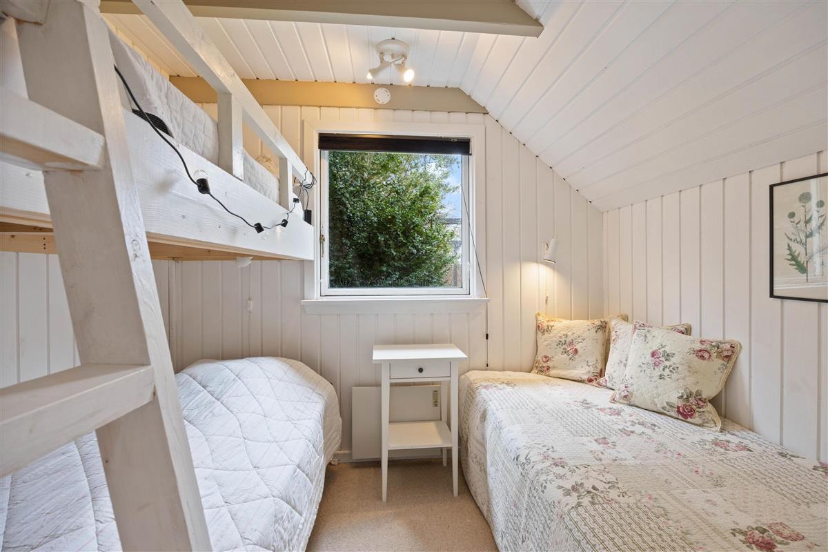 The three bedrooms branch off from the living area and entrance hall. One bedroom features a double bed, while the second has two single beds. The final bedroom is equipped with a bunk bed and an extra single bed for anyone who prefers not to sleep on the top bunk.