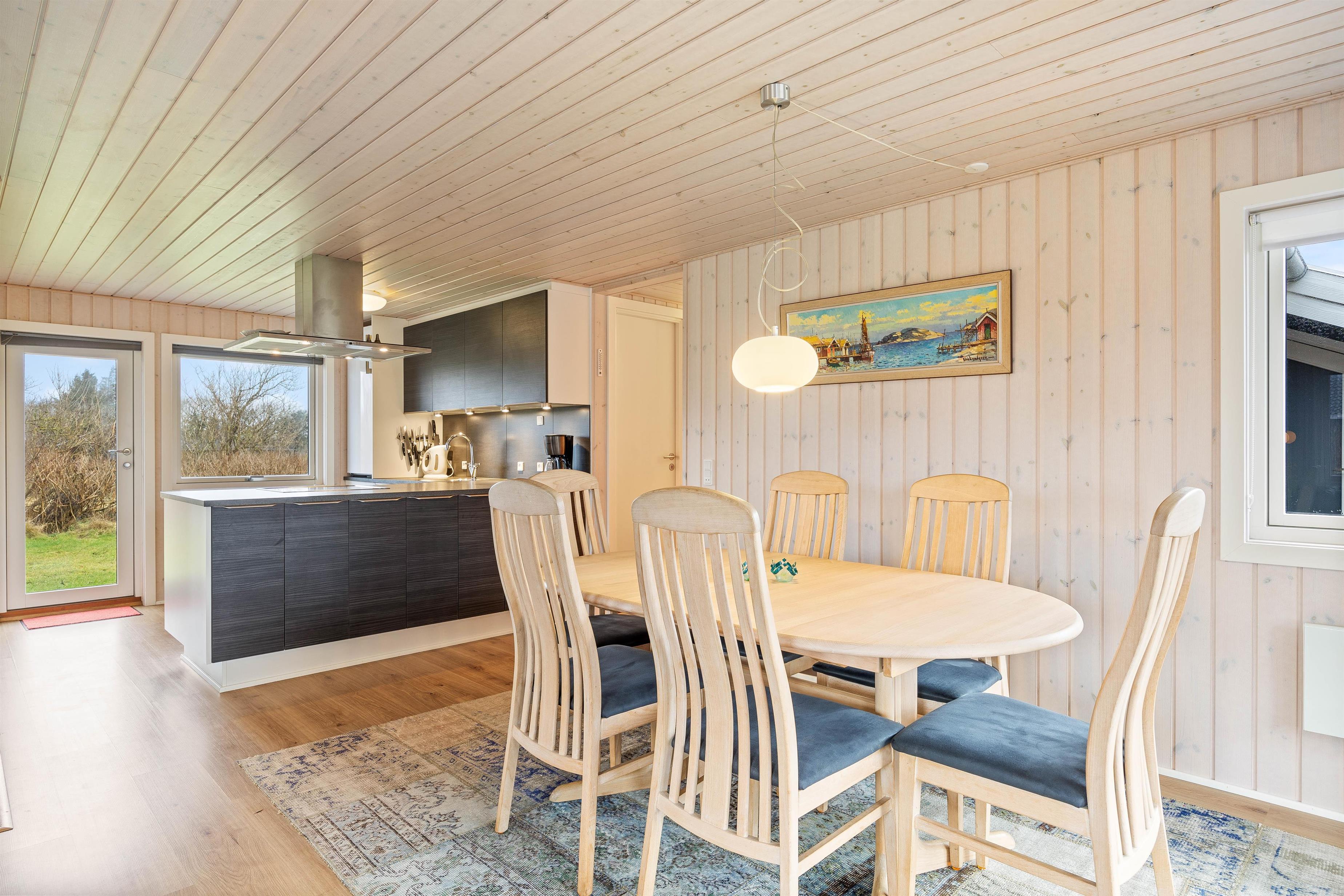 Upon entering the holiday home, you're welcomed by cosy furnishings with wood-panelled walls and ceilings, exuding the typical holiday cottage atmosphere. This ambiance is enhanced when you light the fireplace in the living room and listen to the crackling of the flames. The kitchen, living room and dining area flow together in an open-plan arrangement, allowing you to spend time together, whether relaxing in front of the Smart TV or enjoying a fun games evening.