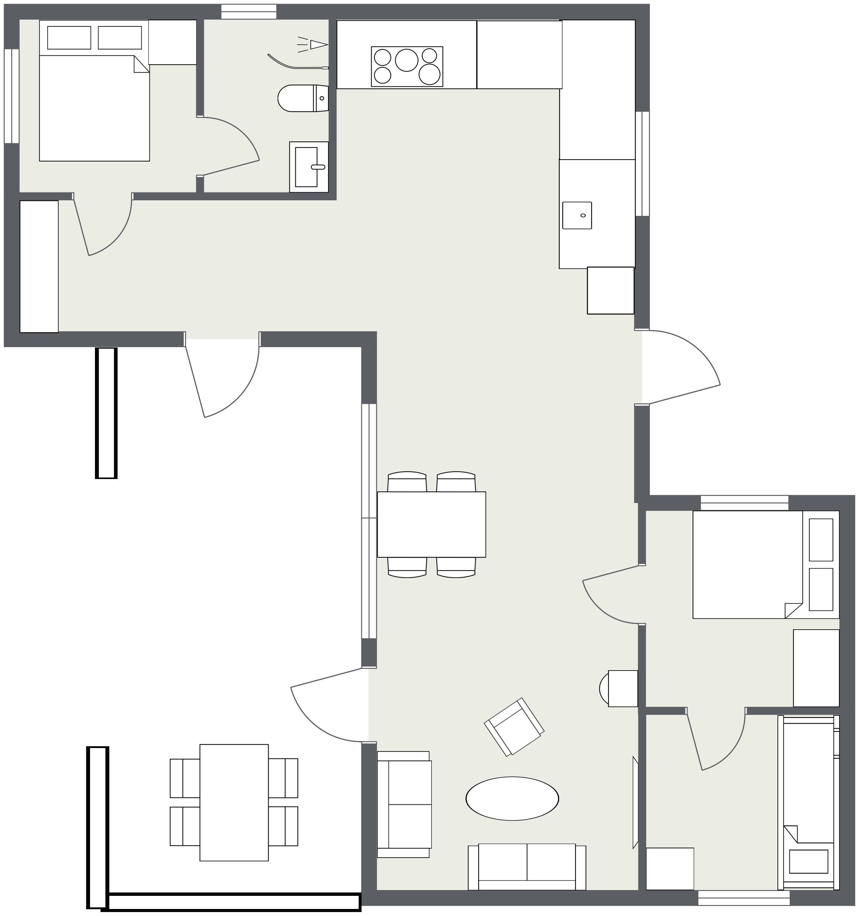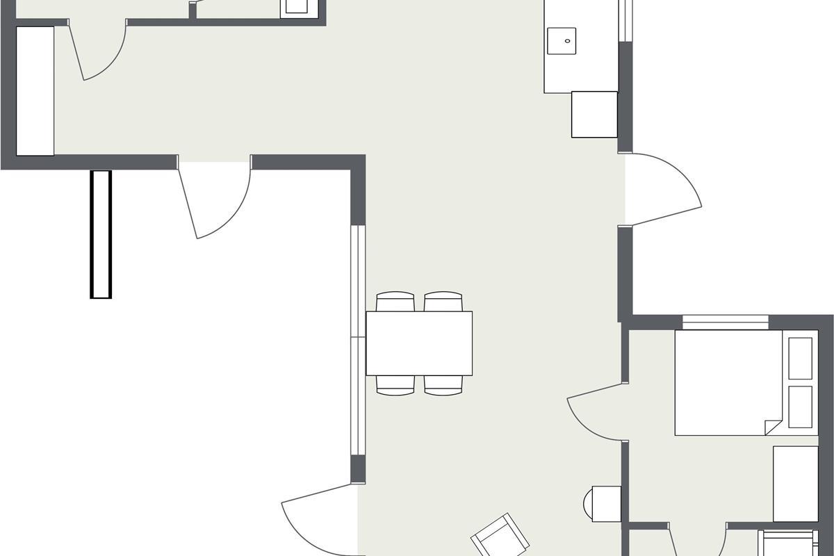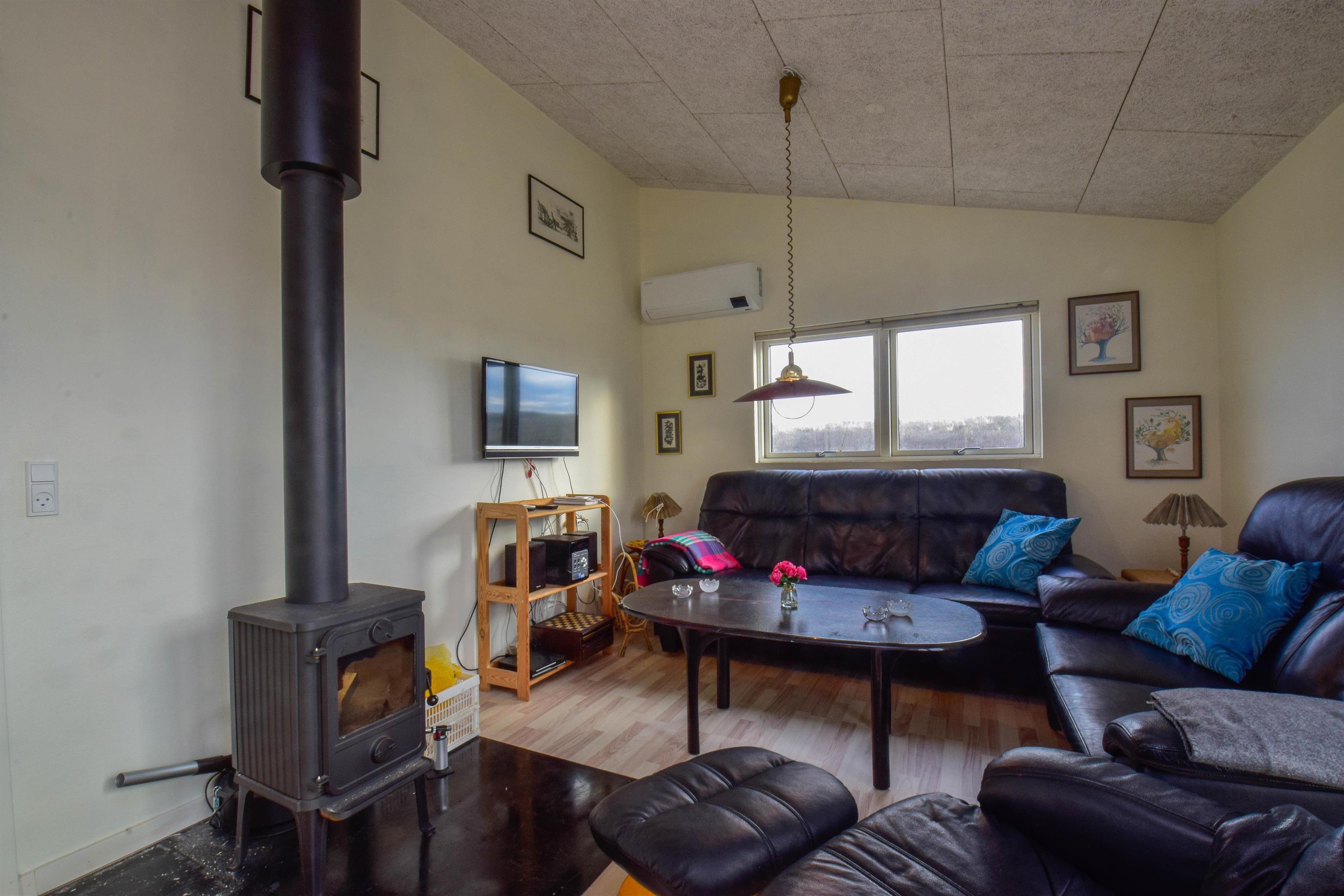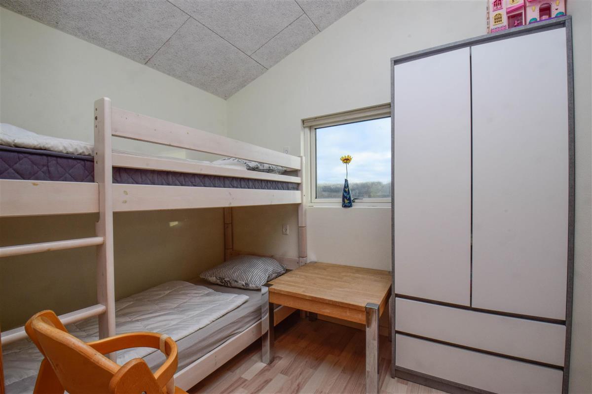 Layout: Part of this house was newly built in 2022. It includes the entrance hallway, a large bedroom and a beautiful bathroom with underfloor heating. The original rooms have also been modernized. The kitchen is open to the comfortably furnished, bright living room, which is open to the ridge. It will be wonderfully warm with the beautiful fireplace and the additional heat pump. From here you have access to the large bedroom and another bedroom with bunk beds. You can also reach the various terraces from the living room.