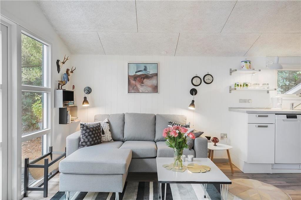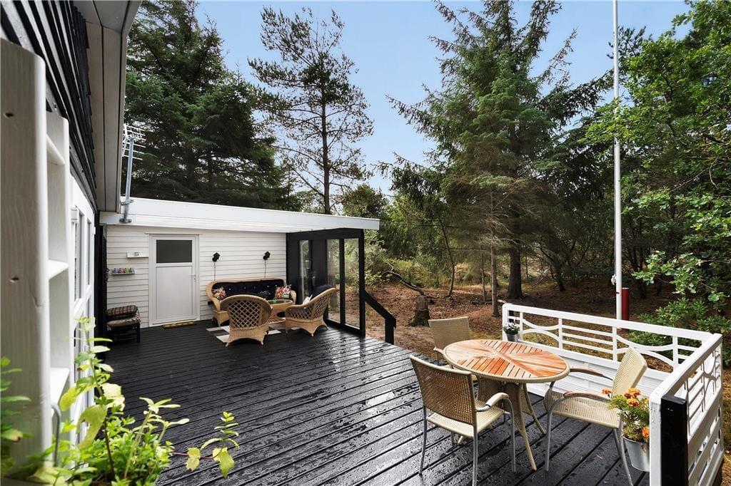 Du träumst von gemütlichen Urlaubstagen inmitten der Natur? Dann solltest du dir dieses reizenden Holzferienhaus genauer anschauen! Das Haus, das im Jahr 2018 renoviert wurde, beherbergt 2 Erwachsene und 2 Kinder. Es präsentiert sich hell und einladend und überzeugt mit klassischen Ferienhauscharme. Die ansprechende, gut ausgestattete Küche ist offen mit dem Wohnraum verbunden. Dieser Raum wird schnell zum beliebten Sammelpunkt von Groß und Klein avancieren. Ihr genießt hier zusammen die Mahlzeiten und viele gemütliche, erholsame Stunden. Vom Wohnraum aus blickst du hinaus auf das friedvolle Naturgrundstück. Die schöne Holzterrasse, auf der du mit Sonne und Ruhe verwöhnt wirst, ist vom Wohnraum aus zugänglich. Der Rest der Wohnfläche ist einem schönen Badezimmer mit Dusche und zwei Schlafräumen überlassen. Einer der Schlafräume beinhaltet ein Etagenbett für Kinder und befindet sich im Haupthaus. Der zweite, mit zwei Einzelbetten eingerichtete Schlafraum ist im gemütlichen Nebengebäude untergebracht. Dieses Ferienhaus bildet einen schönen Rahmen für entspannte Urlaubstage, die im Zeichen von Nähe, Natur und Urlaubsstimmung stehen.