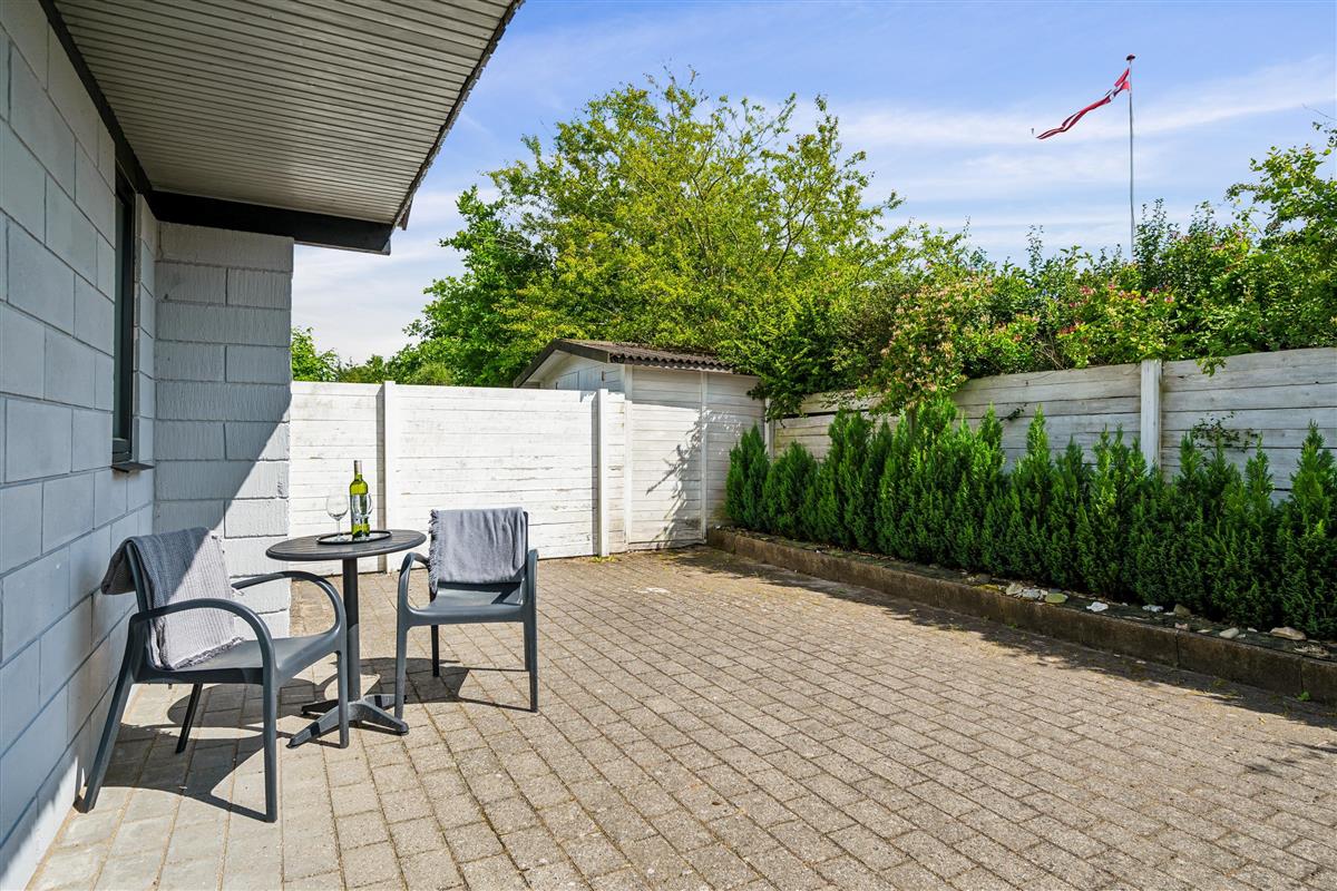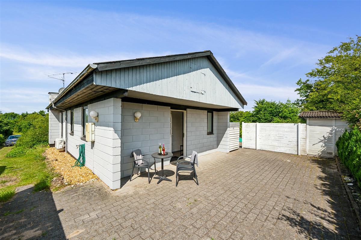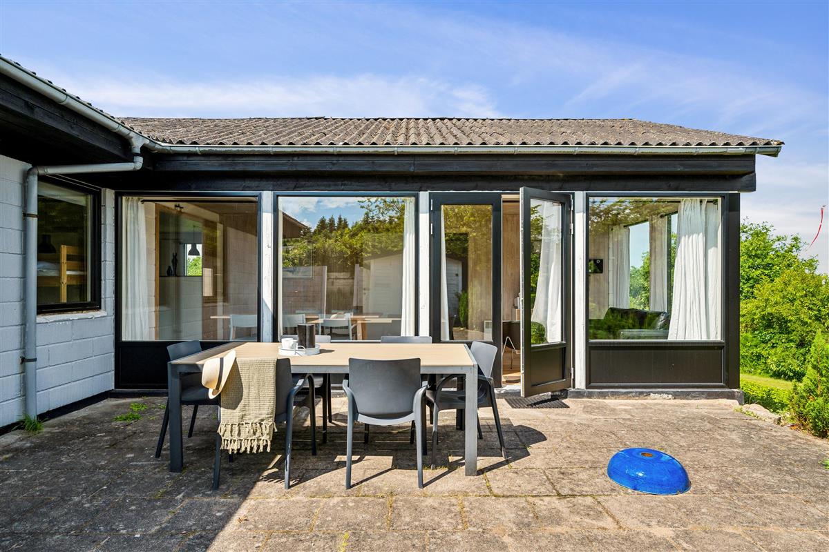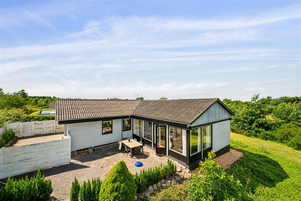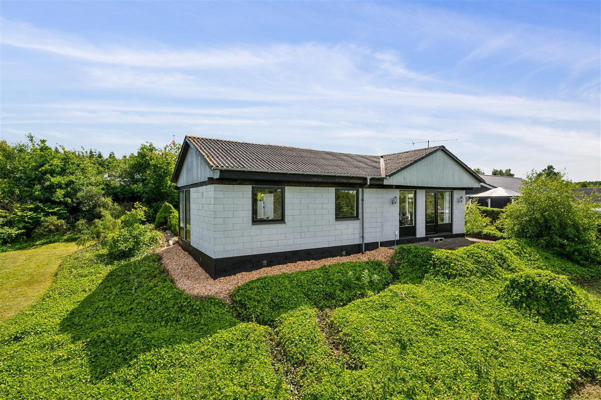 Not far from Fjellerup, you will find this older but well-designed house. The house includes a functional kitchen with a dishwasher, among other things. Adjacent to the kitchen is a cozy dining area and a living room with a wood-burning stove and heat pump, with access to the terrace. The house has 8 sleeping accommodations spread across four bedrooms: two rooms with bunk beds, one room with a double bed, and one room with two single beds. There is a bathroom with a shower niche and a guest toilet. The house is situated on a sloping plot with a lawn in a charming and quiet area, not far from a nice beach.