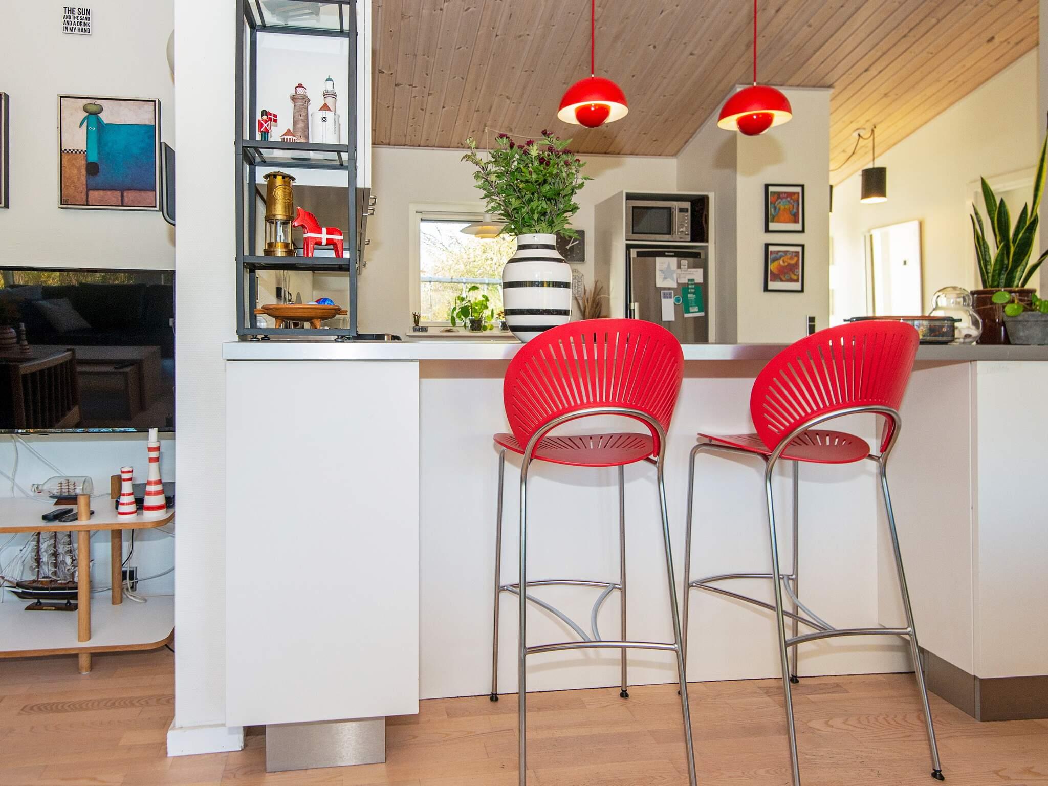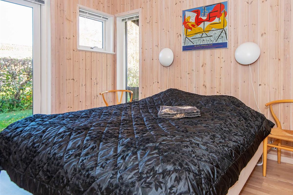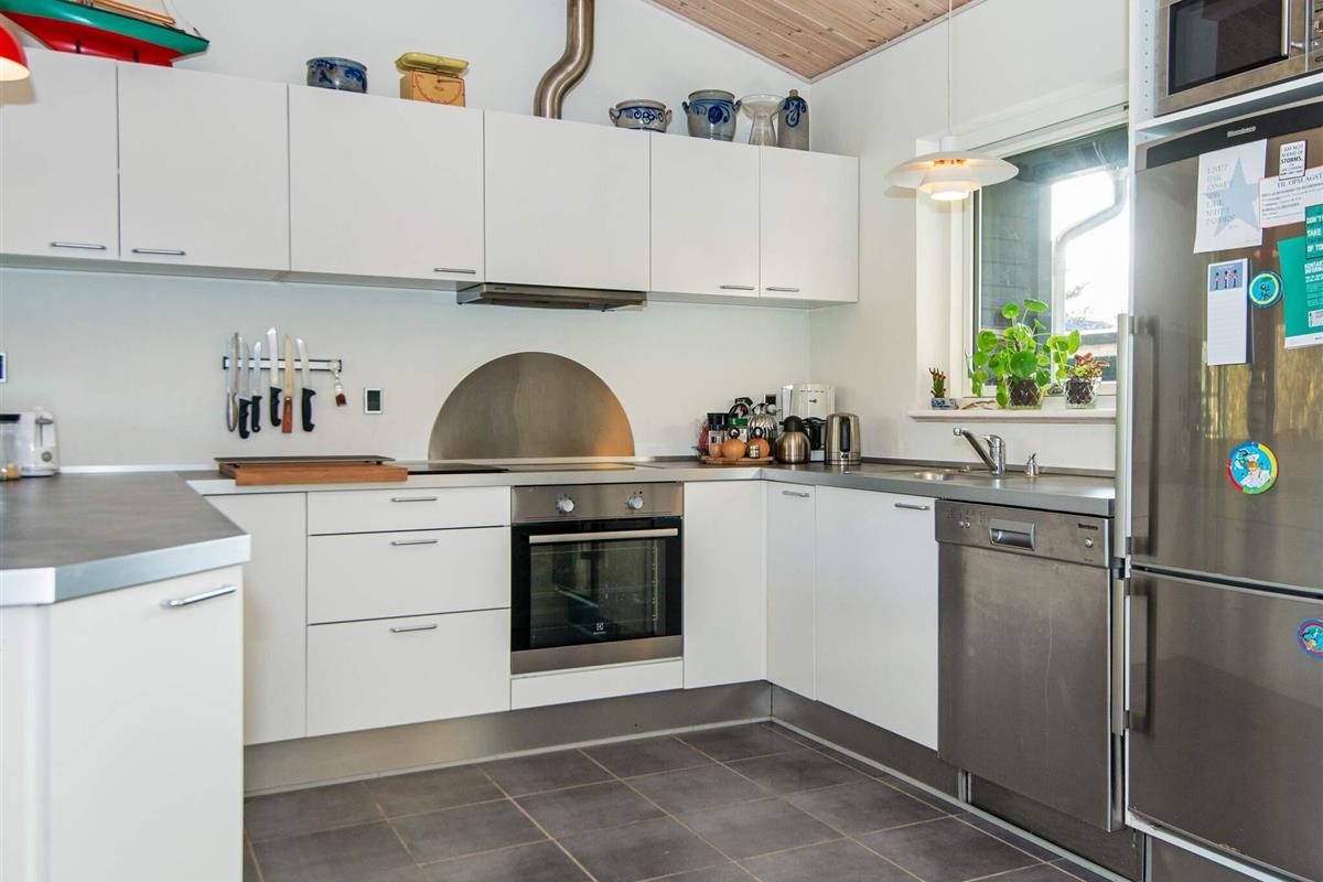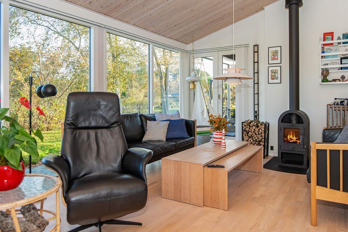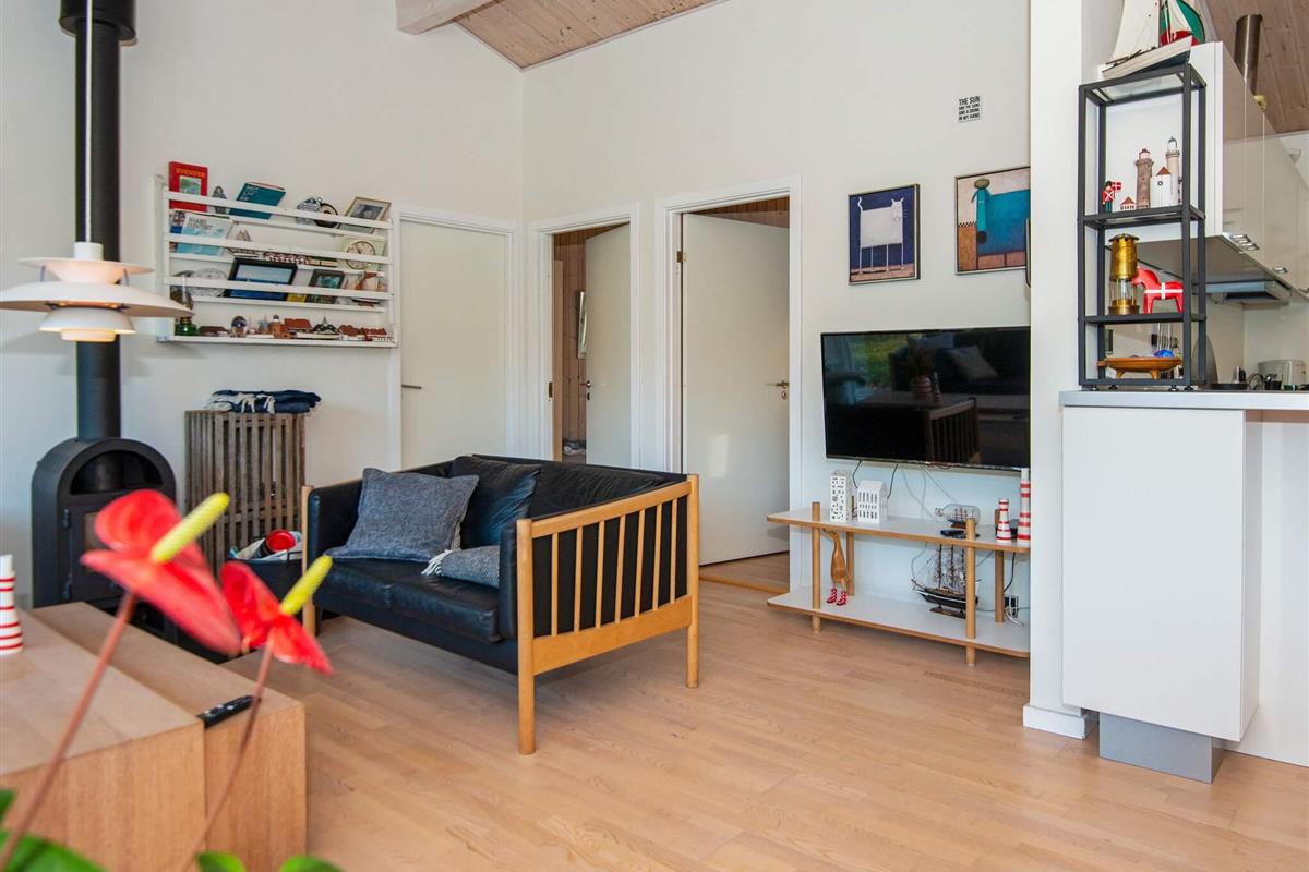 Im Inneren ist das Wohnzimmer ein gemütlicher Ort zum Zusammensein, ausgestattet mit einem Holzofen, einer Stereoanlage mit CD- und DVD-Player, Satellitenfernsehen mit dänischen Kanälen und mindestens zwei deutschen Kanälen. Für kleine Kinder steht ein Hochstuhl zur Verfügung. Die voll ausgestattete Küche mit Elektroherd, Kühl-Gefrierkombination, Mikrowelle, Dunstabzugshaube, Kaffeemaschine und Geschirrspüler macht das Zubereiten von Mahlzeiten einfach und angenehm. Das Haus verfügt über vier Schlafzimmer; zwei mit Doppelbett, zwei mit Einzelbetten, dazu gibt es ein 150 cm langes Kinderbett. Es bietet somit flexible Schlafmöglichkeiten.
