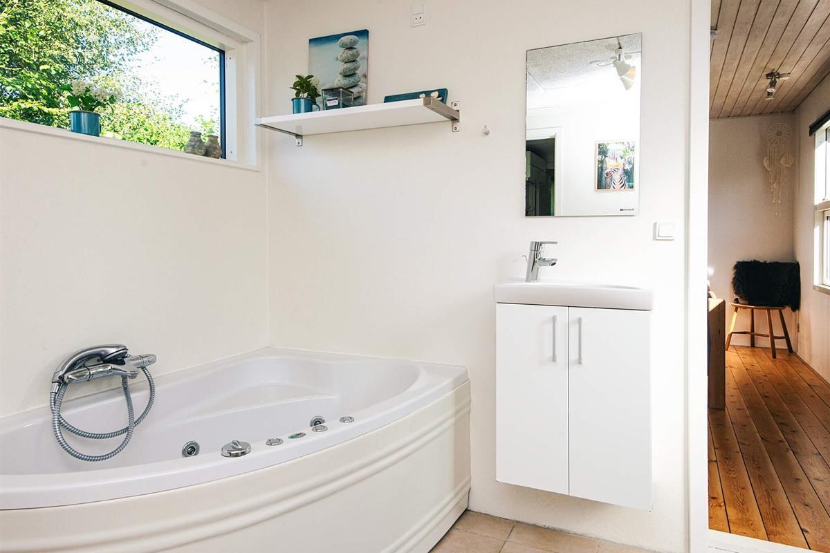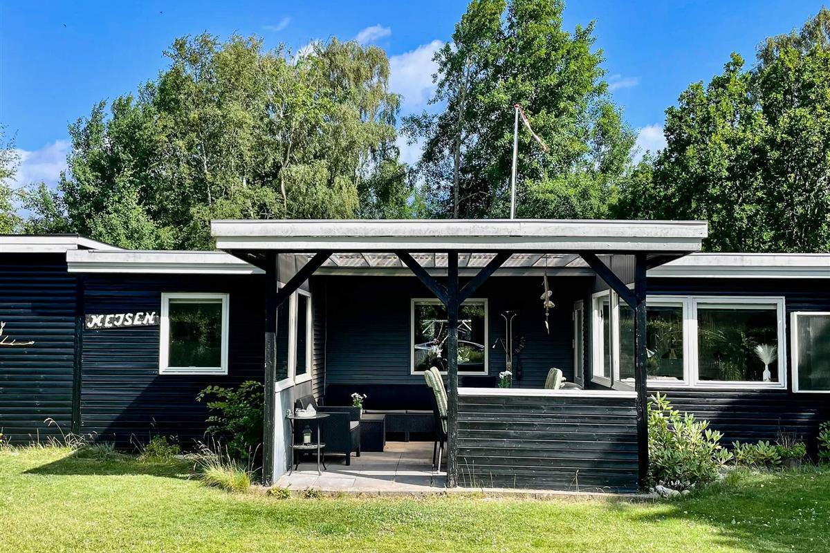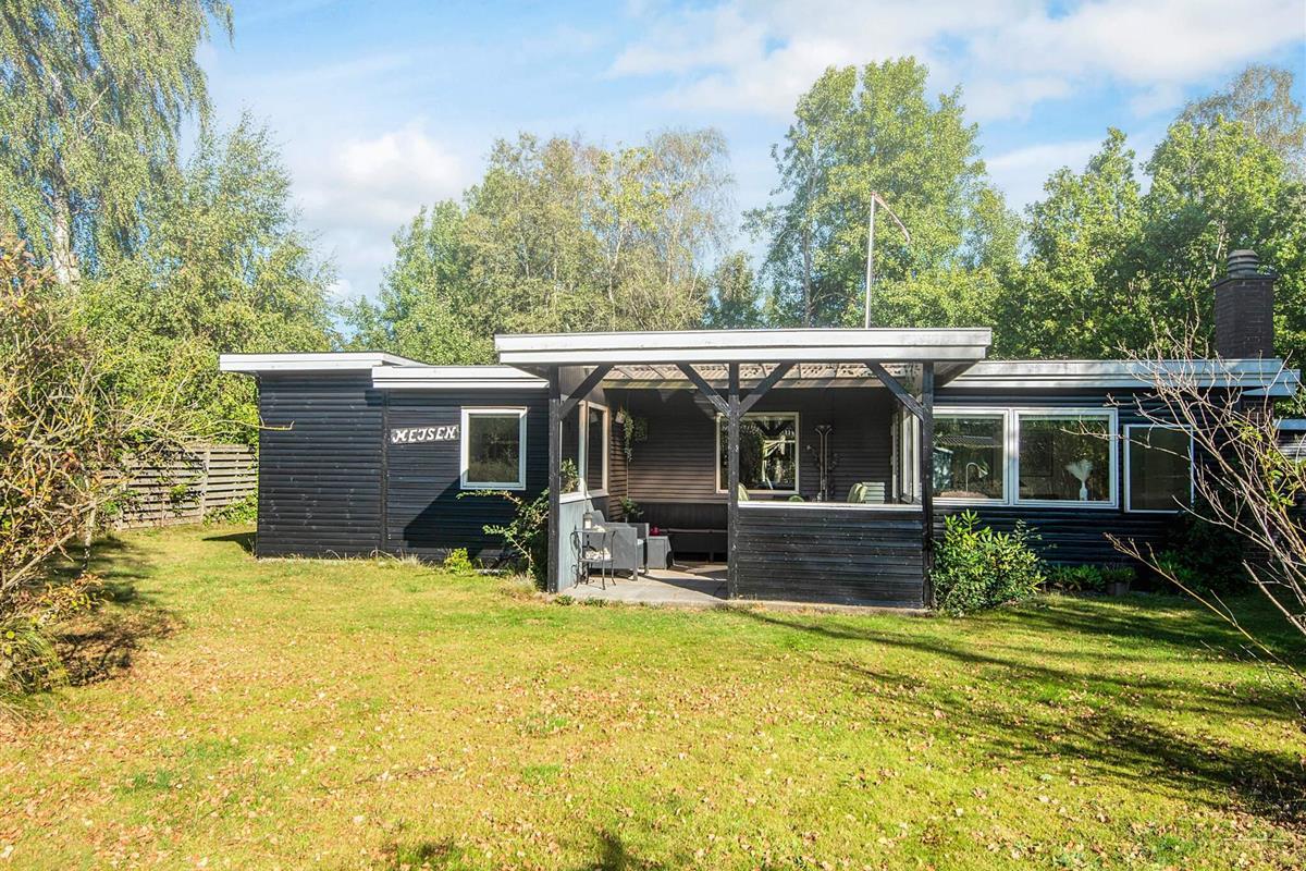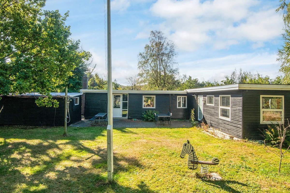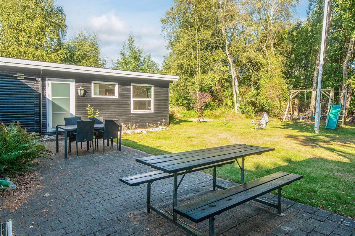 Ferienhaus mit Whirlpool im Bad und attraktiver Lage auf einem 1.355 m2 großen Naturgrundstück bei Fjellerup Strand, auf dem es ein Spielehäuschen sowie Sandkasten und Schaukelgerüst mit Rutsche speziell für die Kleinen gibt.