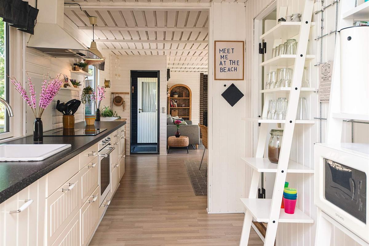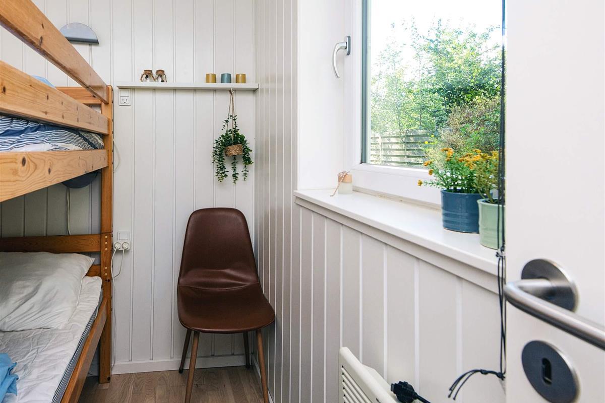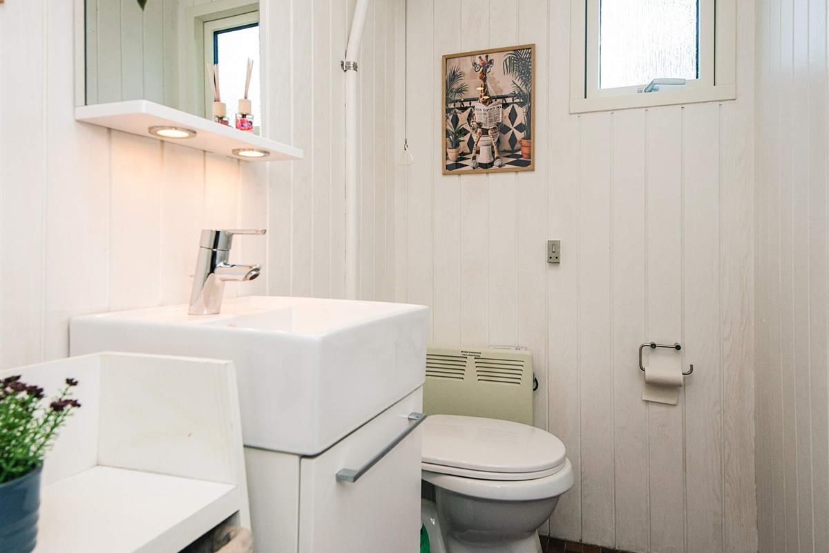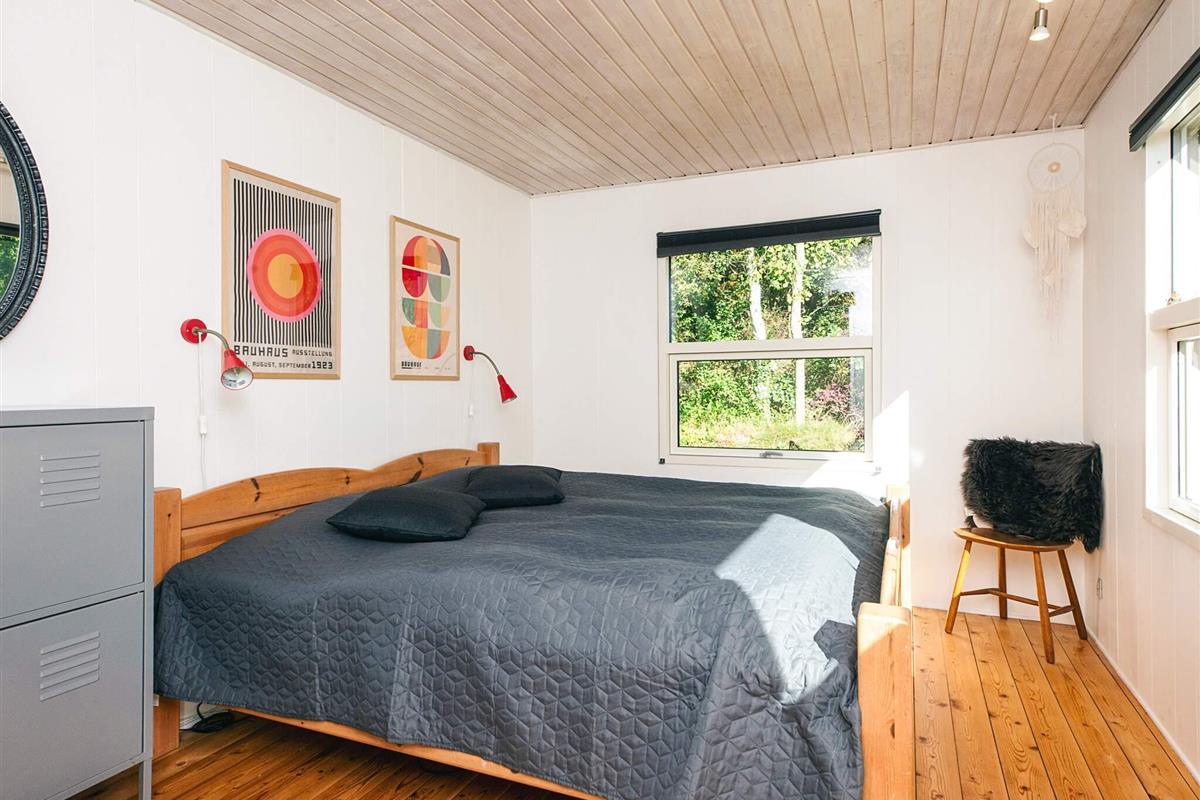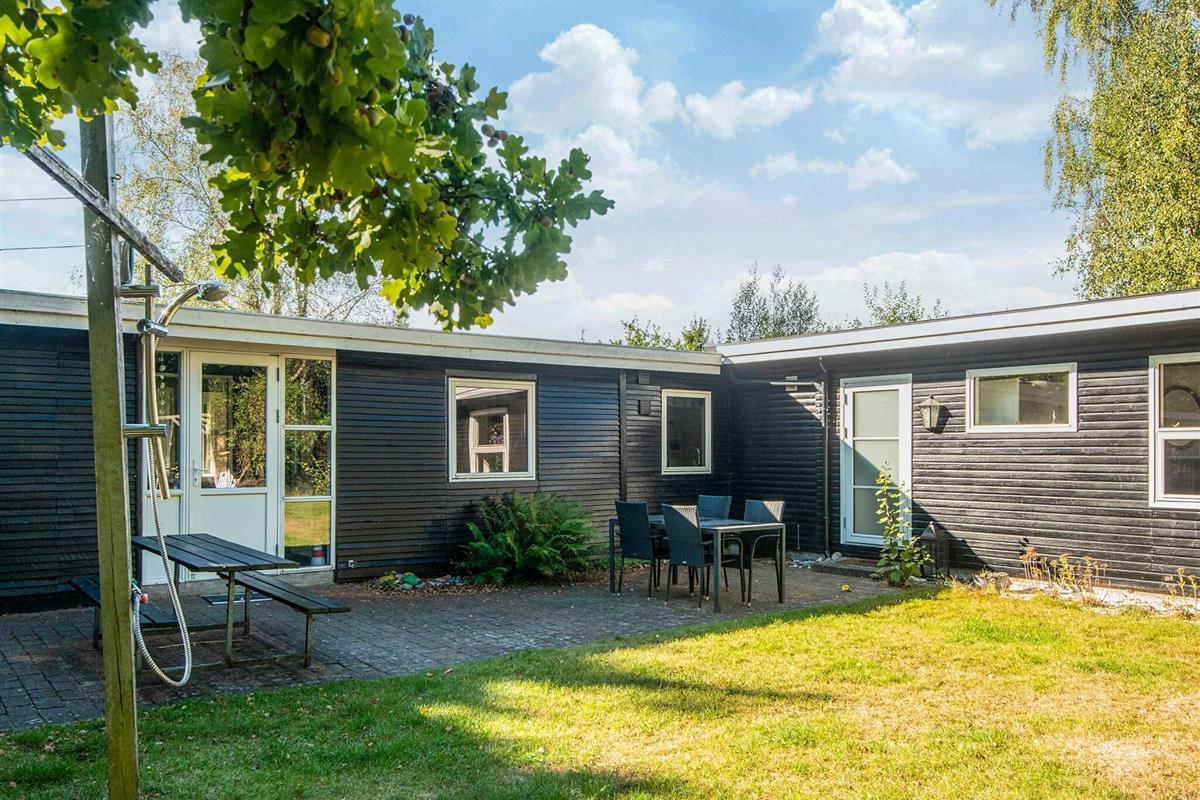 Ferienhaus mit Whirlpool im Bad und attraktiver Lage auf einem 1.355 m2 großen Naturgrundstück bei Fjellerup Strand, auf dem es ein Spielehäuschen sowie Sandkasten und Schaukelgerüst mit Rutsche speziell für die Kleinen gibt.