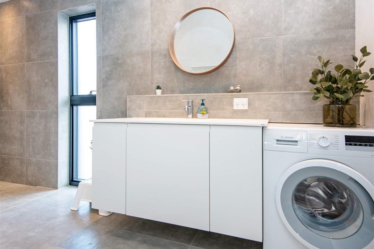 Bad: Waschm., WC, Waschb., Dusche, Fußbodenheiz.