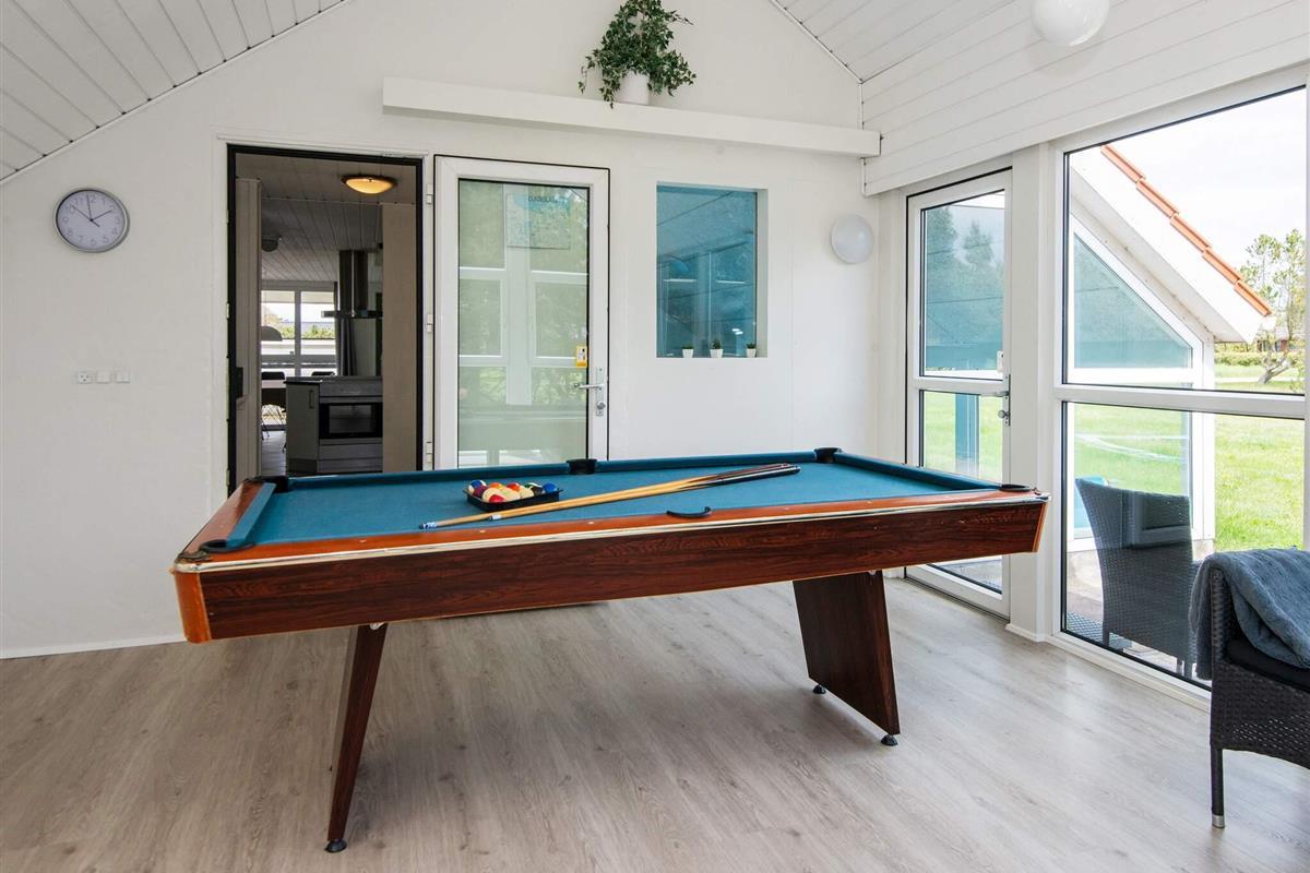 Da sich auf jeder Etage Schlafzimmer, Wohnzimmer und Badezimmer befinden, eignet sich das Haus gut für zwei befreundete Familien. Während das Erdgeschoss mit Fußbodenheizung ausgestattet ist, wird im Obergeschoss mit Elektro-Heizung geheizt. Im Obergeschoss gibt es außerdem einen Balkon. Alle Räume sind in hellen und freundlichen Farben gehalten und die Küche ist gut ausgestattet. Ein Pool-Billardtisch steht zur Verfügung.