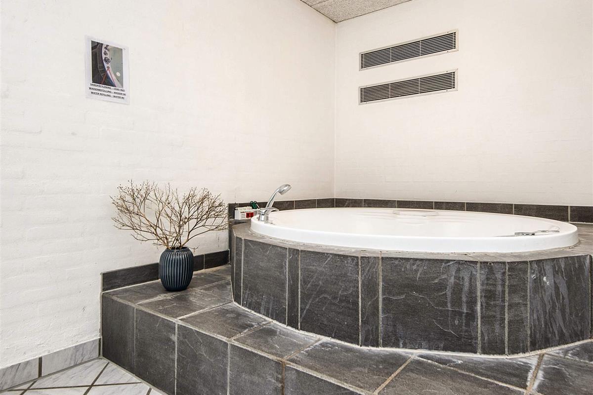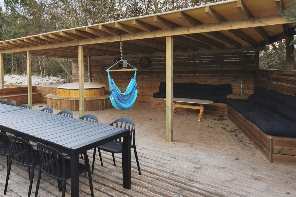 Draußen erwarten Sie drei wunderschöne Terrassen, von denen einige teilweise überdacht sind – ideal für den Morgenkaffee, Sonnenbaden oder gemütliche Grillabende. Unter einer der Überdachungen befindet sich eine stimmungsvolle Bar mit Lounge-Bereich, wo Sie sich zu entspannten Stunden treffen können. Außerdem steht ein einladender Außenwhirlpool bereit, der das Ferienerlebnis perfekt abrundet. Der Garten ist eingezäunt, sodass Kinder sicher spielen oder auf dem Trampolin springen können, während die Erwachsenen den Urlaub in ruhiger Umgebung genießen.