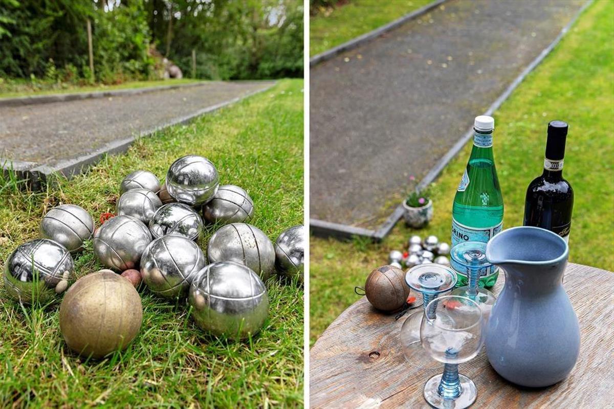 Genieße das Leben im Freien Der schöne Garten des Ferienhauses verfügt über eine Grasfläche, die dazu einlädt, die Gartenstühle von der sonnigen Terrasse zu holen und in den kühlen Schatten der Bäume zu stellen. Die Grasfläche ist groß und eignet sich hervorragend für verschiedenste Gartenspiele wie z. B. Pétanque auf der neu angelegten Bahn, mit der gesamten Familie. Ihre kleineren Kinder dürfen sich auf eine Schaukel freuen. Der hauseigene Grill verspricht viele schöne Abende in geselliger Runde.