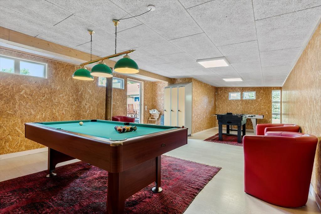 Die gut ausgestattete Küche ist praktisch eingerichtet und lediglich durch eine halbhohe Mauer vom Wohnraum getrennt. Dadurch genießt du selbst während der Zubereitung der täglichen Mahlzeiten die Nähe und Gesellschaft deiner Lieben, die sich im Wohnraum tummeln. Nach langen, erlebnisreichen Tagen versprechen der Whirlpool und die Sauna im Badezimmer wohltuende Momente mit einem Hauch von Wellnessflair. Im Gäste-WC stehen praktischerweise eine Waschmaschine und ein Wäschetrockner bereit, sodass sich deine Familie täglich auf frische Handtücher und Badesachen freuen kann. Dein Ferienhaus verfügt über drei Schlafräume mit Doppelbetten und über einen gemütlichen Schlafboden mit zwei Matratzen. Im Nebengebäude ist ein weiterer Schlafraum untergebracht. Gleiches gilt für einen schönen Aktivitätsraum, der im Nu zum beliebten Sammelpunkt aller Mitreisenden avancieren wird. Im Aktivitätsraum stehen ein Billardtisch, ein Airhockeyspiel, ein Tischkicker und eine Dartscheibe bereit. Wie wäre es also mit dem ein oder anderen familieninternen Turnier? Stundenlanger Spaß ist jedenfalls garantiert!
