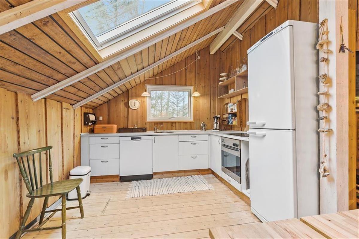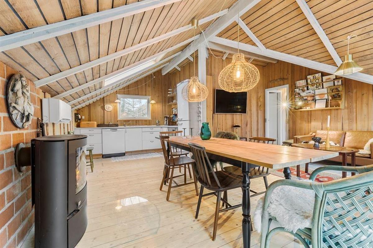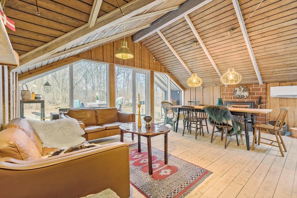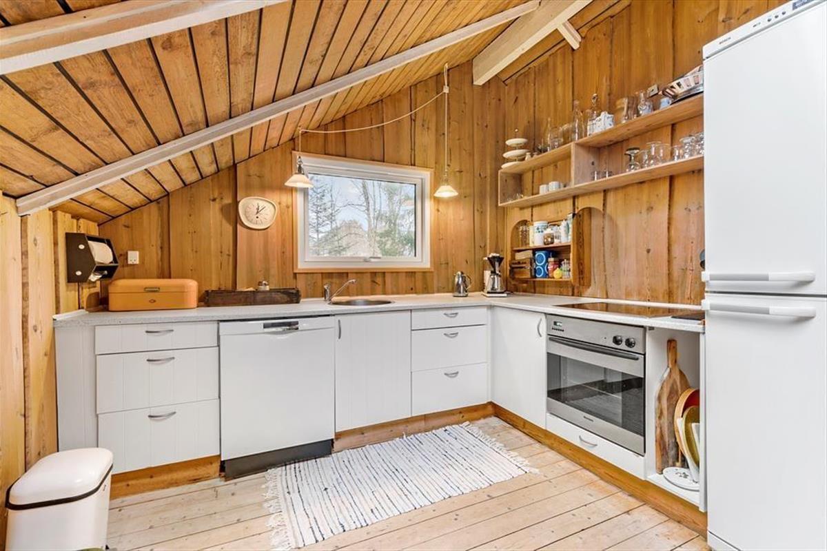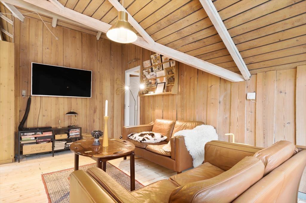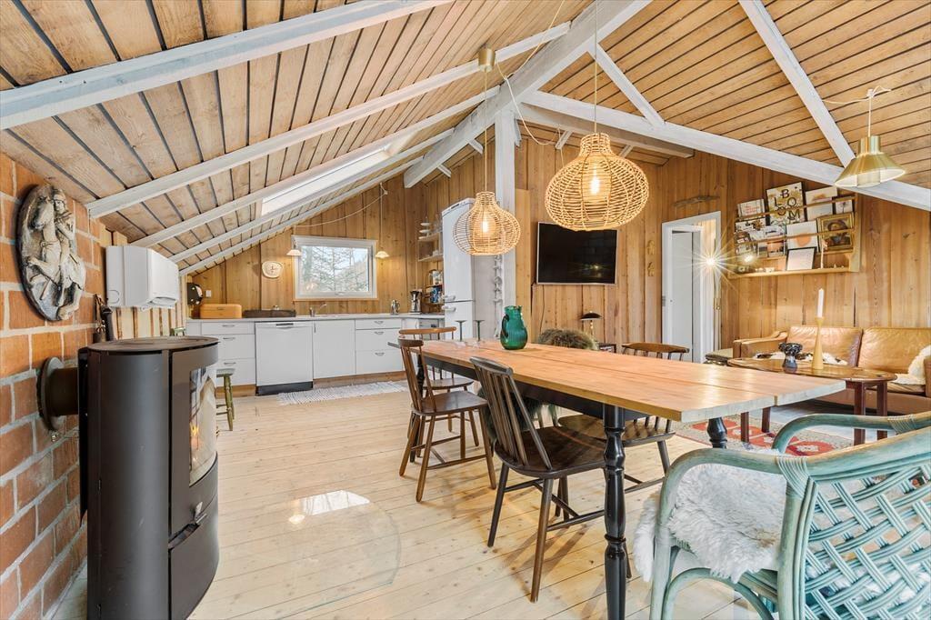 Schließen Sie die Augen und denken Sie zurück an Sommerferien, in denen die Zeit etwas langsamer verging und die Tage von Sonnenstrahlen, Vogelgesang und dem leisen Rauschen des Windes in den Baumwipfeln bestimmt wurden. Dieses Ferienhaus ist eine echte Reise zurück in genau diese Zeit. Ein älteres und charmantes Haus, in dem die Atmosphäre in den Wänden steckt und die klassische Ferienhausstimmung weiterlebt. Holz von Boden bis Decke, sichtbare Balken und ein Dachfenster, das das Tageslicht sanft hereinlässt und die rustikale, authentische Stimmung unterstreicht. Hier ist nichts geschniegelt oder gestriegelt – dafür aber voller Seele. Das Wohnzimmer öffnet sich durch die große Fensterfront mit Terrassentür zur Terrasse und zur Natur, und draußen warten mehrere Ebenen, auf denen Sie ganz leicht Ihren persönlichen Lieblingsplatz in der Sonne oder im Schatten finden.