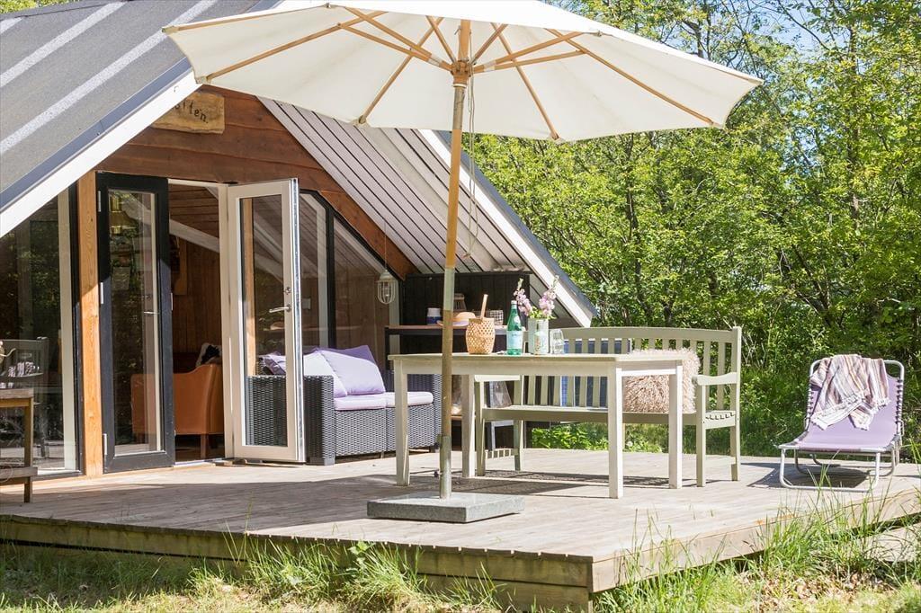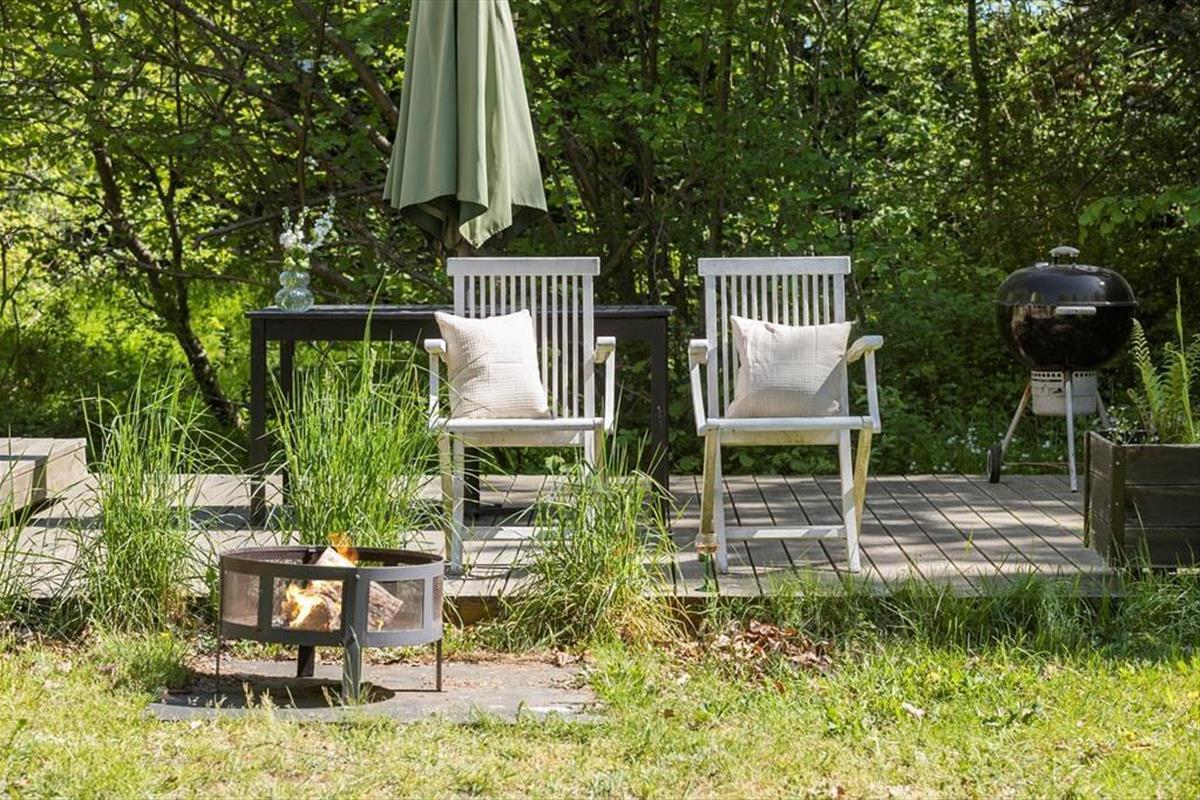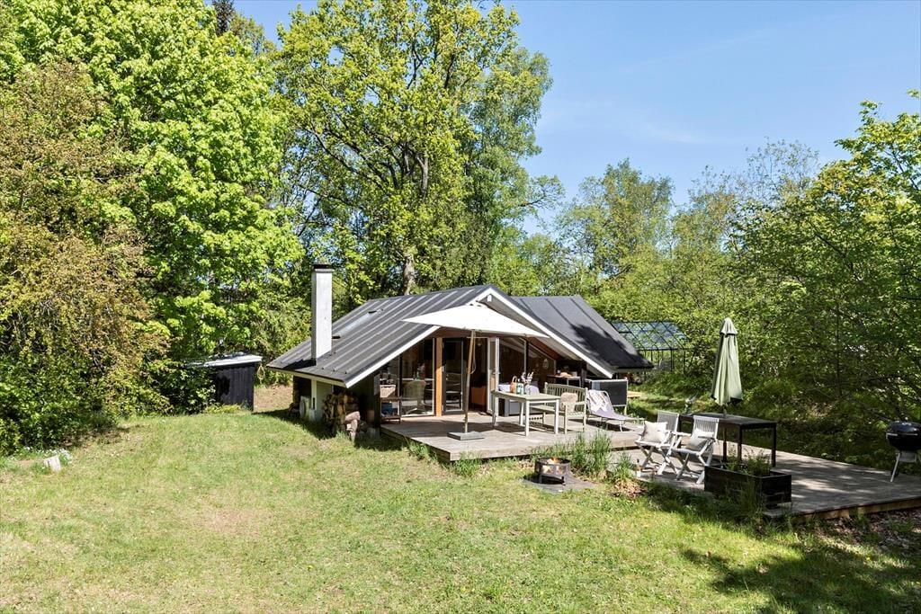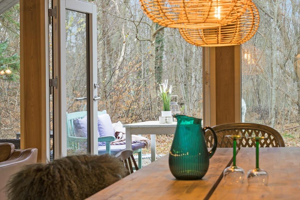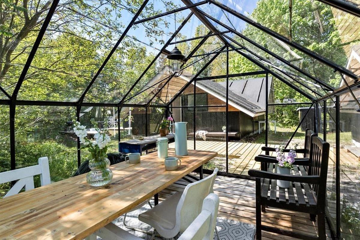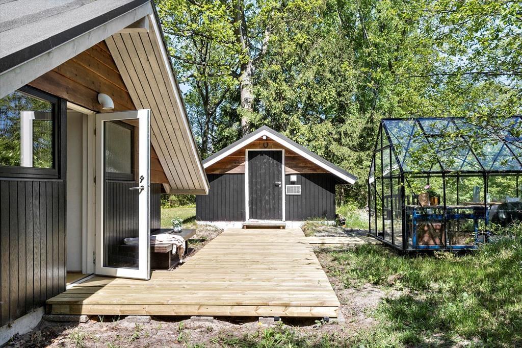 Zurück am Ferienhaus empfängt Sie ein großes, wildes und helles Naturgrundstück, umgeben von hohen, schönen Bäumen, die Ruhe, Windschutz und Privatsphäre bieten. Die Terrassen liegen auf mehreren Ebenen und auf verschiedenen Seiten des Hauses, sodass Sie jederzeit den richtigen Platz finden – ob Sie den Morgenkaffee in der Sonne genießen oder mittags den Schatten suchen. Wenn der Abend hereinbricht, legt sich eine angenehme Ruhe über das Gelände, und Sie können sich zurücklehnen, begleitet vom Zirpen der Grillen, dem leisen Knistern des Grills und dieser ganz besonderen Ferienhausstimmung. Das alte Gewächshaus ist das i-Tüpfelchen und ermöglicht es, das Leben im Freien zu verlängern, wenn der Tau fällt oder das Wetter etwas wechselhaft ist. Hier entstehen die perfekten Rahmenbedingungen für lange, stimmungsvolle Abende.