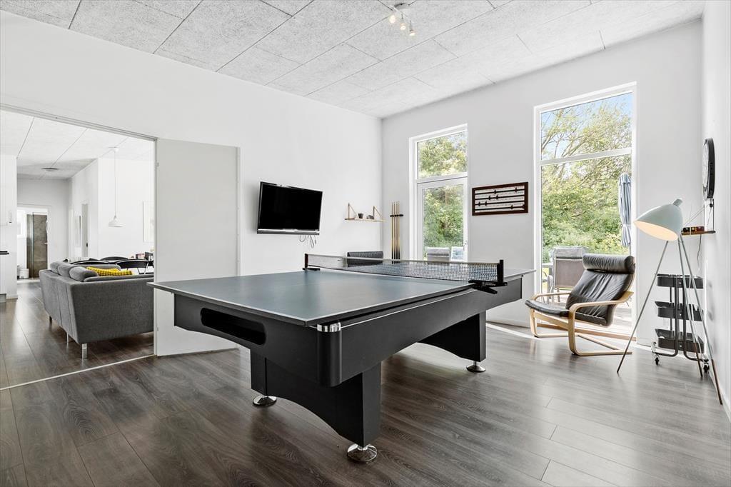 Ein modernes Holzferienhaus aus dem Jahr 2016, das dich, deine Familie und Freunde zum Wohlfühlen einlädt. Beim Betreten des Hauses werdet ihr von einer Geräumigkeit begrüßt, die zeigt, dass dies ein Haus ist, in dem ihr gerne Zeit verbringt. Die Küche und das Wohnzimmer sind offen miteinander verbunden. Hier wird Essen gezaubert und gemütlich gegessen, während die Fernsehecke zu entspannenden Filmstunden und vielleicht einem kleinen Nickerchen einlädt. Wenn der Drang nach Betätigung in den eigenen vier Wänden aufkommt, steht der Aktivitätsraum für euch bereit. Hier könnt ihr euch in spannenden Tischtennis-Matches und intensiven Billard-Turnieren messen. Das Ferienhaus verfügt über fünf Schlafzimmer - vier Zimmer mit zwei Einzelbetten, die zu Doppelbetten zusammengeschoben werden können, und ein Etagenzimmer mit vier Etagenbetten, perfekt für die Kinder und diejenigen unter euch, die sich noch jung genug fühlen, um in das obere Etagenbett zu klettern. Abgerundet wird das Hausinnere durch zwei moderne Bäder, von denen eines mit einem schönen Whirlpool ausgestattet ist, in dem ihr euch herrlich entspannen könnt.