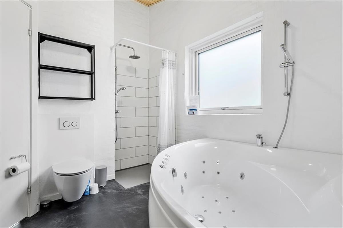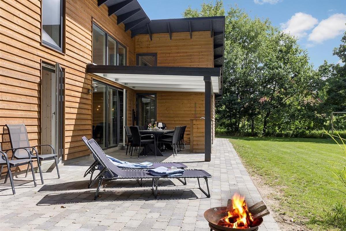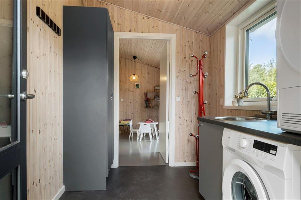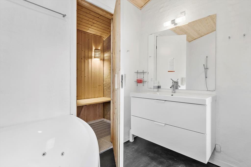 Ein modernes Ferienhaus aus dem Jahr 2022 - die Inneneinrichtung und die Raumaufteilung sind gut durchdacht und strahlen skandinavische Gemütlichkeit und Funktionalität aus. Die schönen Epoxidböden und die hohen Decken schaffen eine helle und geräumige Atmosphäre. Du wirst von einem praktischen Hauswirtschaftsraum empfangen, in dem ihr euren Kinderwagen für die Nacht unterstellen könnt. Das Herzstück des Hauses ist der große Gemeinschaftsraum, in dem sich Wohnzimmer, Küche, Familienzimmer und Kinderspielbereich vereinen. Hier können alle zusammen und für sich alleine sein. Der Kaminofen in der Ecke verbreitet Wärme und Gemütlichkeit, und durch die Terrassentür im Wohnzimmer gelangt ihr auf die Terrasse und in den Garten. Vier der fünf gemütlichen Schlafzimmer sind mit Doppelbetten und das vierte mit einem Etagenbett ausgestattet. Es gibt außerdem zwei schöne Bäder - eines davon mit Whirlpool und Sauna. Genießt ein entspannendes Bad im Whirlpool und lasst die Seele baumeln, oder wärmt euch an einem kalten Herbsttag in der Sauna auf.