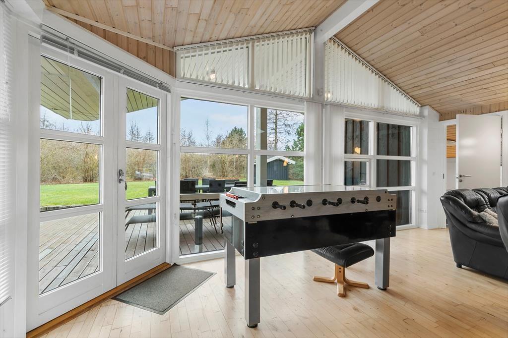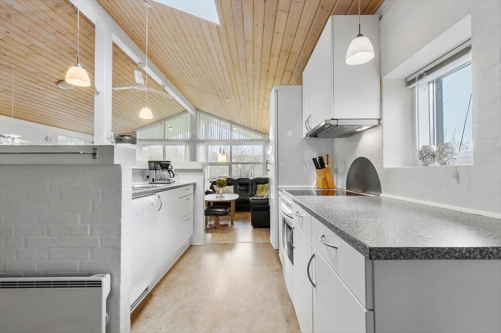 Dieses helle, einladende Ferienhaus mit hohen Decken bildet eine schöne Basis für einen Urlaub, bei dem das wertvolle Beisammensein im Vordergrund steht. Die offene Küche ist lediglich durch eine halbhohe Mauer vom Wohn- und Essbereich getrennt. Dadurch genießt du selbst während der Zubereitung der Mahlzeiten die Nähe und Gesellschaft deiner Lieben, die sich mit ihrem Lieblingsgetränk auf den Polstersitzmöbeln im Wohnraum entspannen oder die ein oder andere interne Meisterschaft am Tischkicker ausfechten. Allabendlich kannst du es dir mit einem spannenden Buch gemütlich machen oder mit deinen Lieben am Esstisch Gesellschaftsspiele spielen. Untermalt werden eure Abende vom behaglich knisternden Feuer im Kaminofen. Vor dem Kaminofen befindet sich ein Gitter, das die kleinsten Urlauber vor Verbrennungen schützt. Vom Wohnraum gelangst du hinaus auf die schöne Terrasse und in den ansprechenden Garten. Drei der Schlafräume begrüßen dich mit je einem Doppelbett. Im vierten Raum stehen zwei Einzelbetten bereit. Bei Bedarf bietet der Schlafboden zusätzliche Übernachtungsmöglichkeiten. Eines der beiden Badezimmer lädt mit seinem Whirlpool und seiner Sauna zu traumhaft erholsamen Momenten mit einem Hauch von Wellnessflair ein. Eine Waschmaschine ist vorhanden.