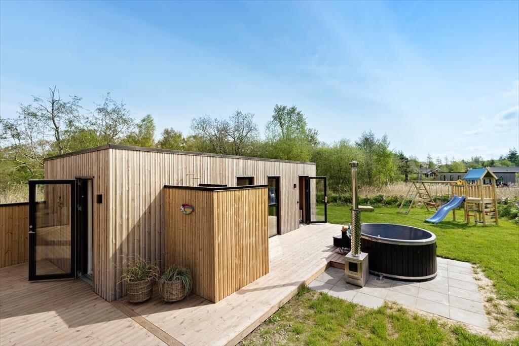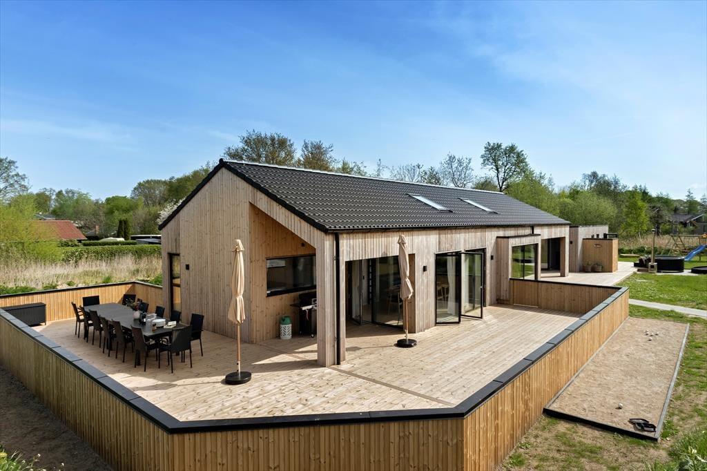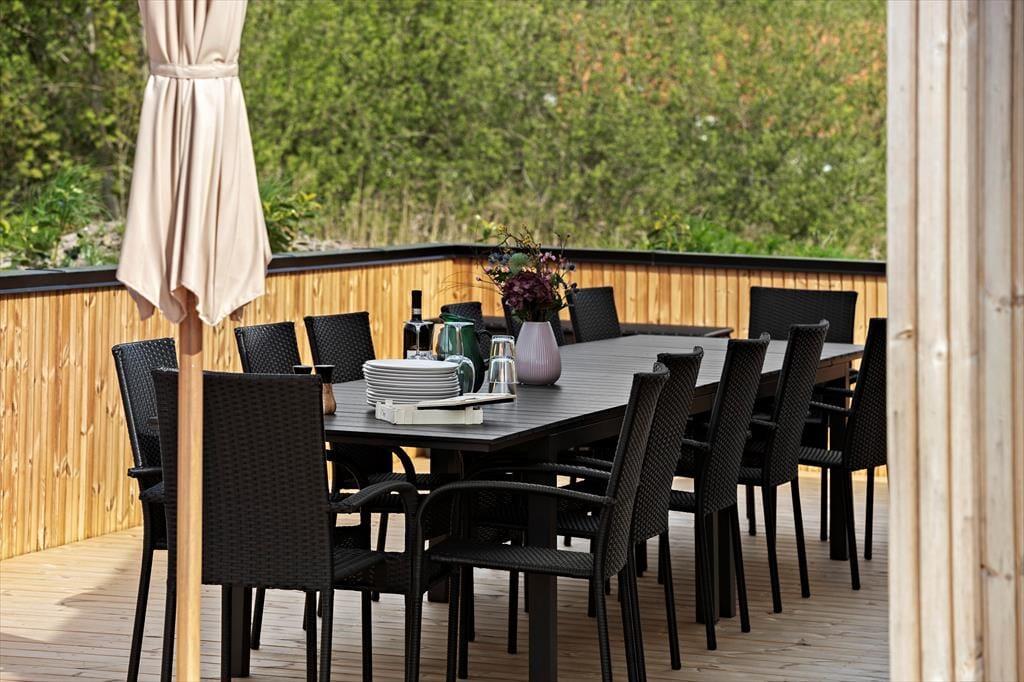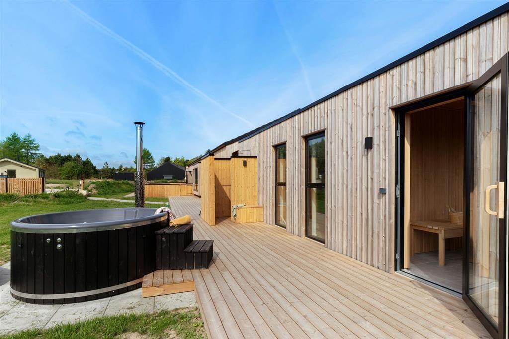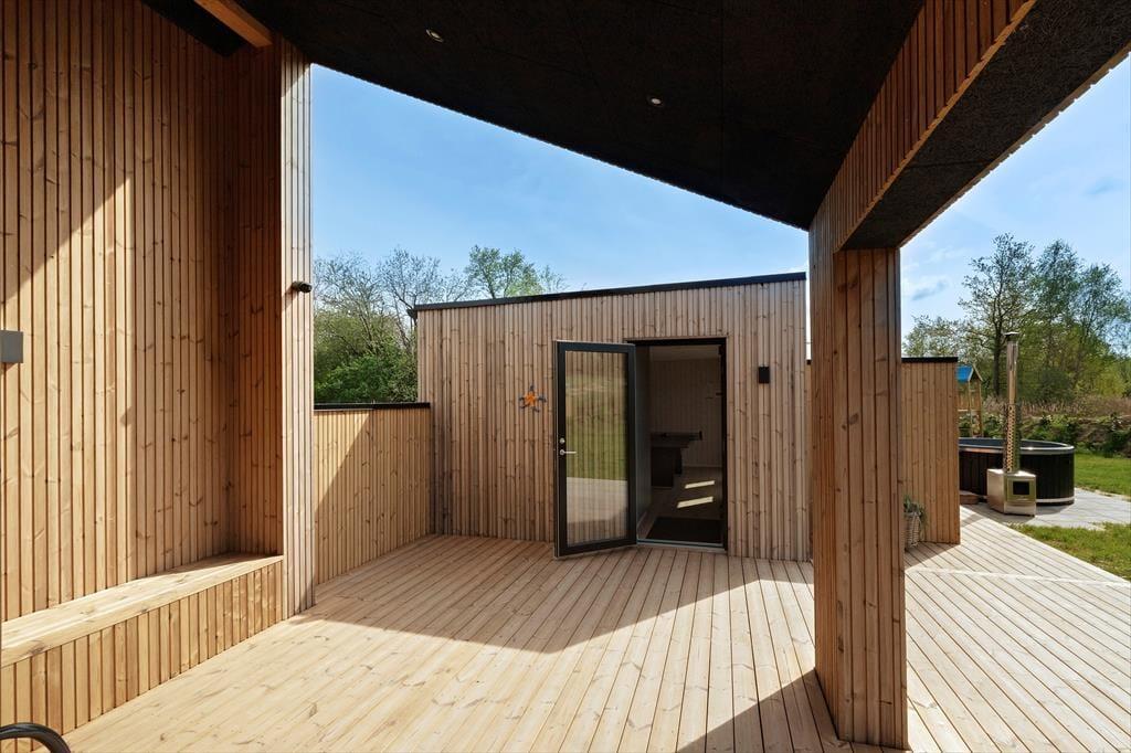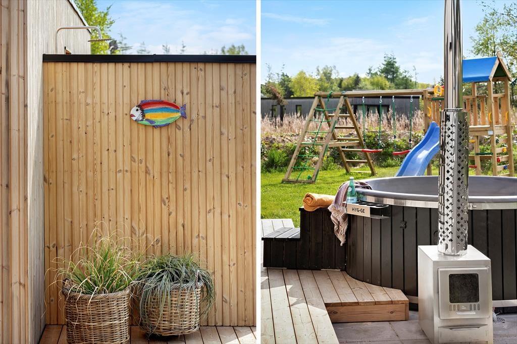 Die Außenbereiche deines Ferienhauses sind einfach fantastisch. Die große, geschlossene Holzterrasse erweist sich als sichere und sonnenverwöhnte Oase, in der kleine Kinder und Hunde frei und unbekümmert spielen können. Es bietet sich ausreichend Platz für stimmungsvolle Grillabende, ausgedehnte Sonnenbäder auf dem Liegestuhl und gemütliche Frühstücke in der Morgensonne. Die Terrasse setzt sich in eleganter Weise zwischen dem Haupthaus und dem Nebengebäude fort und umrahmt auch die Sauna und die Schwedische Badetonne - perfekt, um in die Badesachen zu schlüpfen und Wellness unter freiem Himmel zu genießen.