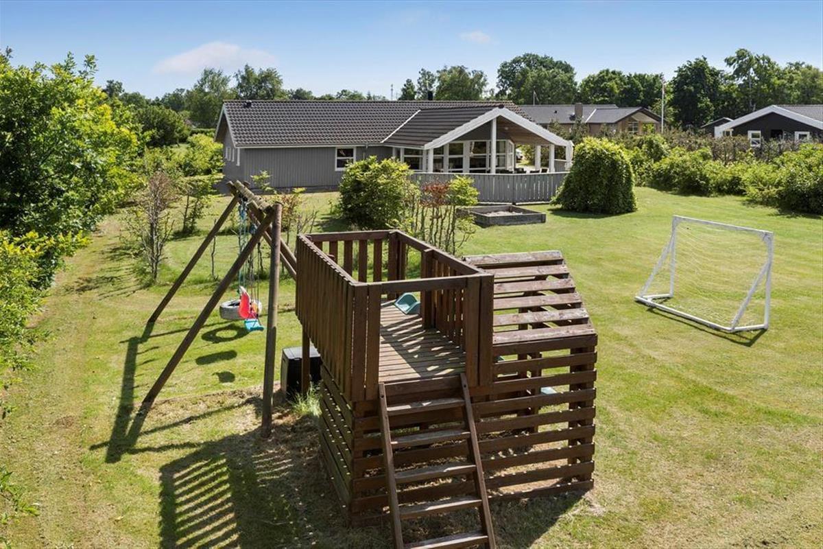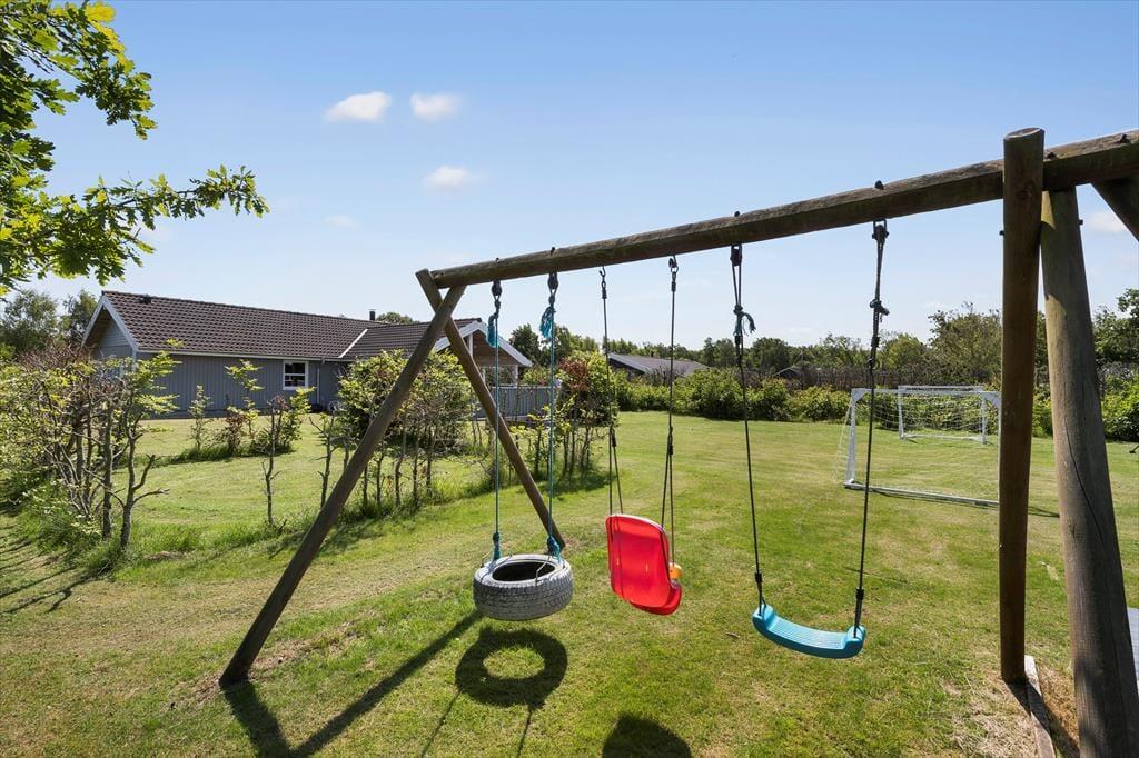 Das ebene, offenen Grundstück bietet freie Entfaltungsmöglichkeiten und viel Platz. Die große Grasfläche eignet sich bestens zum Spielen und Umhertollen aber auch für das ein oder andere ruhige Stündchen auf dem Liegestuhl. Deine Kinder dürfen sich auf ein Spielgerüst mit Schaukeln, eine Sandkiste und Klettermöglichkeiten freuen. Oder wie wäre es mit einem familieninternen Fußballturnier? Tore sind jedenfalls vorhanden. An die Südwestseite des Ferienhauses schließt eine schöne Grillterrasse, die im Nu zum beliebten Sammelpunkt aller Mitreisenden avancieren wird. Auf dieser Terrasse kannst du wunderbar das Abendessen auf dem Grill zubereiten und gleichzeitig ein Auge auf deine Kinder und euren Hund werfen, die zusammen auf der Rasenfläche spielen. Bis in die Abendstunden wirst du auf dieser Terrasse mit Sonne verwöhnt. Für eine ruhige Stunde am Morgen bietet sich die gemütliche Morgenterrasse an der Ostseite des Hauses an. Sie ist von der Küche aus zugänglich und eignet sich bestens für einen frischen Becher Kaffee im Licht der aufgehenden Sonne.