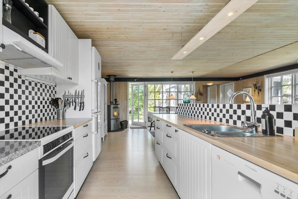 Willkommen in deinem Holzferienhaus, bei dem dich schönste Urlaubsstimmung überkommt, sobald du die Gartenpforte öffnest. Unmittelbar nach dem ersten Betreten des Hauses stellst du fest, dass dieses Mietobjekt mit viel Liebe und Bedacht instand gesetzt wurde. Jede einzelne Leiste, jede Oberfläche und jedes Detail zeugen von gutem Geschmack des Eigentümers. Herzstück deines Mietobjektes ist die große, helle Kombination aus Wohnraum, Küche und Essbereich. In diesem Raum bietet sich viel Platz für gemütliche Morgenstunden mit dem Duft frisch gebrühten Kaffees und frischgebackener Brötchen, die von einem hübschen Tageslichteinfall wunderschön untermalt werden. Von der Küche aus gelangst du hinaus in einen kleinen Küchengarten, in dem du dich mit frischen Kräutern für die Zubereitung des Abendessens eindecken kannst. Vom Wohnraum aus trittst du hinaus auf eine Sonnenterrasse, die sich zusammen mit den anderen Außenbereichen zu einem großem, gemütlichen Terrassenareal zusammenfügt, das nahezu das gesamte Ferienhaus umgibt.