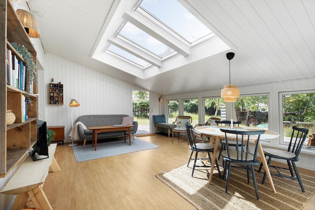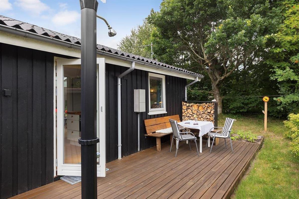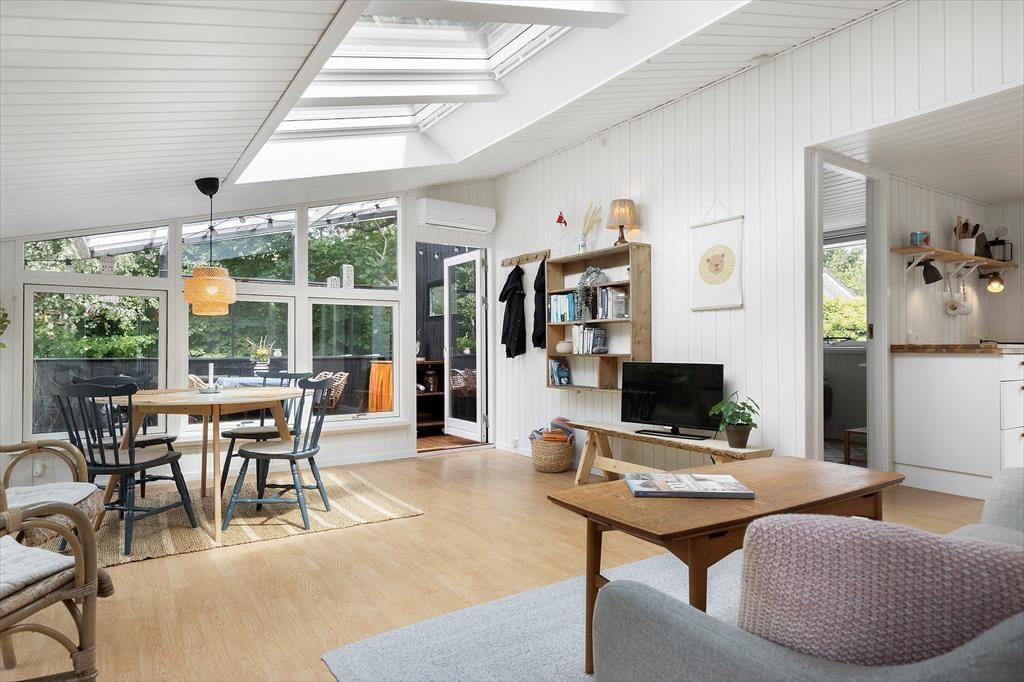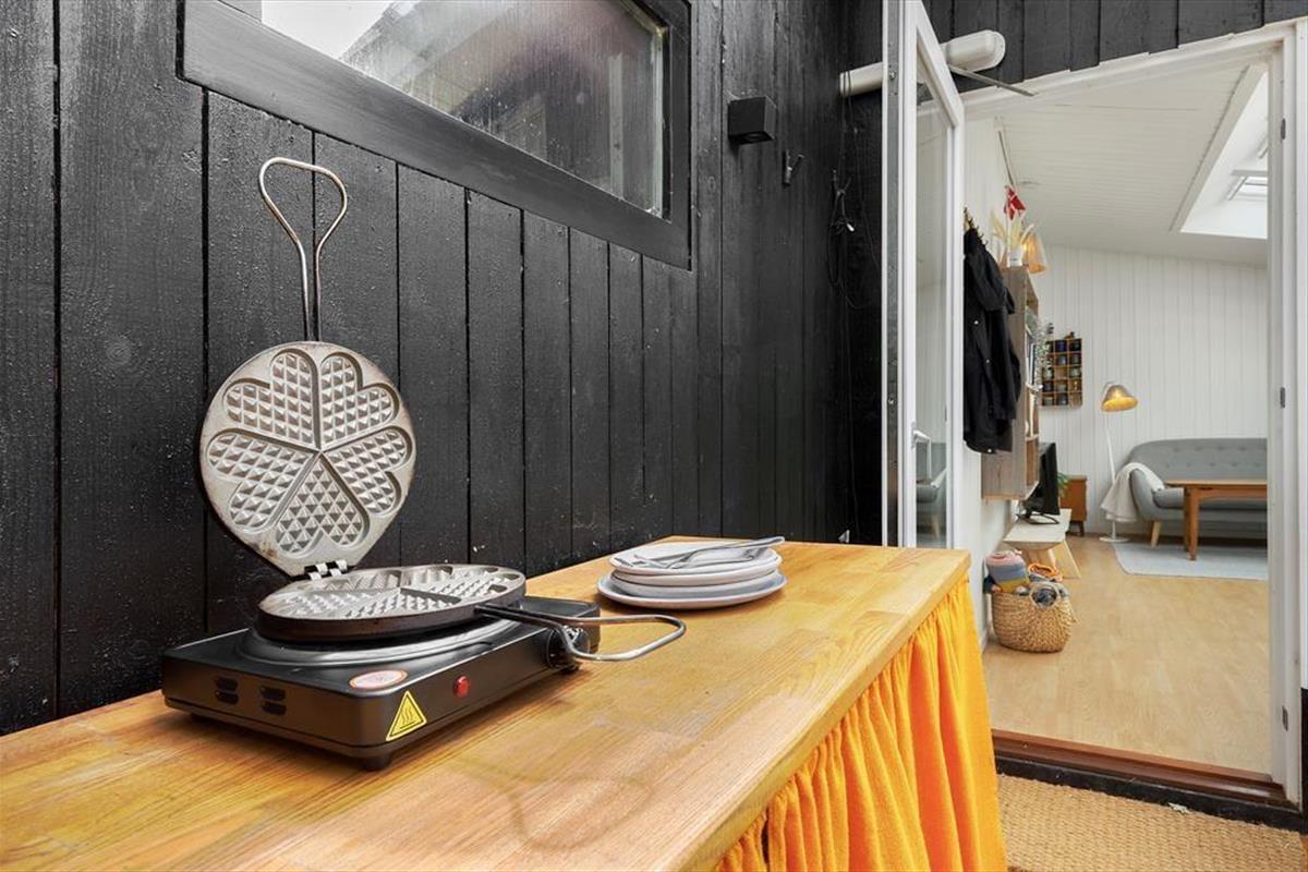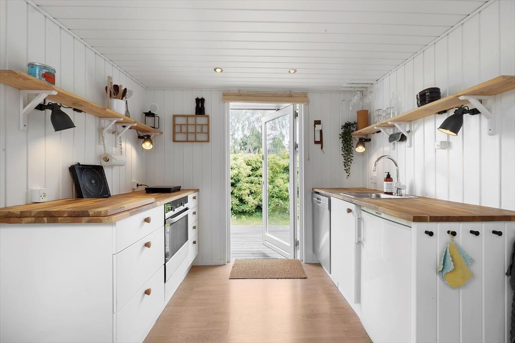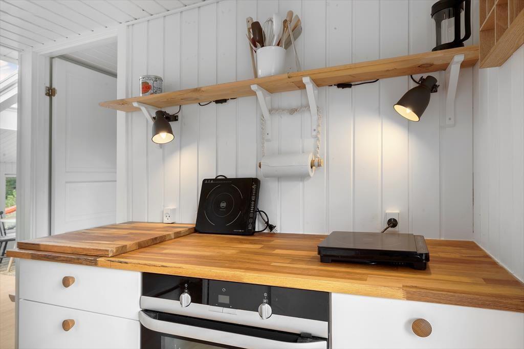 Viel Licht fällt durch die schönen Dachflächenfenster des Wohnraums und unterstreicht die schöne, leichte Ferienhausatmosphäre. Das Urlaubsdomizil wurde liebevoll instand gesetzt. Dabei wurde nicht an schönen Details und kreativen Lösungen gespart, zu denen beispielsweise die von der Decke herabhängenden Weingläser zählen. Die Küche präsentiert sich gemütlich und ansprechend. Sie verfügt über einen Geschirrspüler und drei transportable Kochplatten - zwei Induktionskochplatten und eine Cerankochplatte - die du wunderbar mit hinaus auf die überdachte Terrasse nehmen kannst, um dort die Mahlzeiten zuzubereiten oder Waffeln zu backen. Von der Küche gelangst du durch eine Tür hinaus auf eine herrliche Morgenterrasse, die sich bestens für einen frischen Becher Kaffee in den ruhigen, friedvollen Morgenstunden anbietet. Dein Ferienhaus bietet zwei Schlafräume; in dem einem steht ein Doppelbett und in dem anderen Zimmer steht ein großes Bett bereit, in dem die jüngsten Urlauber sicher neben den Eltern schlafen können. Praktischerweise ist das Duschbadezimmer deines Ferienhauses mit einer Waschmaschine versehen, dank der du dir unnötig viel Reisegepäck ersparen kannst.