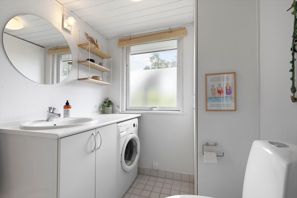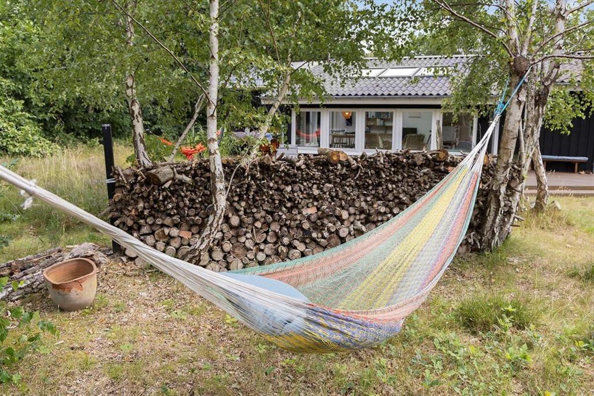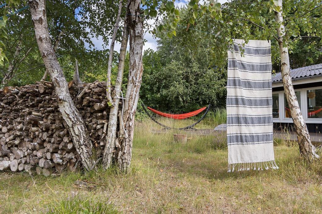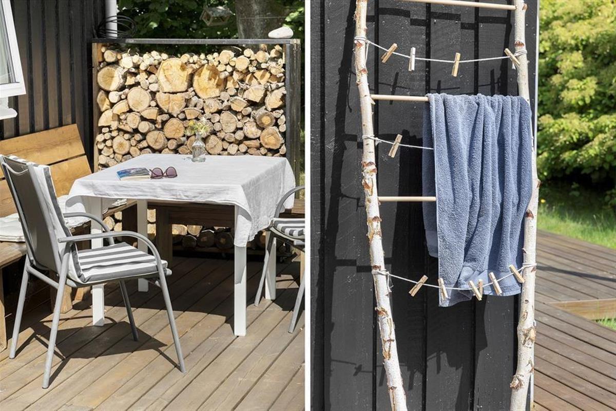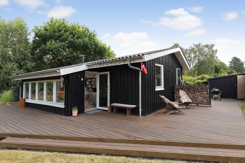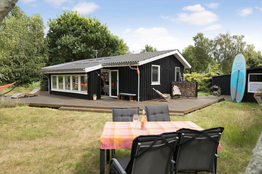 Viel Licht fällt durch die schönen Dachflächenfenster des Wohnraums und unterstreicht die schöne, leichte Ferienhausatmosphäre. Das Urlaubsdomizil wurde liebevoll instand gesetzt. Dabei wurde nicht an schönen Details und kreativen Lösungen gespart, zu denen beispielsweise die von der Decke herabhängenden Weingläser zählen. Die Küche präsentiert sich gemütlich und ansprechend. Sie verfügt über einen Geschirrspüler und drei transportable Kochplatten - zwei Induktionskochplatten und eine Cerankochplatte - die du wunderbar mit hinaus auf die überdachte Terrasse nehmen kannst, um dort die Mahlzeiten zuzubereiten oder Waffeln zu backen. Von der Küche gelangst du durch eine Tür hinaus auf eine herrliche Morgenterrasse, die sich bestens für einen frischen Becher Kaffee in den ruhigen, friedvollen Morgenstunden anbietet. Dein Ferienhaus bietet zwei Schlafräume; in dem einem steht ein Doppelbett und in dem anderen Zimmer steht ein großes Bett bereit, in dem die jüngsten Urlauber sicher neben den Eltern schlafen können. Praktischerweise ist das Duschbadezimmer deines Ferienhauses mit einer Waschmaschine versehen, dank der du dir unnötig viel Reisegepäck ersparen kannst.