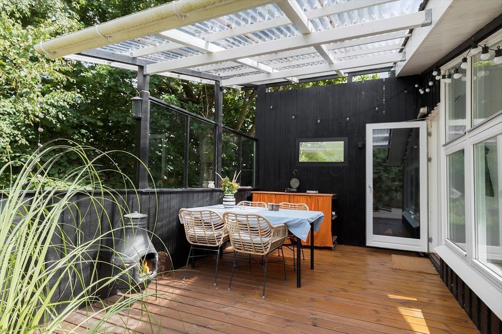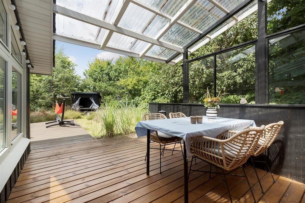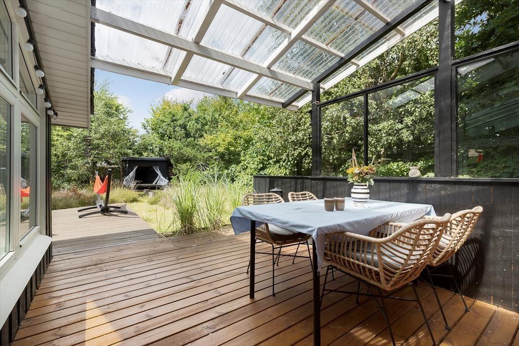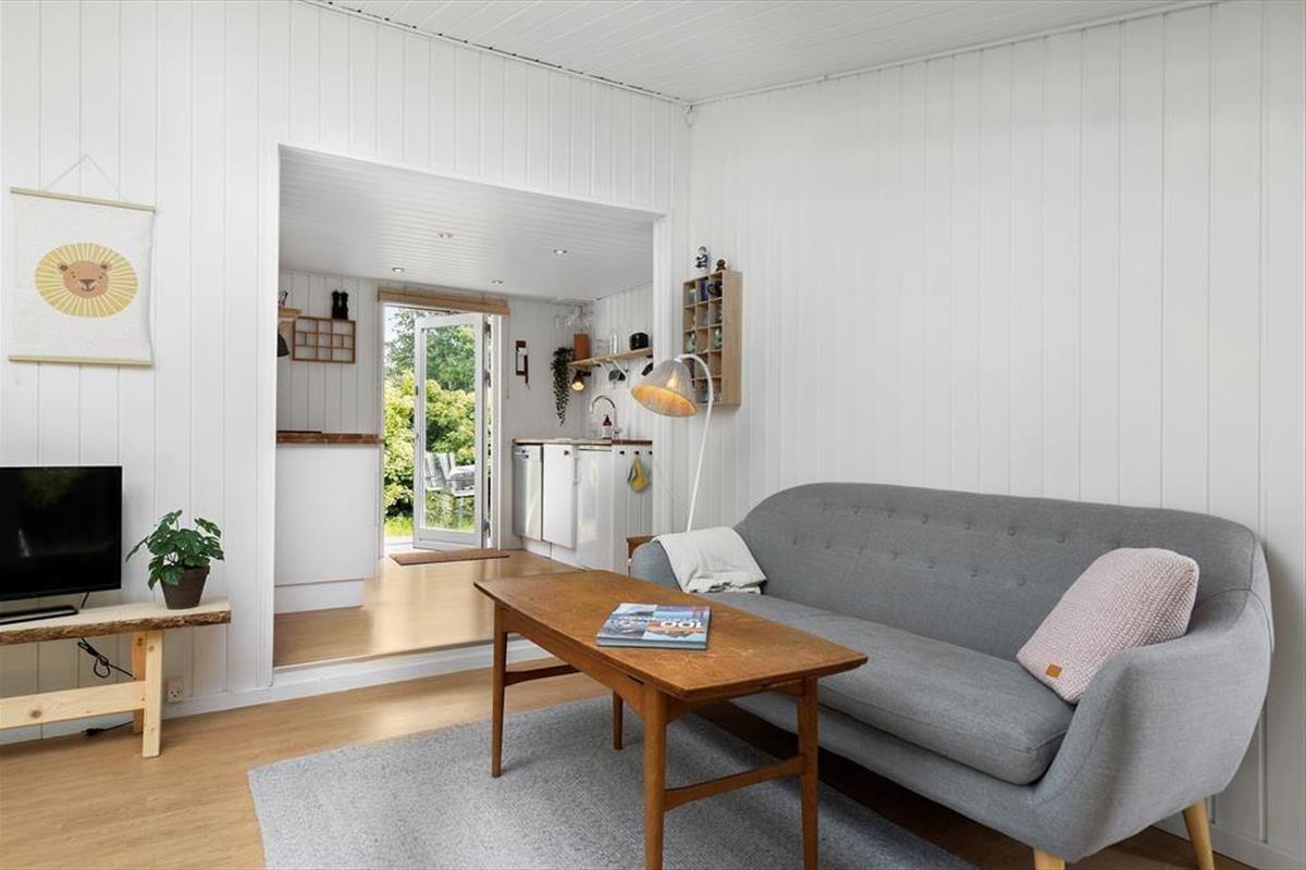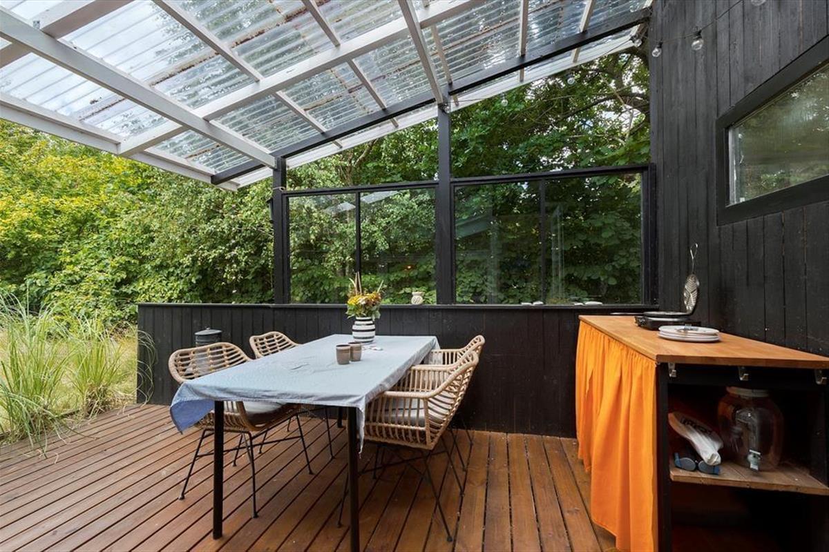 Viel Licht fällt durch die schönen Dachflächenfenster des Wohnraums und unterstreicht die schöne, leichte Ferienhausatmosphäre. Das Urlaubsdomizil wurde liebevoll instand gesetzt. Dabei wurde nicht an schönen Details und kreativen Lösungen gespart, zu denen beispielsweise die von der Decke herabhängenden Weingläser zählen. Die Küche präsentiert sich gemütlich und ansprechend. Sie verfügt über einen Geschirrspüler und drei transportable Kochplatten - zwei Induktionskochplatten und eine Cerankochplatte - die du wunderbar mit hinaus auf die überdachte Terrasse nehmen kannst, um dort die Mahlzeiten zuzubereiten oder Waffeln zu backen. Von der Küche gelangst du durch eine Tür hinaus auf eine herrliche Morgenterrasse, die sich bestens für einen frischen Becher Kaffee in den ruhigen, friedvollen Morgenstunden anbietet. Dein Ferienhaus bietet zwei Schlafräume; in dem einem steht ein Doppelbett und in dem anderen Zimmer steht ein großes Bett bereit, in dem die jüngsten Urlauber sicher neben den Eltern schlafen können. Praktischerweise ist das Duschbadezimmer deines Ferienhauses mit einer Waschmaschine versehen, dank der du dir unnötig viel Reisegepäck ersparen kannst.