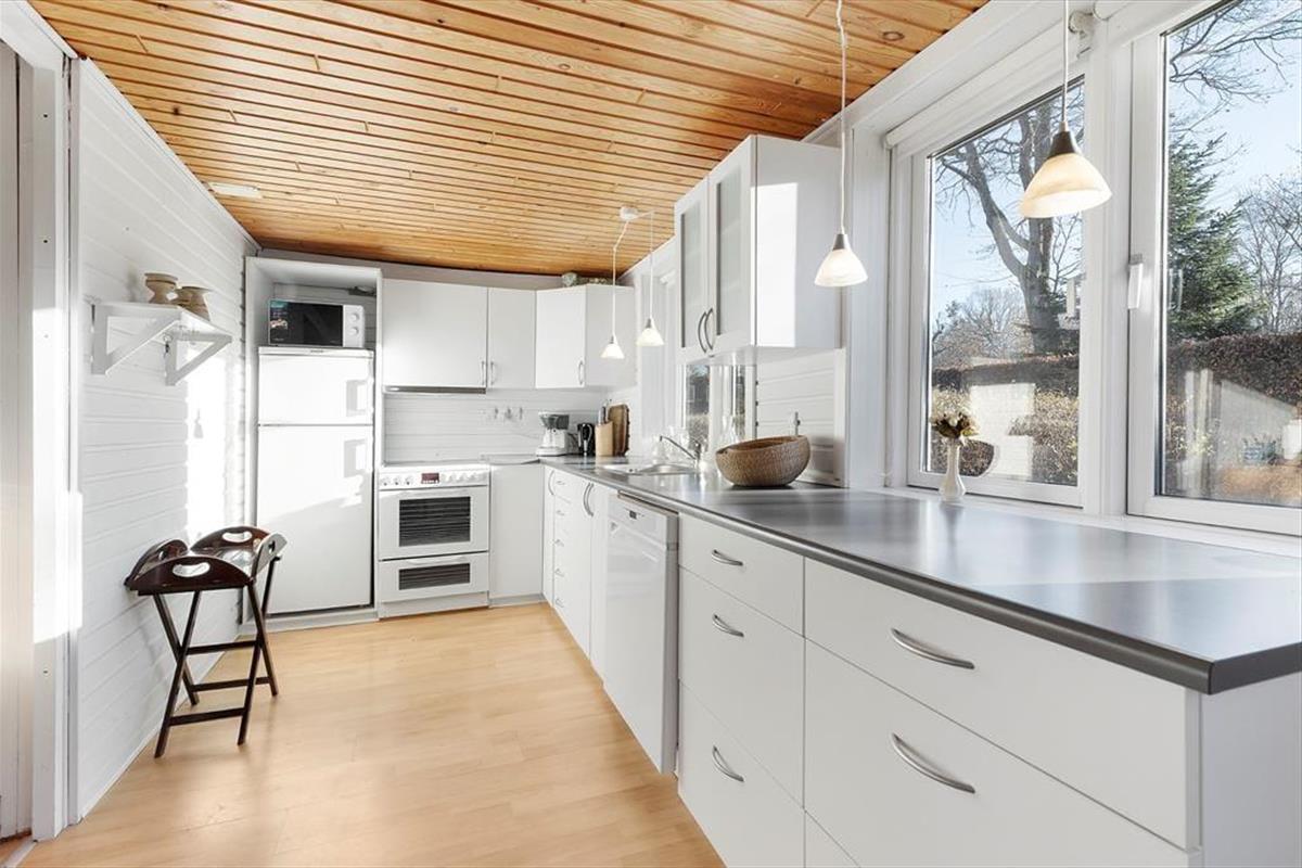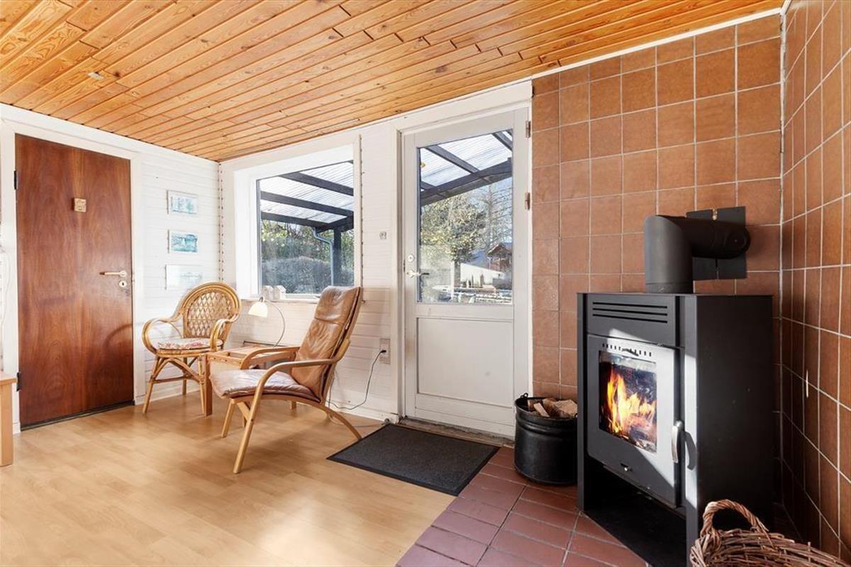 Vakantiehuis in Fjellerup strand og by, Oost-Jutland, met plaats voor 3 volwassenen, 2 kinderen en 2 huisdieren. De woning heeft een gezellig interieur met o.a. een houtkachel, en beschikt daarnaast over een vaatwasser.