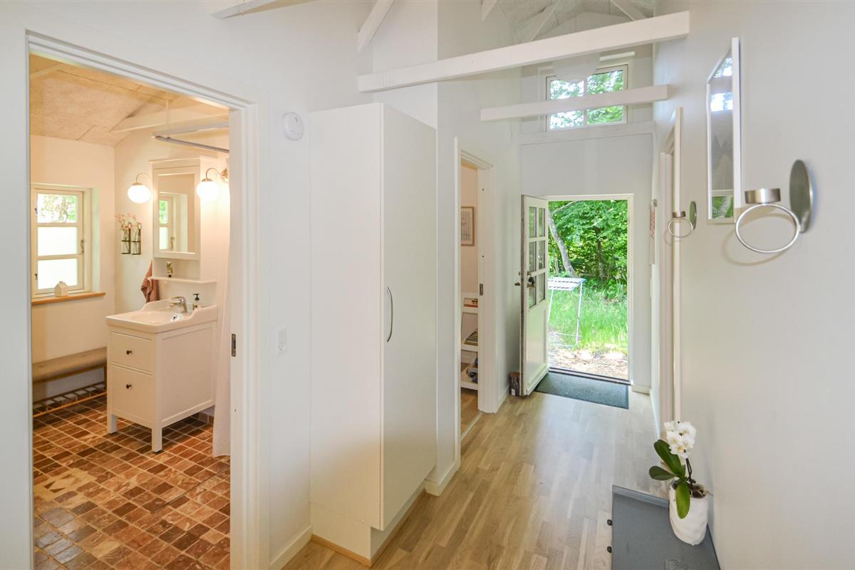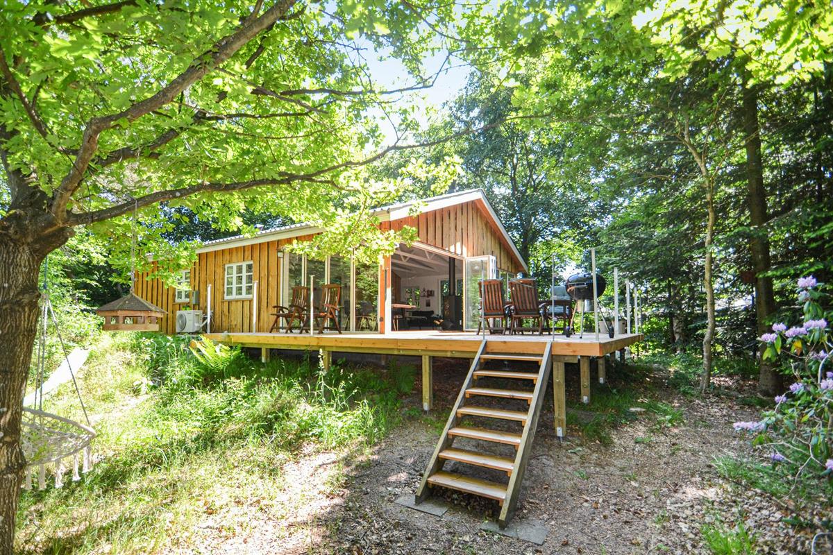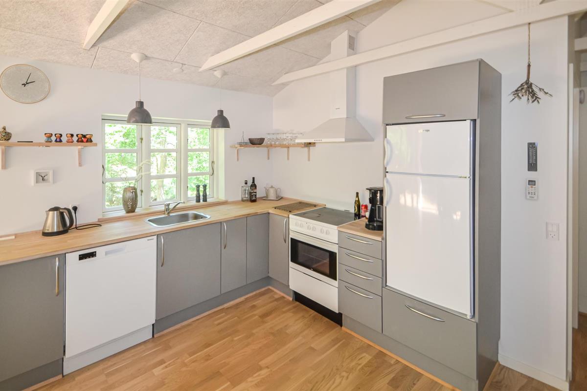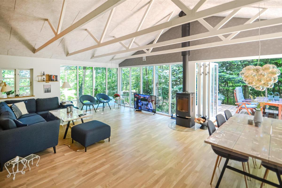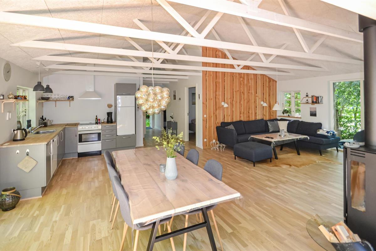 In het oude huisjesgebied in Fjellerup, op een heuvelachtig perceel, is dit huisje omgeven door hoge beukenbomen. Het huis is mooi en licht en heeft een groot terras met trappen naar de woning. Een deel van het grote raamoppervlak in de woonkamer kan worden geopend naar het terras, zodat u bijna het gevoel heeft dat u midden in de prachtige natuur zit. De woonkamer met houtkachel is ongelooflijk gezellig met comfortabele meubels en heeft zichtbare spanten met schuine plafonds die een goed gevoel van ruimte geven. In het verlengde van de woonkamer ligt de eetkamer en de goed uitgeruste keuken. Daarnaast heeft het huis 3 goede slaapkamers en een grote badkamer. Er is ruimte voor 2 auto's om te parkeren op het terrein.