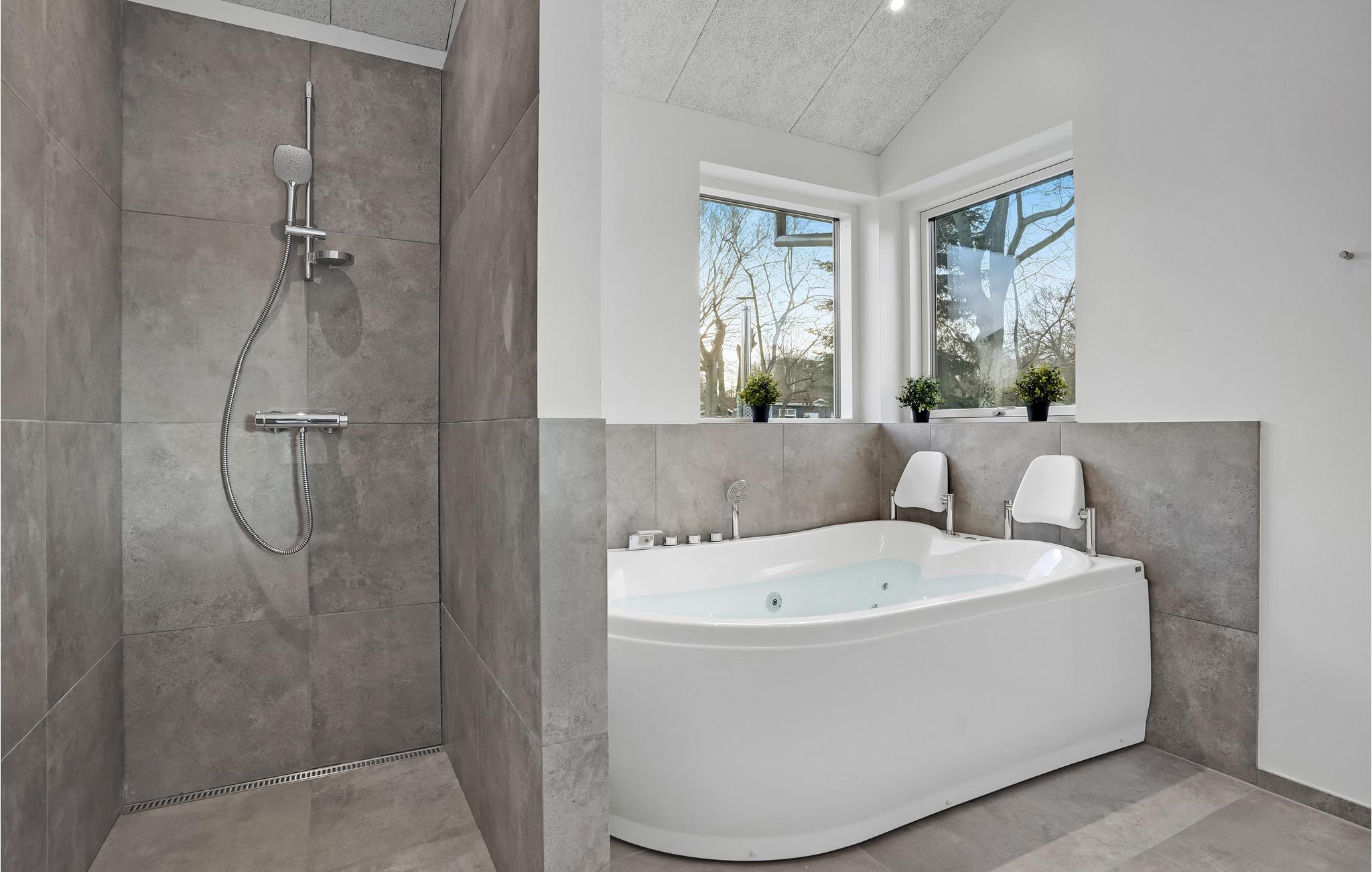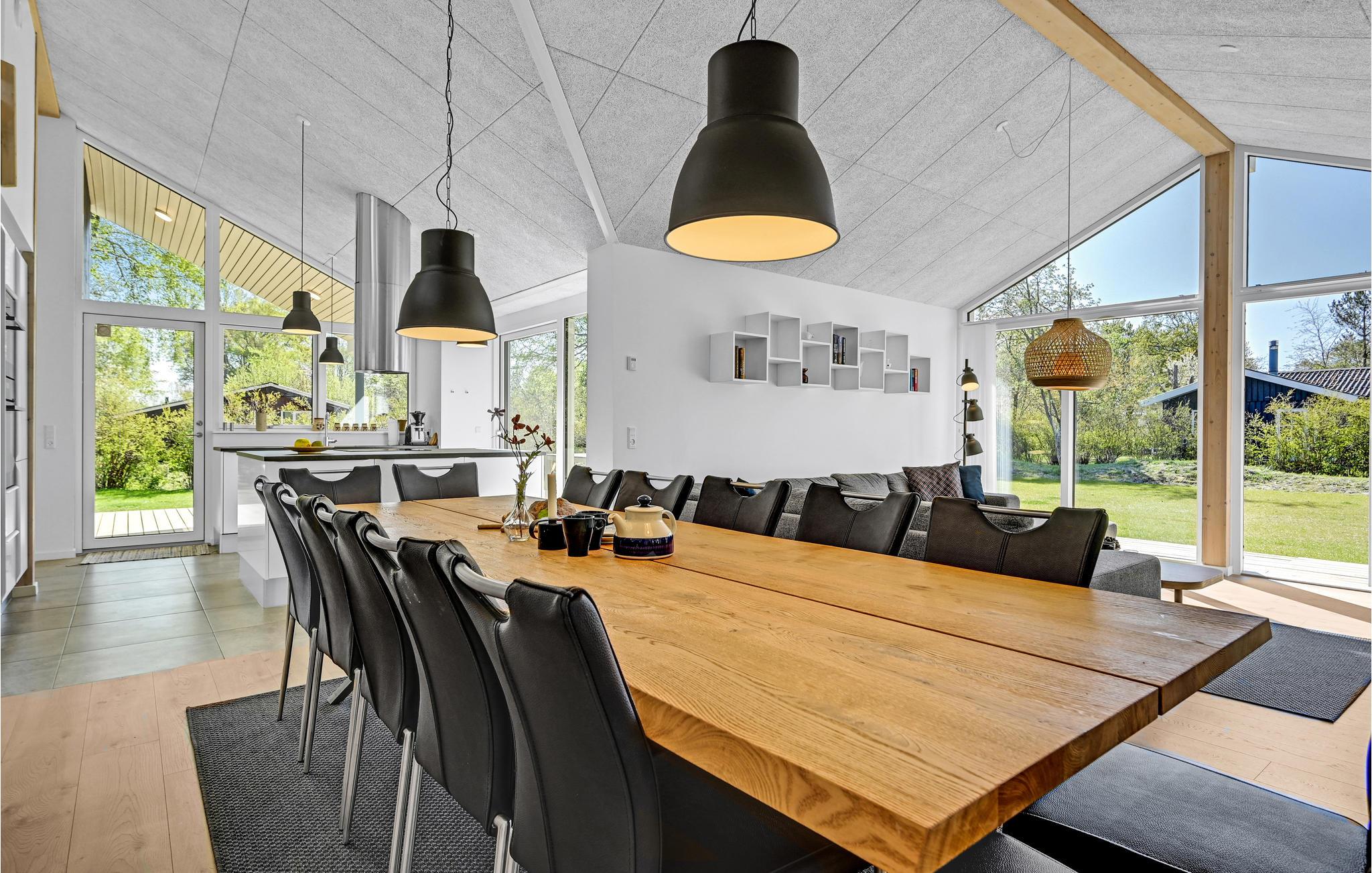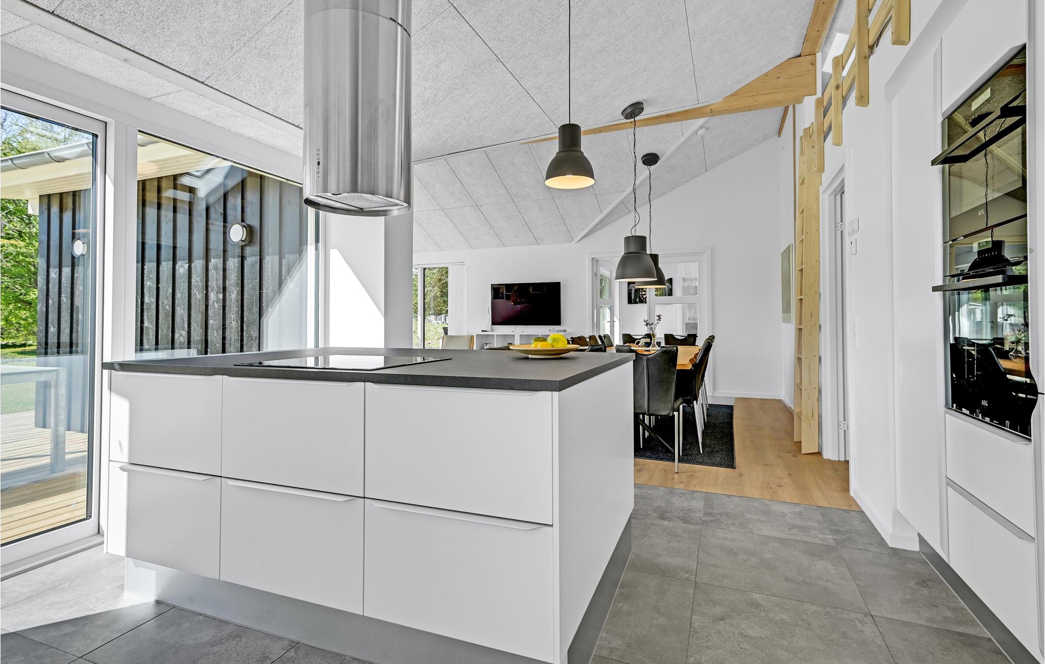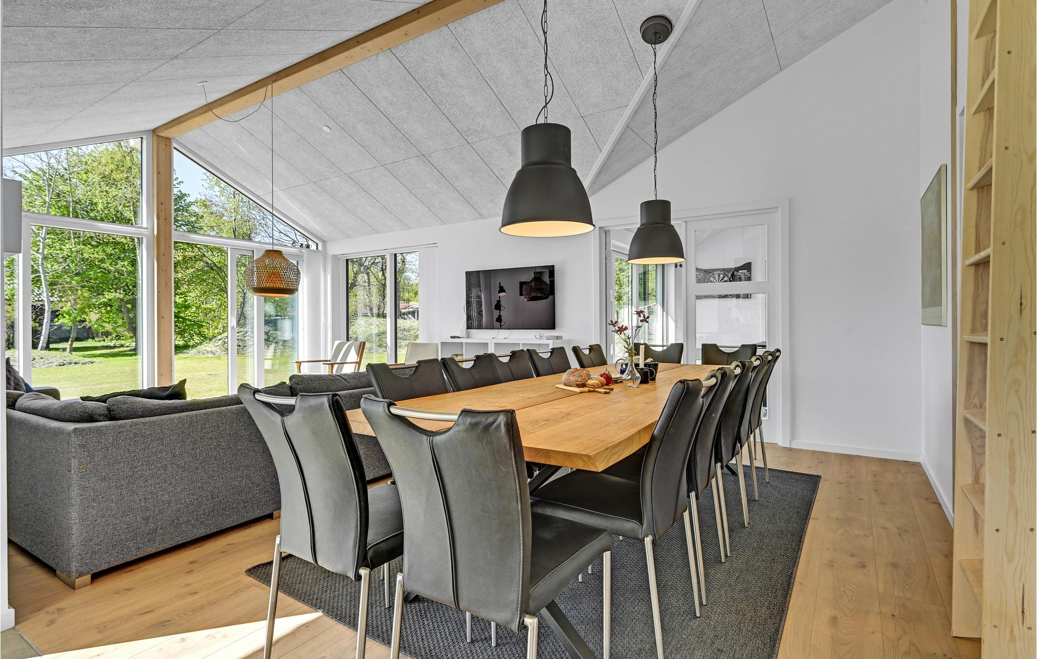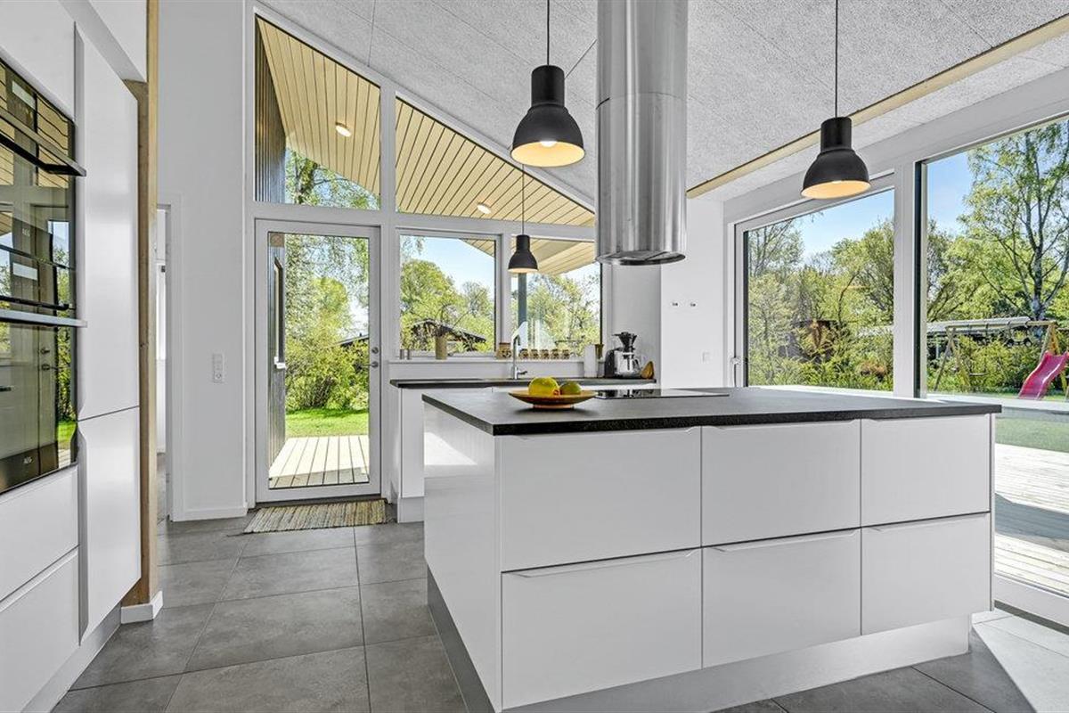 De open keuken in combinatie met de woonkamer maakt vloeiende gesprekken in de hele ruimte mogelijk, wat het geheel nog meer karakter geeft. De speelse schuine plafonds voegen een ander ongewoon tintje toe aan dit moderne vakantiehuis, waardoor de ruimte opener en groter lijkt. Als u door het huis loopt, zult u merken hoe licht het is door de glazen puien, waardoor u misschien denkt dat u helemaal geen kunstlicht nodig hebt, mocht het geen herfst of winter zijn in Denemarken. Bovendien is dit huis perfect in alle temperaturen en weersomstandigheden! U hoeft niet eens na te denken over hoe koud of warm het moet zijn, het binnen- en buitenzwembad zal u en uw metgezel helpen de juiste ontspanning te vinden op uw veranda of in de exclusieve badkamer, net als de aanwezige vloerverwarming.