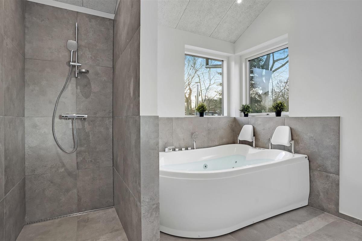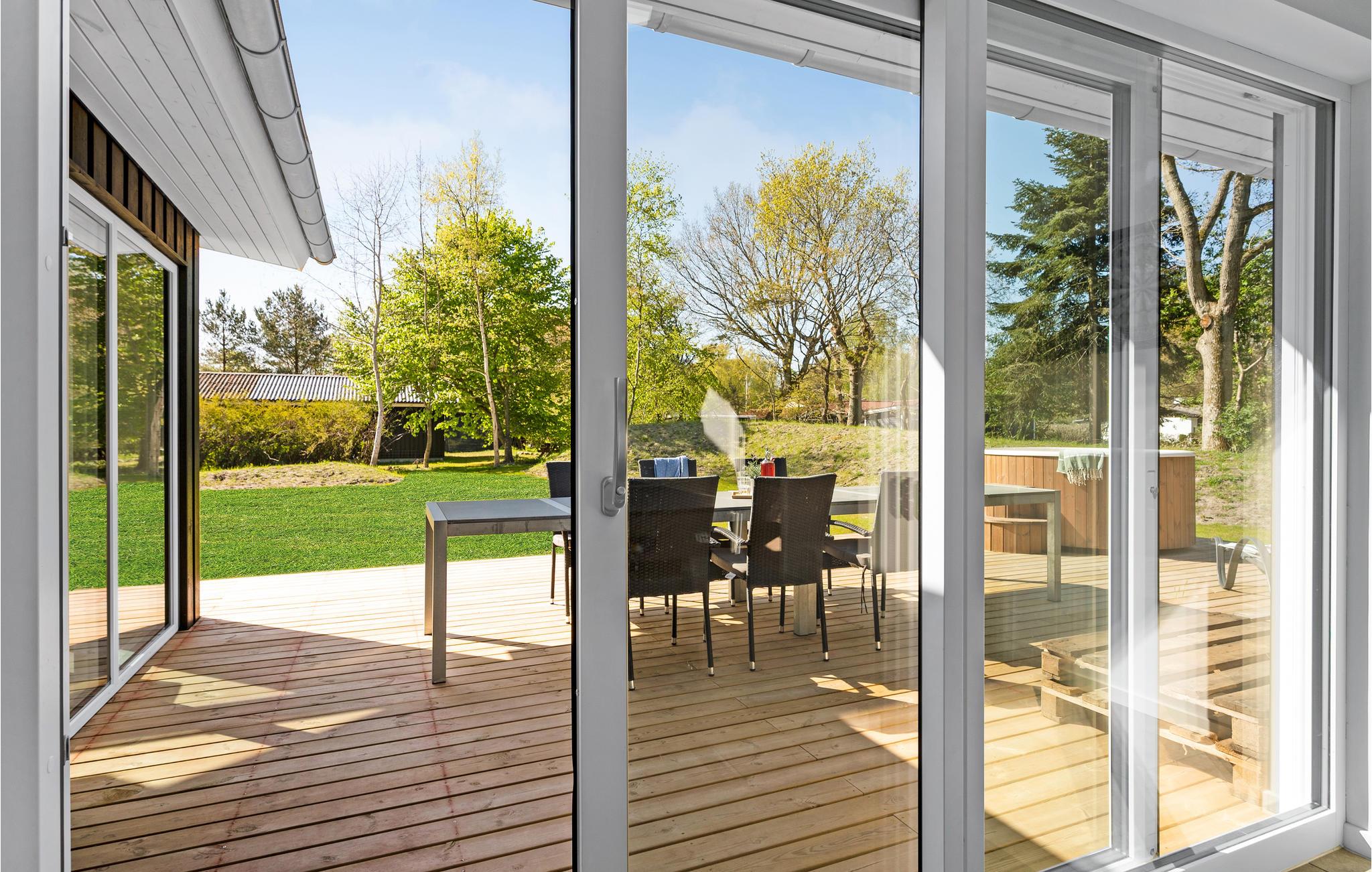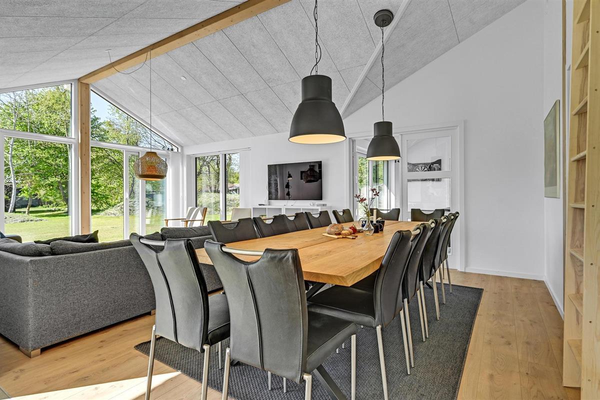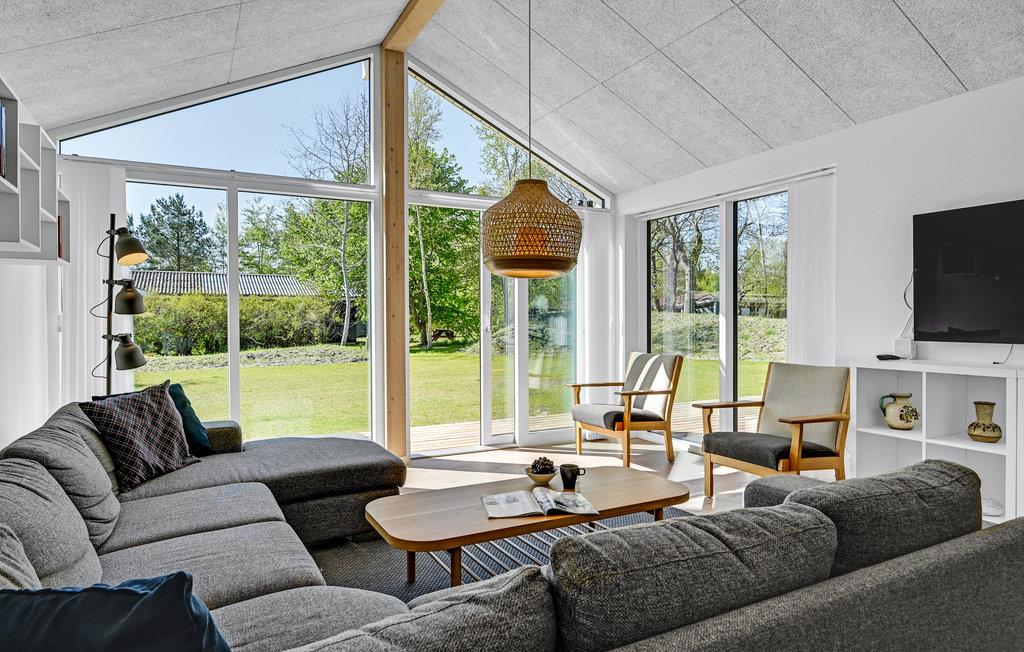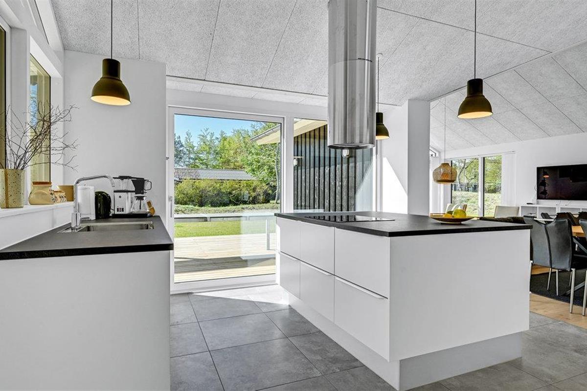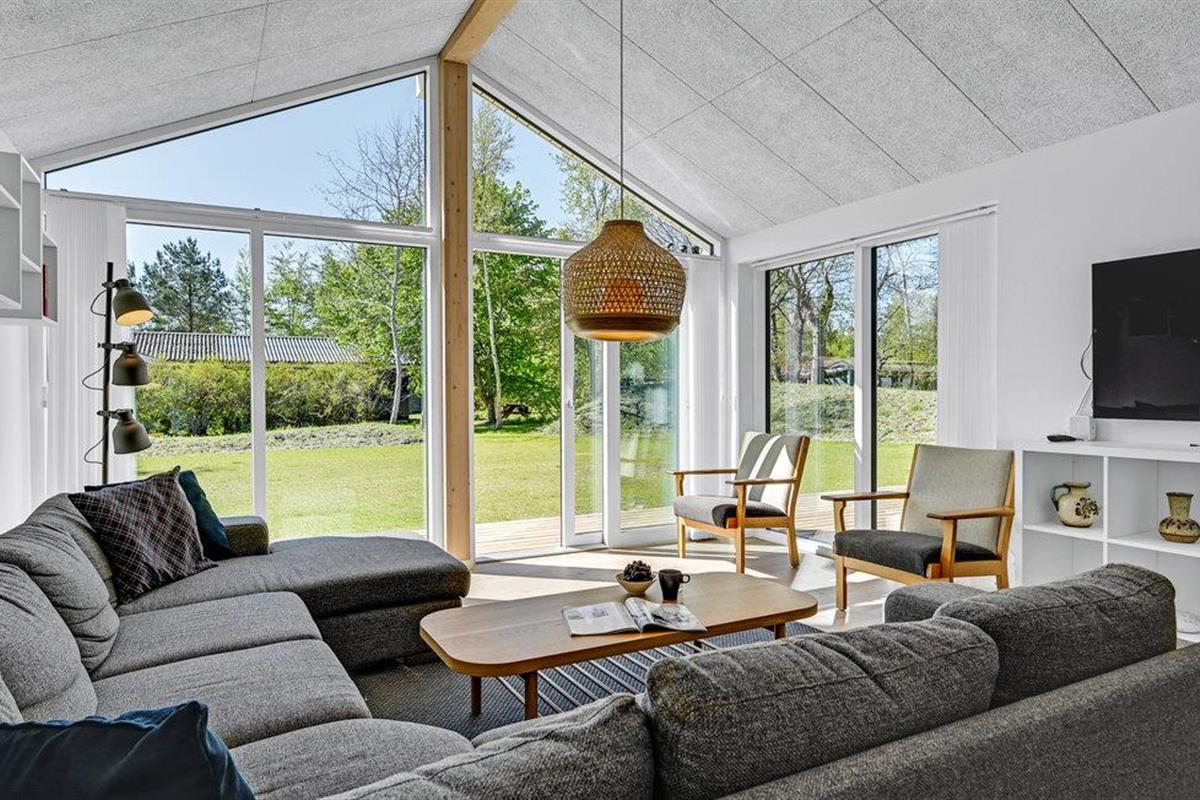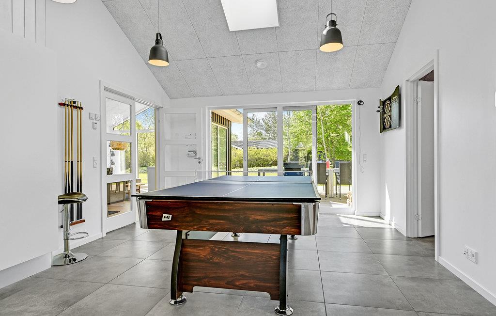 De open keuken in combinatie met de woonkamer maakt vloeiende gesprekken in de hele ruimte mogelijk, wat het geheel nog meer karakter geeft. De speelse schuine plafonds voegen een ander ongewoon tintje toe aan dit moderne vakantiehuis, waardoor de ruimte opener en groter lijkt. Als u door het huis loopt, zult u merken hoe licht het is door de glazen puien, waardoor u misschien denkt dat u helemaal geen kunstlicht nodig hebt, mocht het geen herfst of winter zijn in Denemarken. Bovendien is dit huis perfect in alle temperaturen en weersomstandigheden! U hoeft niet eens na te denken over hoe koud of warm het moet zijn, het binnen- en buitenzwembad zal u en uw metgezel helpen de juiste ontspanning te vinden op uw veranda of in de exclusieve badkamer, net als de aanwezige vloerverwarming.
