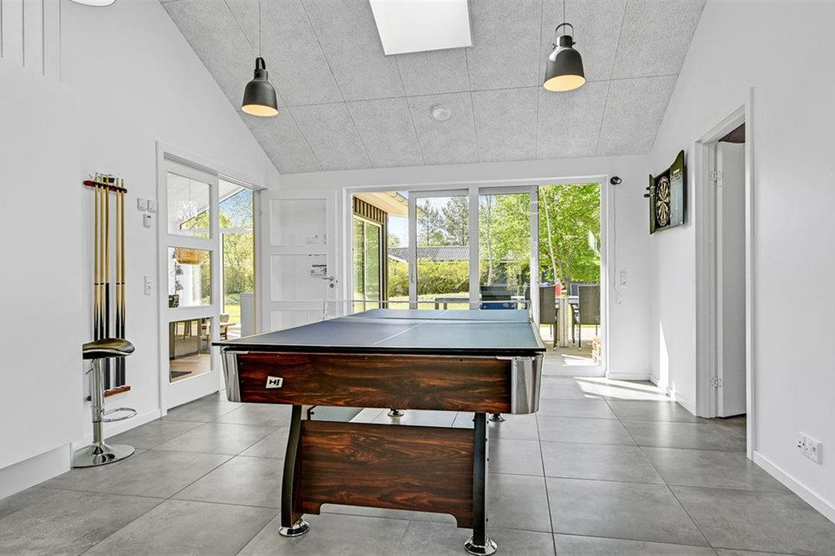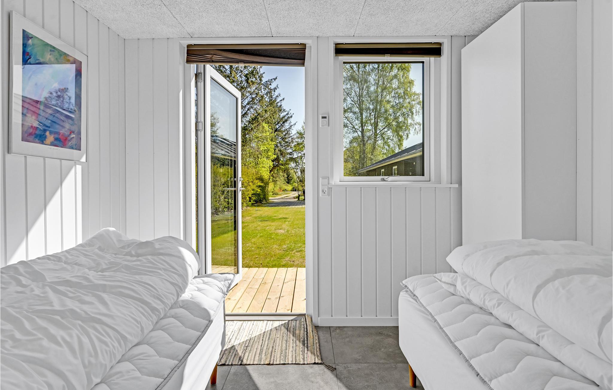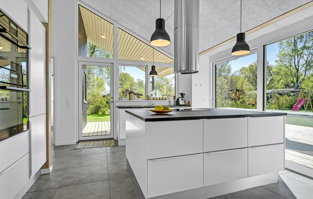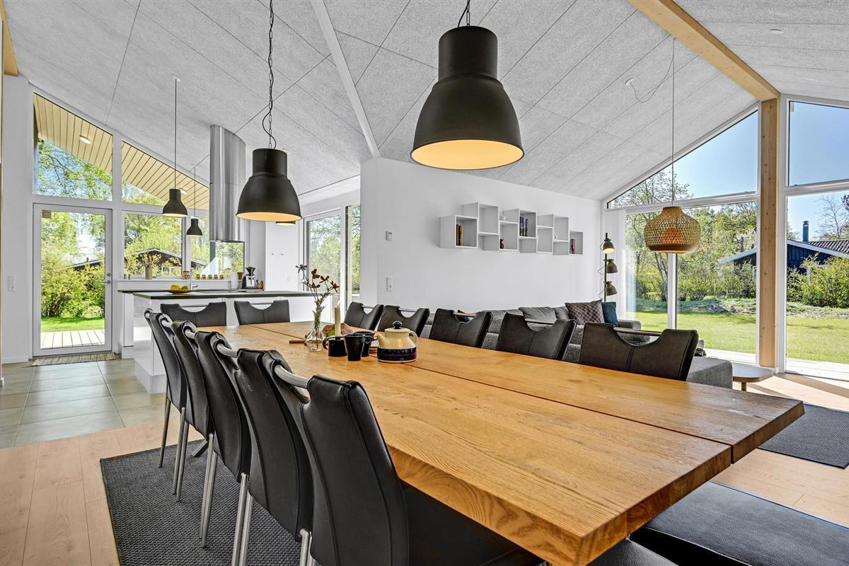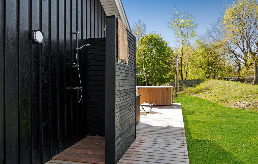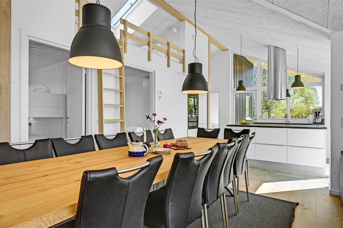De open keuken in combinatie met de woonkamer maakt vloeiende gesprekken in de hele ruimte mogelijk, wat het geheel nog meer karakter geeft. De speelse schuine plafonds voegen een ander ongewoon tintje toe aan dit moderne vakantiehuis, waardoor de ruimte opener en groter lijkt. Als u door het huis loopt, zult u merken hoe licht het is door de glazen puien, waardoor u misschien denkt dat u helemaal geen kunstlicht nodig hebt, mocht het geen herfst of winter zijn in Denemarken. Bovendien is dit huis perfect in alle temperaturen en weersomstandigheden! U hoeft niet eens na te denken over hoe koud of warm het moet zijn, het binnen- en buitenzwembad zal u en uw metgezel helpen de juiste ontspanning te vinden op uw veranda of in de exclusieve badkamer, net als de aanwezige vloerverwarming.