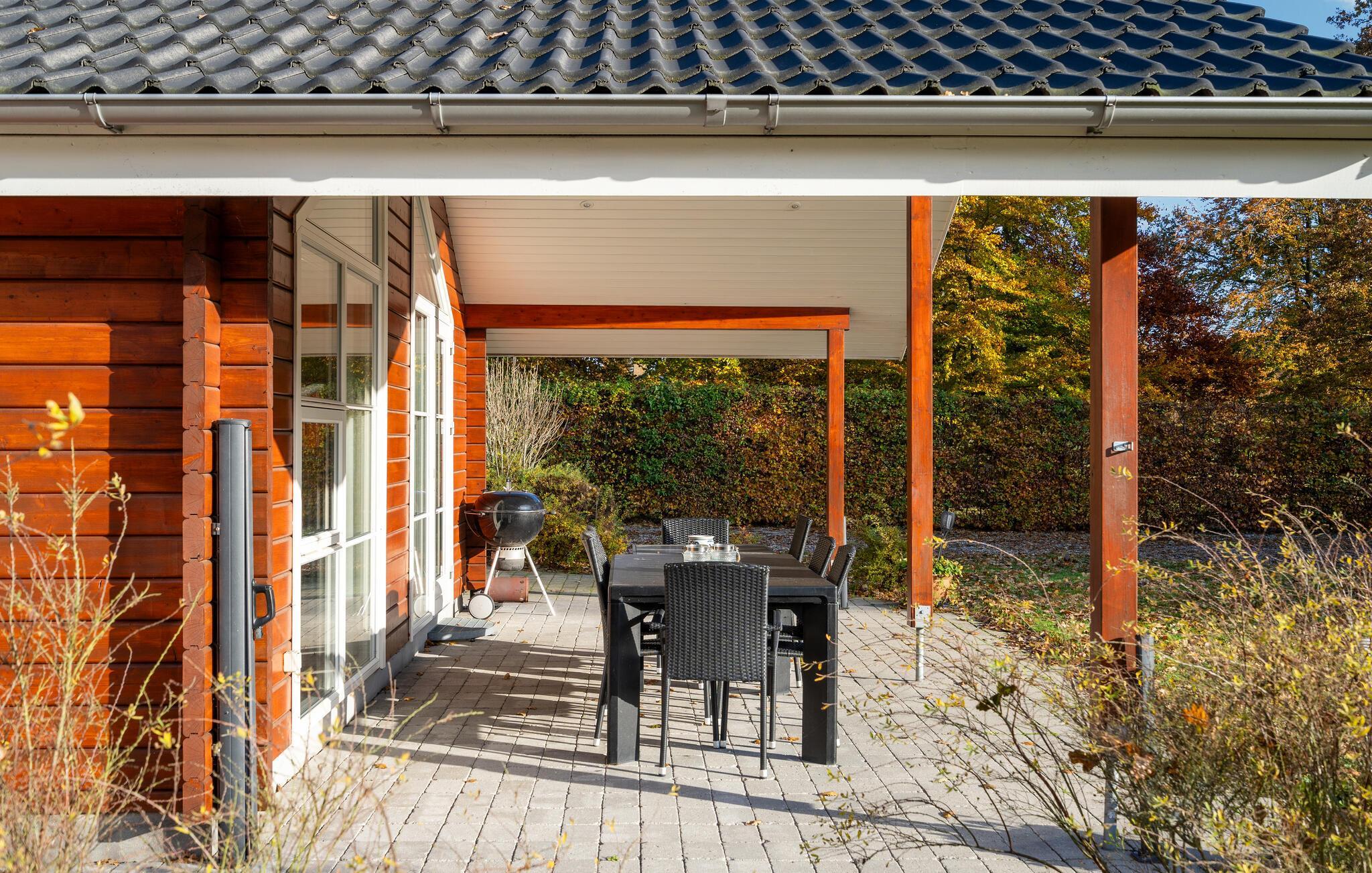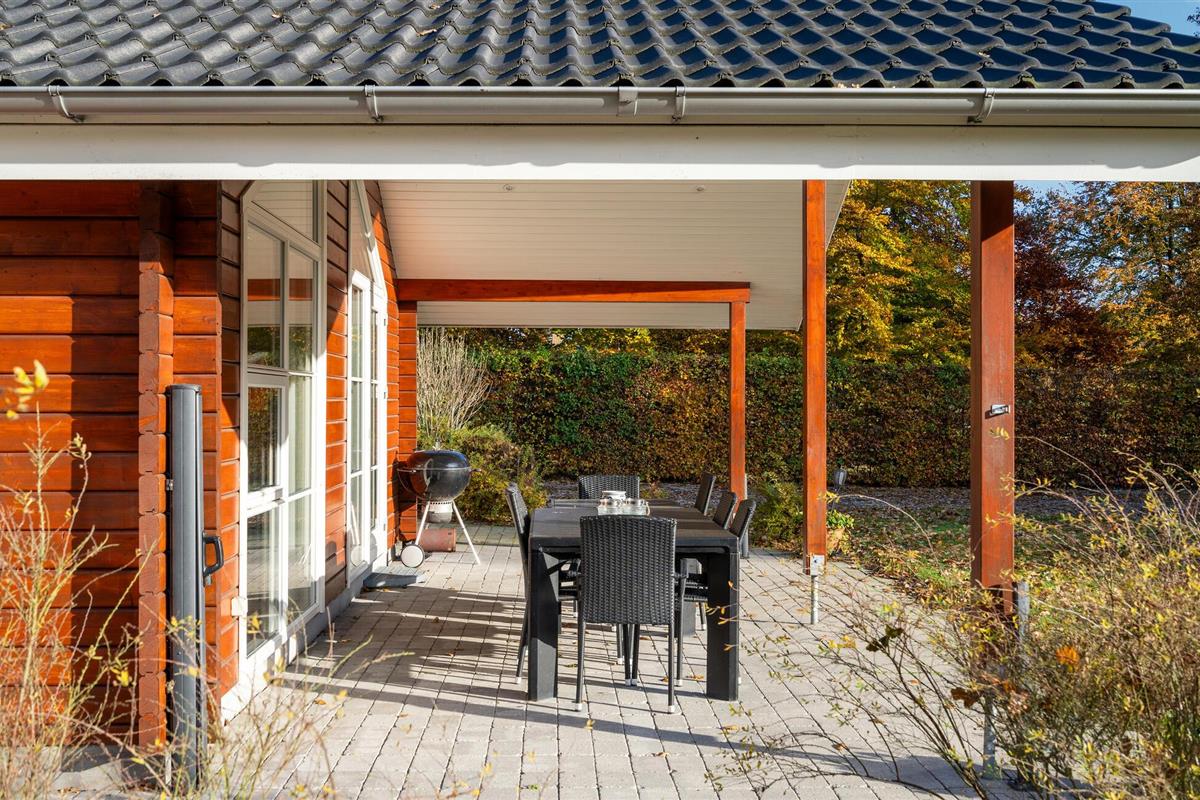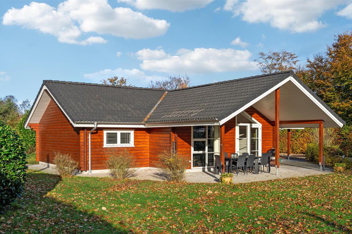 Geniet van dit sfeervolle houten vakantiehuis met tuin en overdekt terras nabij het strand in Fjellerup.