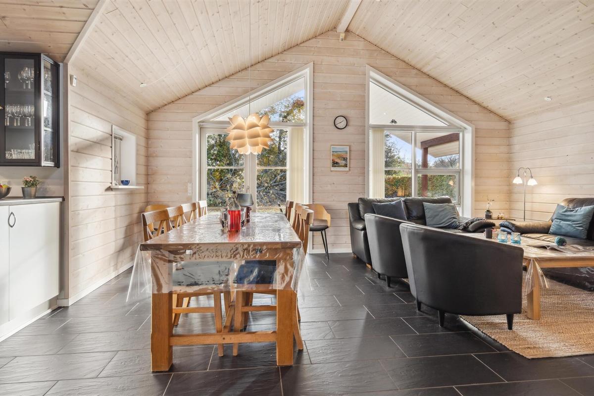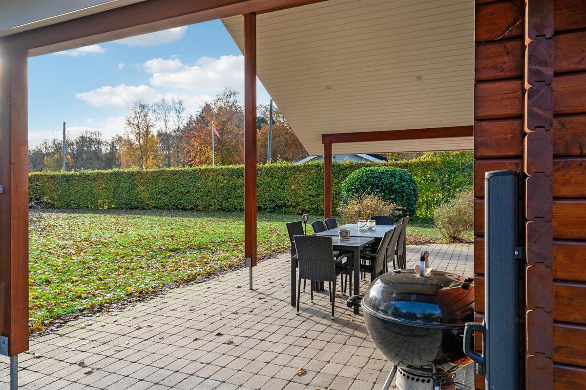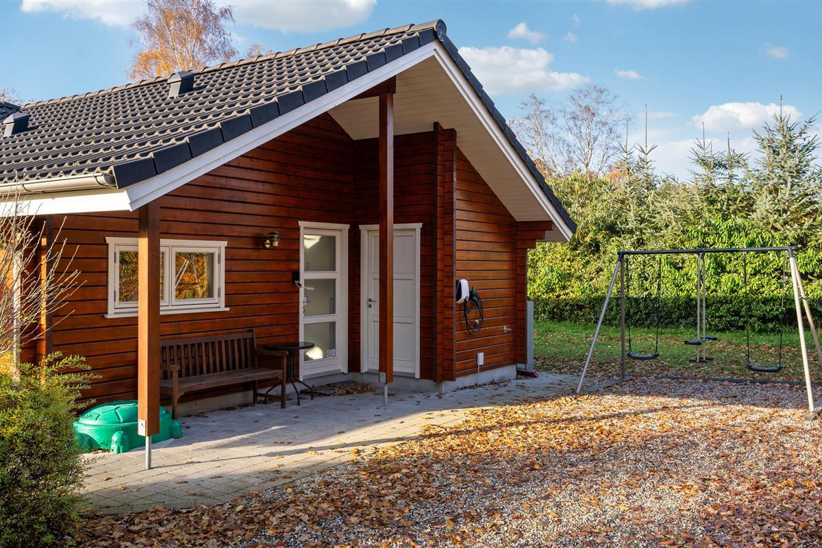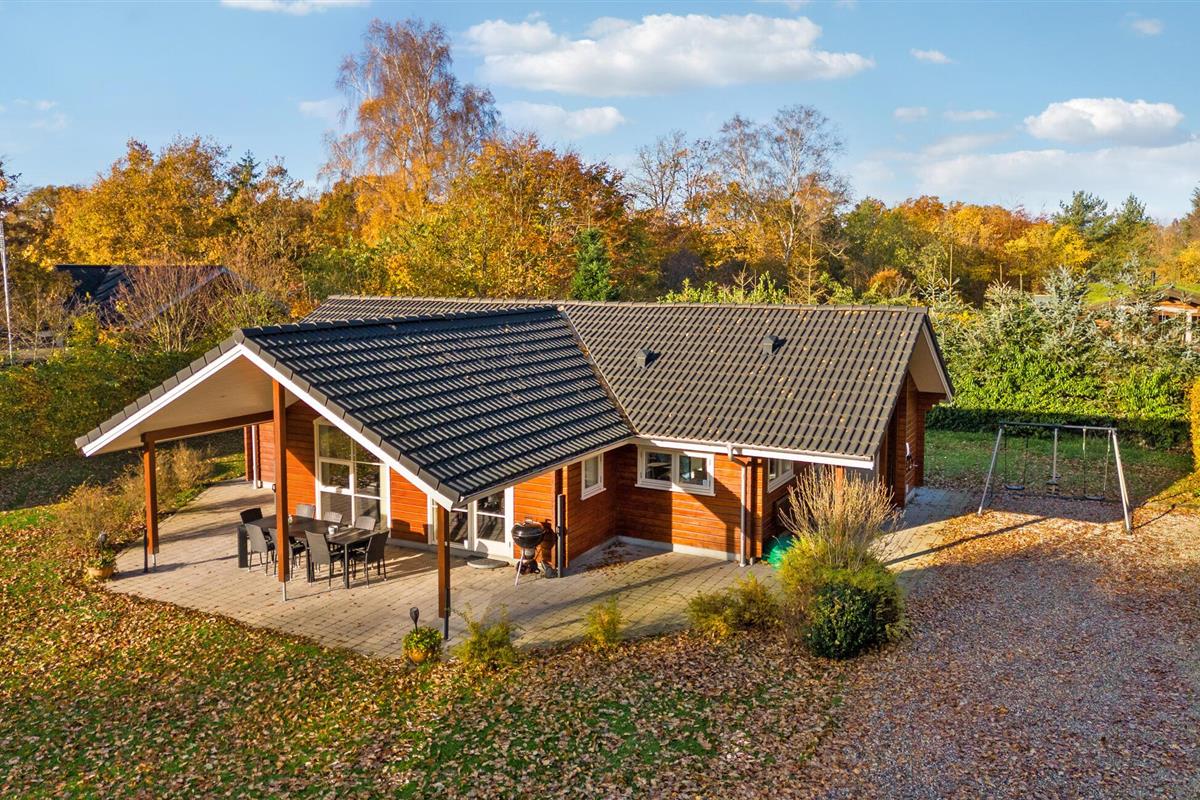 Geniet van dit sfeervolle houten vakantiehuis met tuin en overdekt terras nabij het strand in Fjellerup.