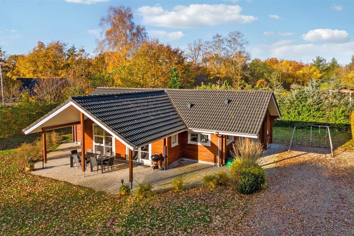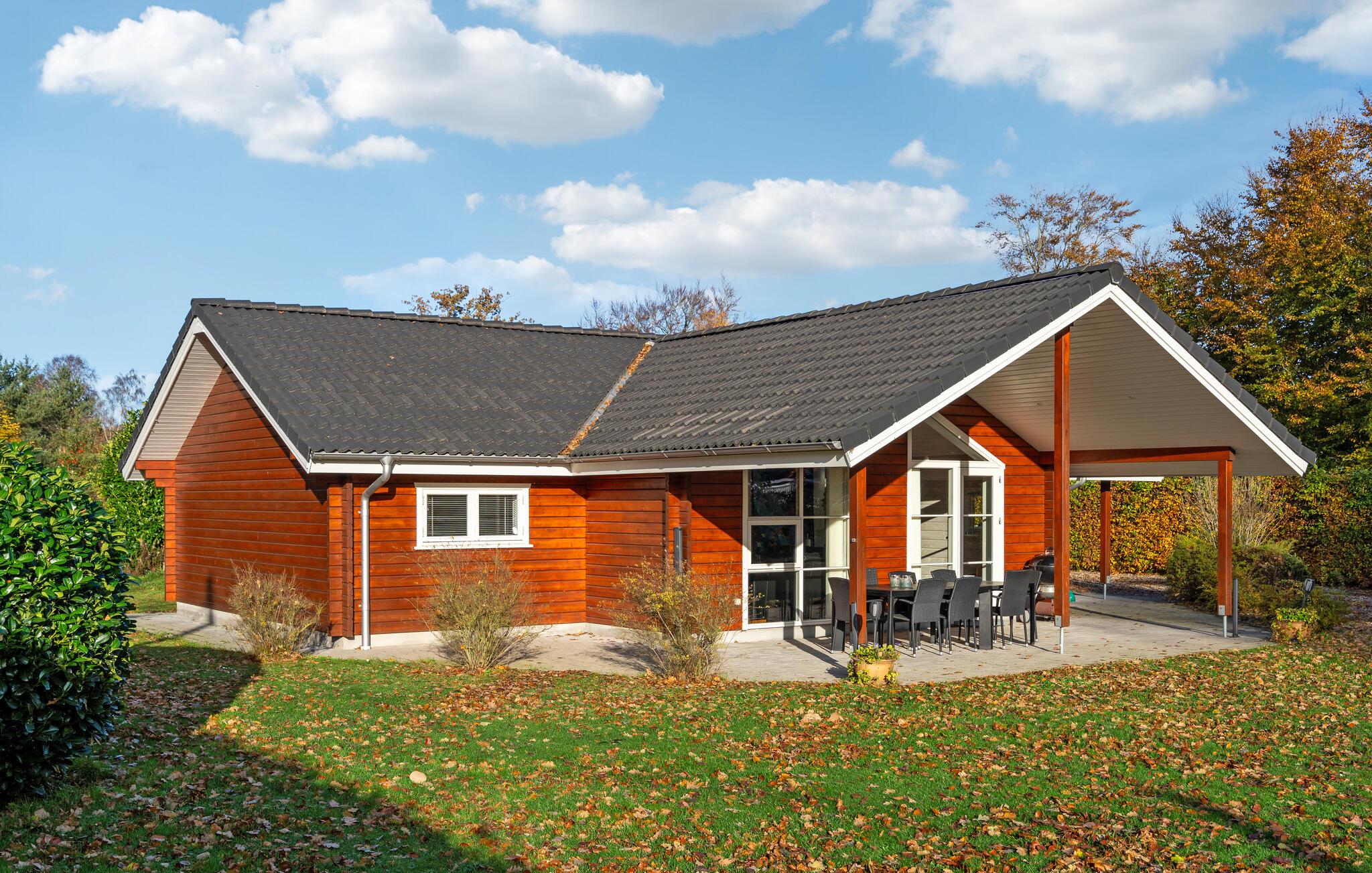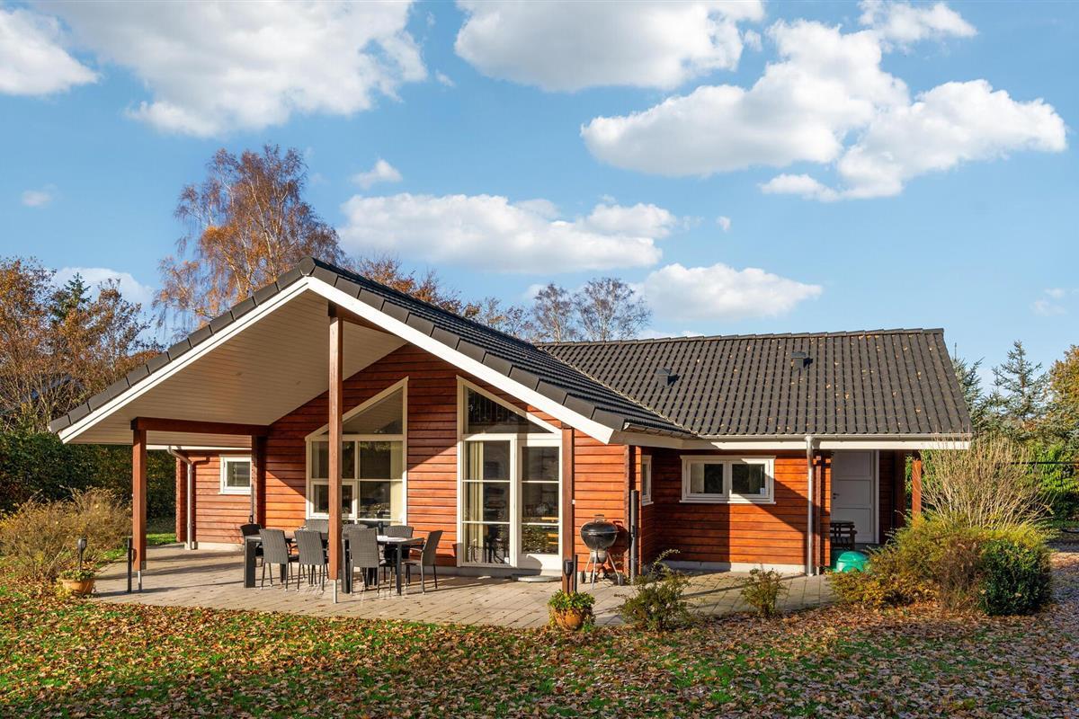 Mooie houten vakantiewoning met tuin en overdekt terras nabij Fjellerup Strand.