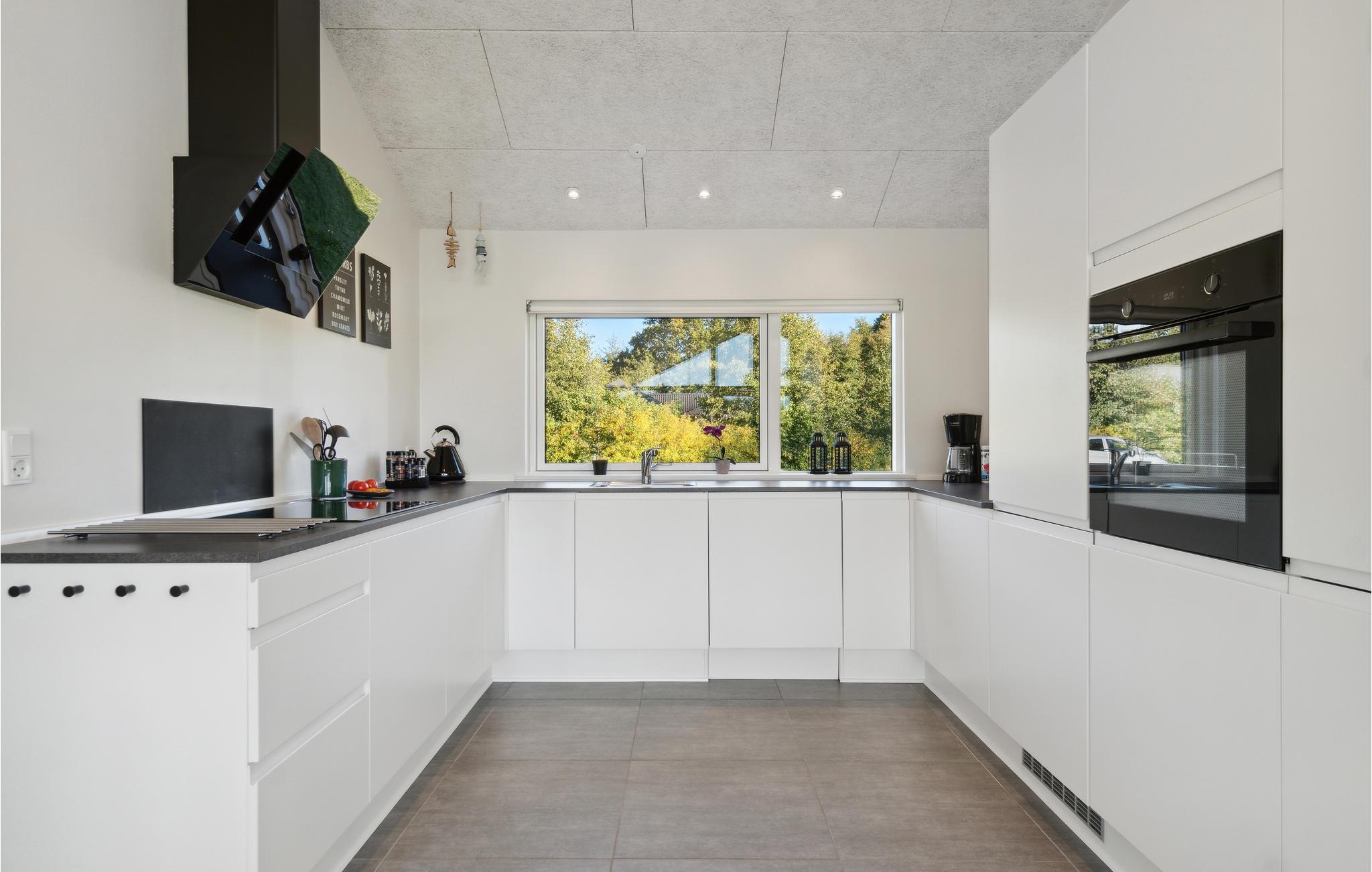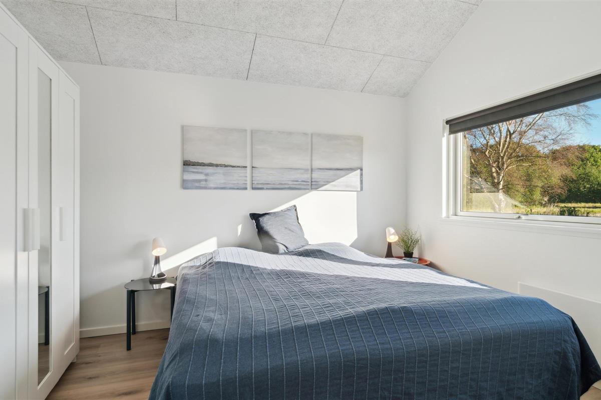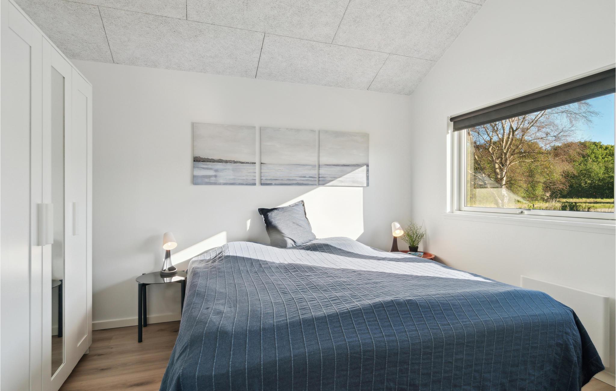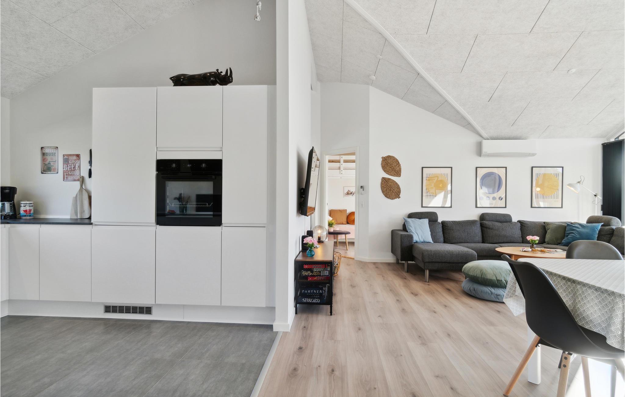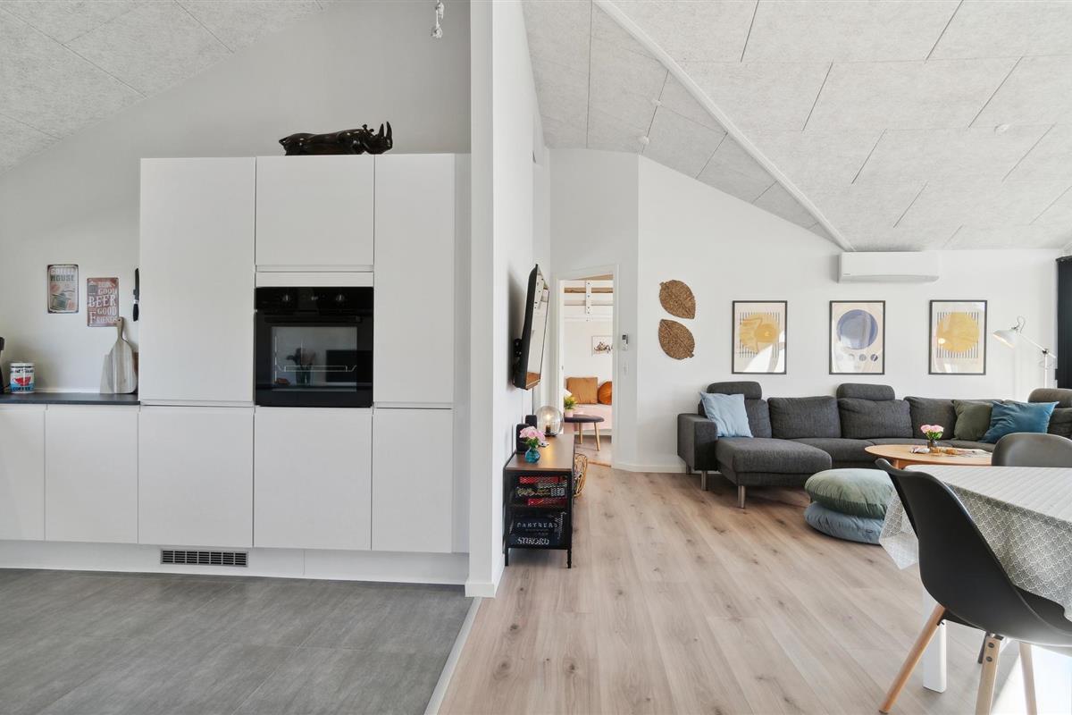 Het raam aan de voorkant overlaadt de kamer met licht, wat de natuurlijke sfeer van het hele huis versterkt. Bovendien nodigt deze natuurlijke inrichting je uit om je helemaal thuis te voelen in dit vakantiehuis aan Fjellerup Strand. Het is een open woonruimte, dus elke kamer is functioneel met elkaar verbonden. Stel je voor dat je een heerlijk ontbijt met verse koffie bereidt in deze moderne keuken en dan binnen aan tafel gaat of buiten op je veranda om de dag samen te beginnen terwijl je uitkijkt over het landschap.