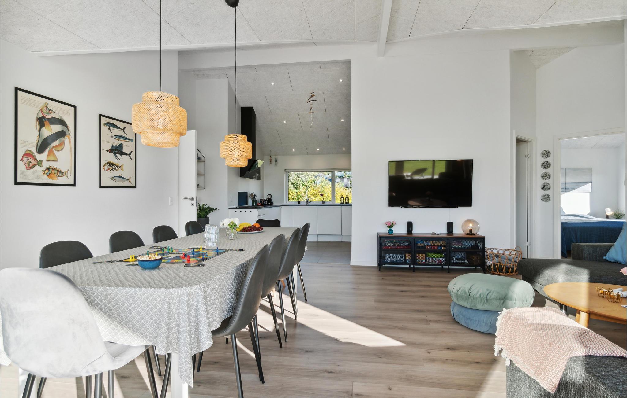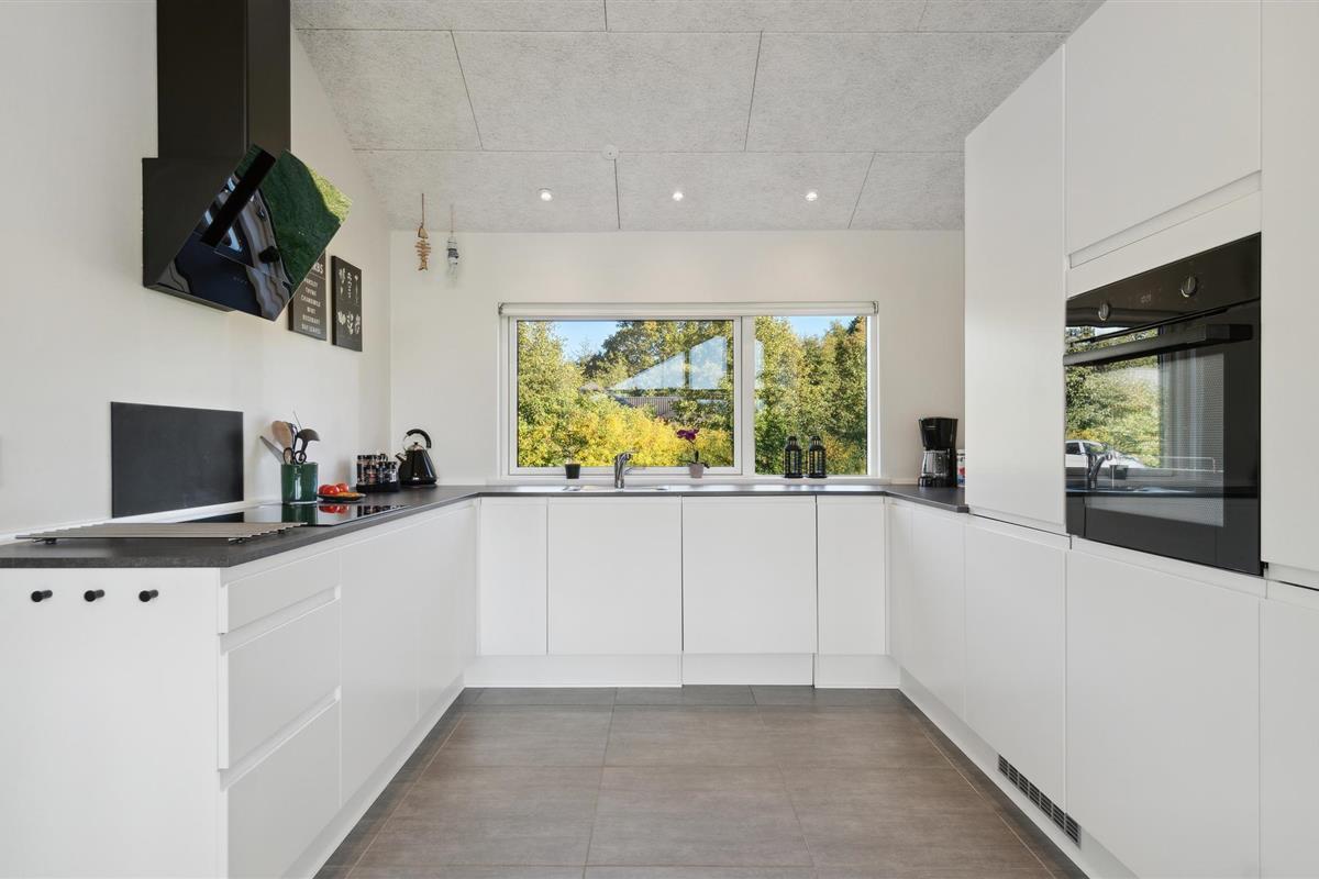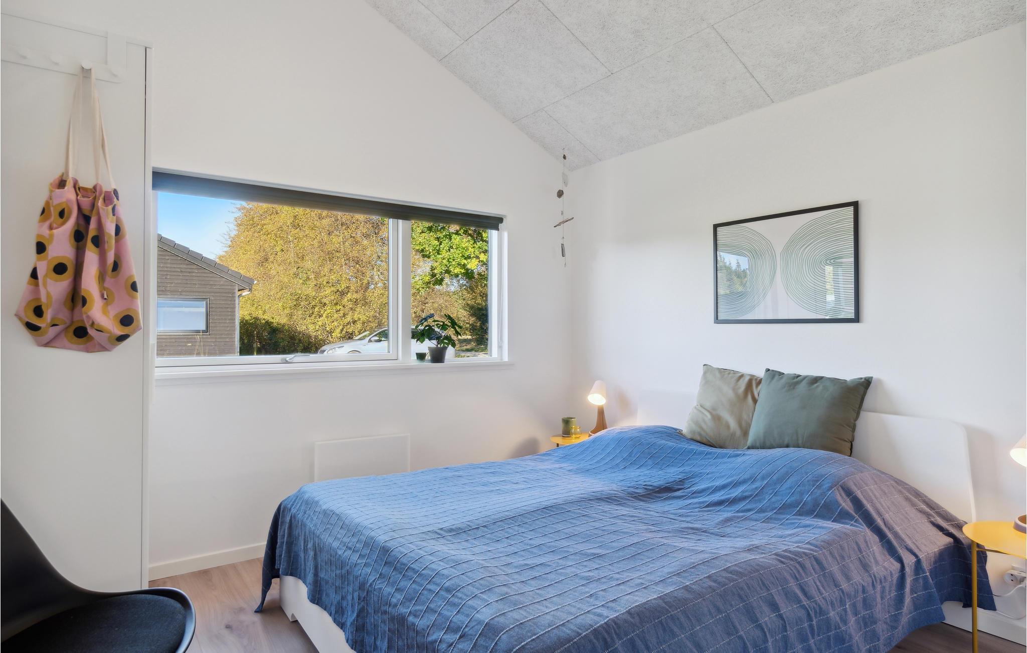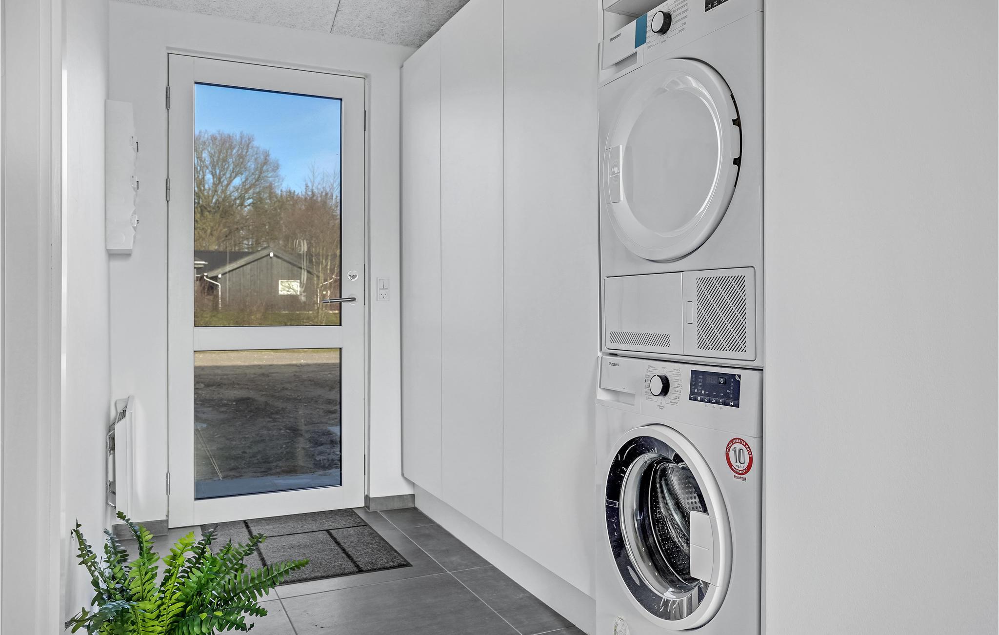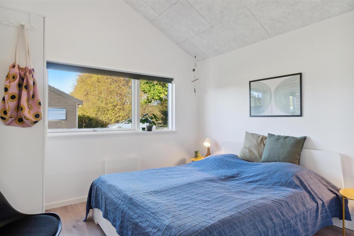 Het raam aan de voorkant overlaadt de kamer met licht, wat de natuurlijke sfeer van het hele huis versterkt. Bovendien nodigt deze natuurlijke inrichting je uit om je helemaal thuis te voelen in dit vakantiehuis aan Fjellerup Strand. Het is een open woonruimte, dus elke kamer is functioneel met elkaar verbonden. Stel je voor dat je een heerlijk ontbijt met verse koffie bereidt in deze moderne keuken en dan binnen aan tafel gaat of buiten op je veranda om de dag samen te beginnen terwijl je uitkijkt over het landschap.