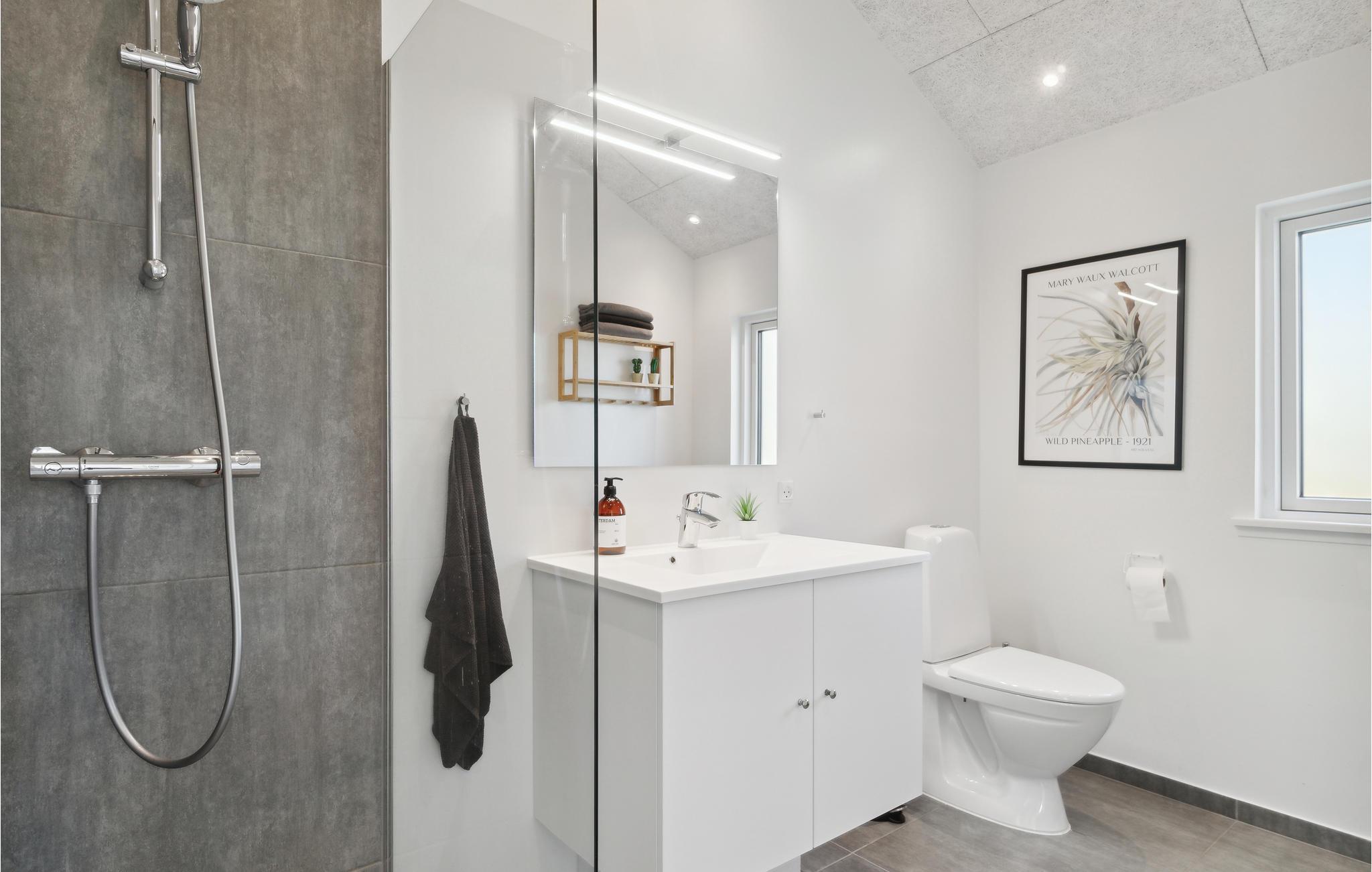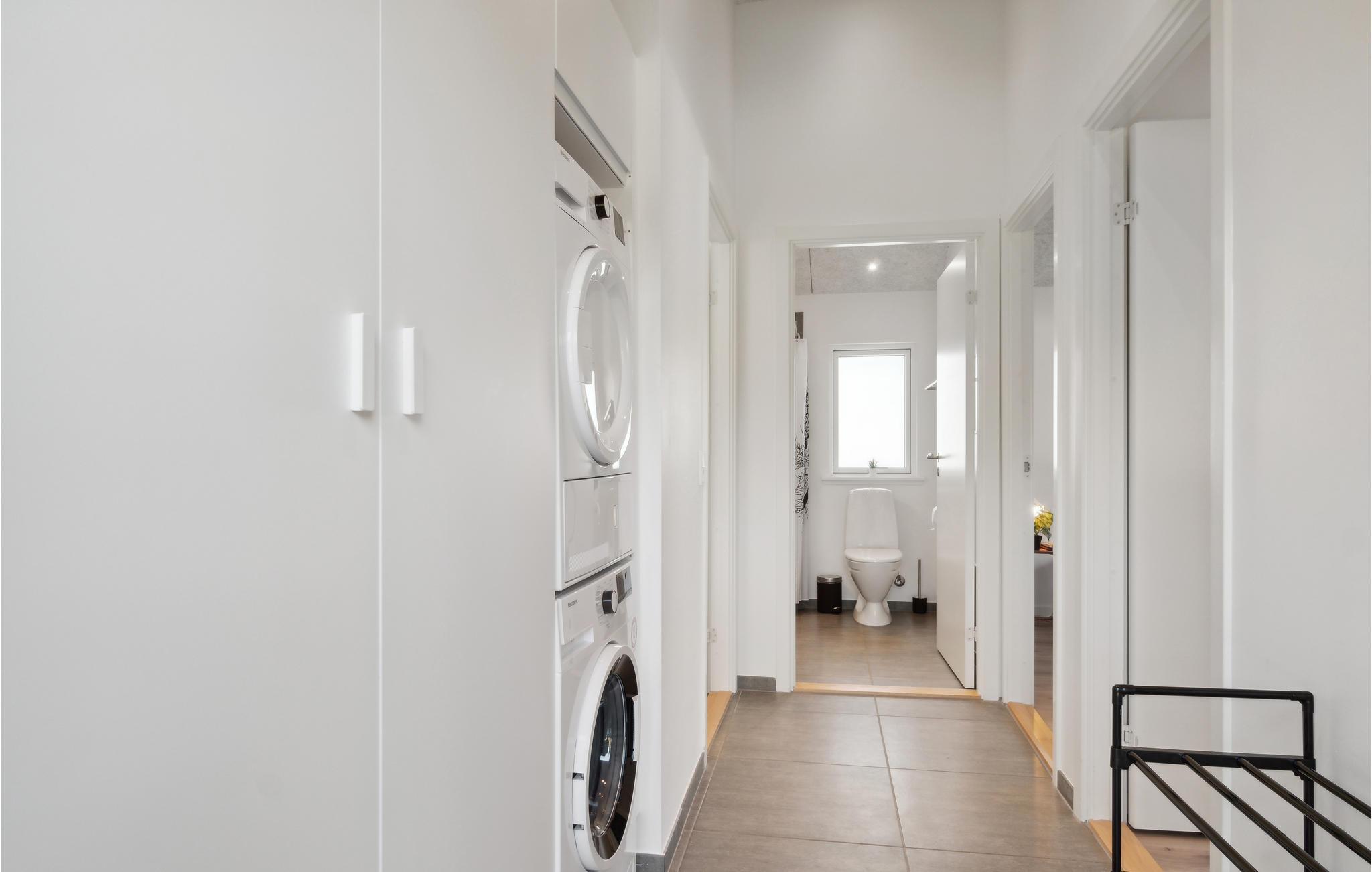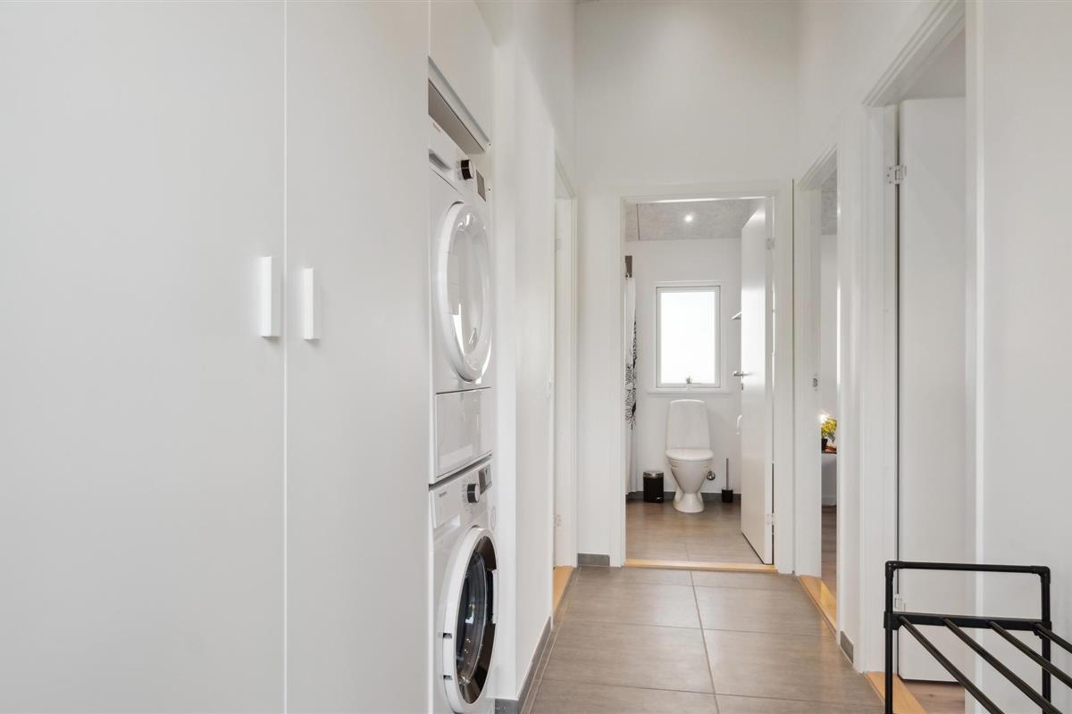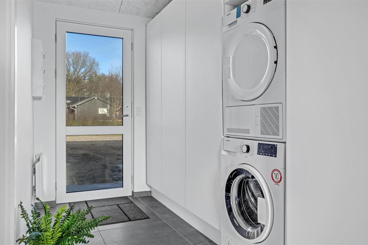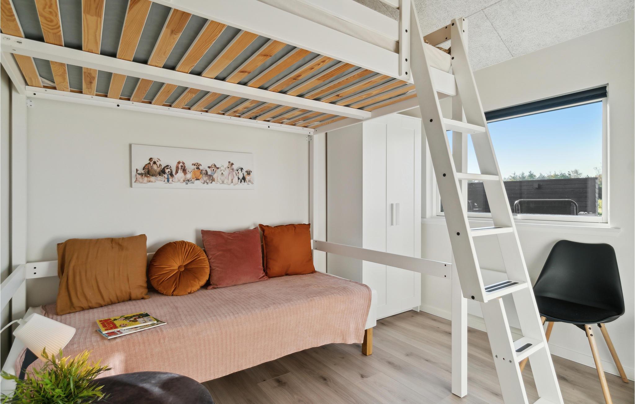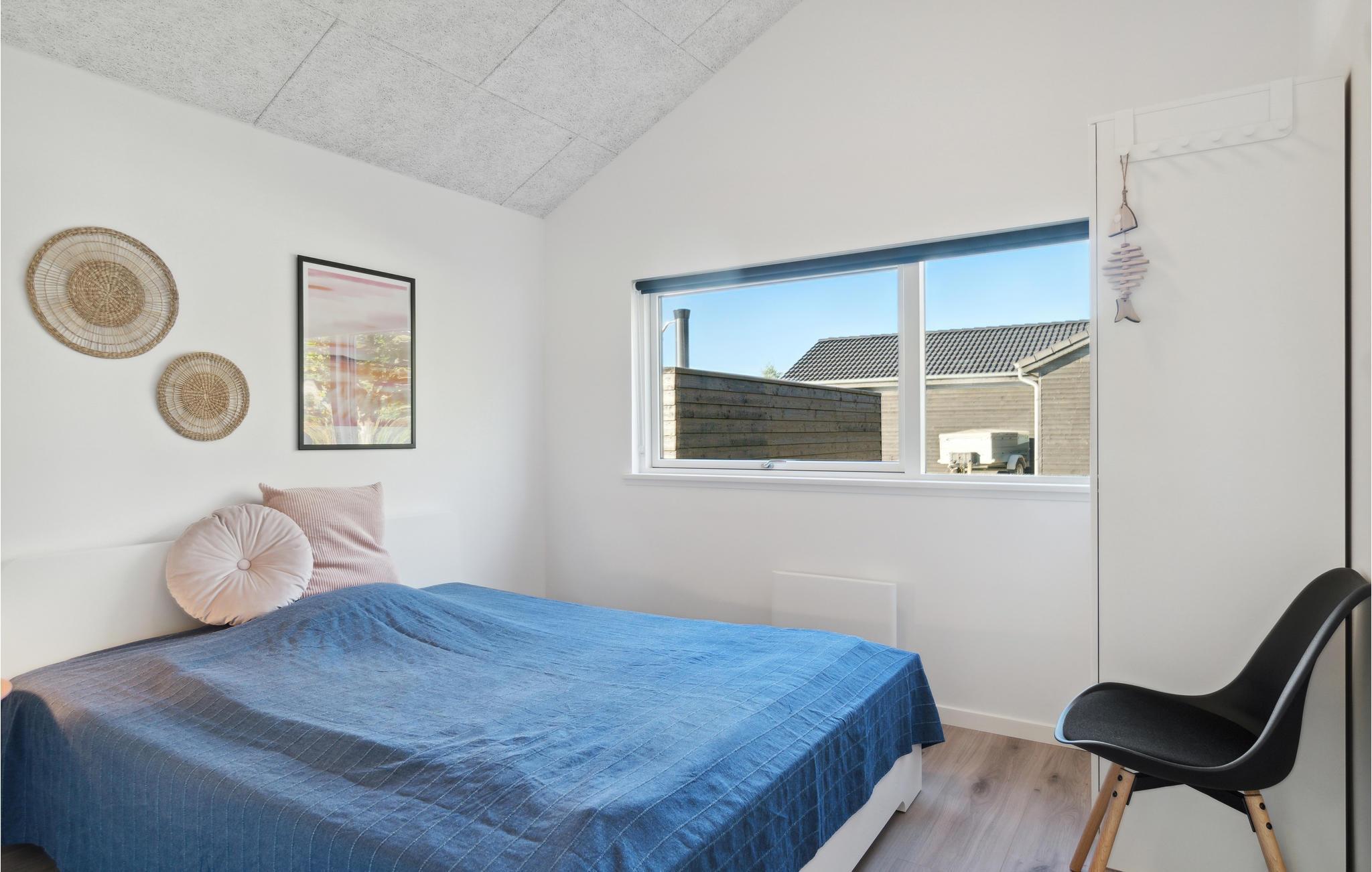 Het raam aan de voorkant overlaadt de kamer met licht, wat de natuurlijke sfeer van het hele huis versterkt. Bovendien nodigt deze natuurlijke inrichting je uit om je helemaal thuis te voelen in dit vakantiehuis aan Fjellerup Strand. Het is een open woonruimte, dus elke kamer is functioneel met elkaar verbonden. Stel je voor dat je een heerlijk ontbijt met verse koffie bereidt in deze moderne keuken en dan binnen aan tafel gaat of buiten op je veranda om de dag samen te beginnen terwijl je uitkijkt over het landschap.