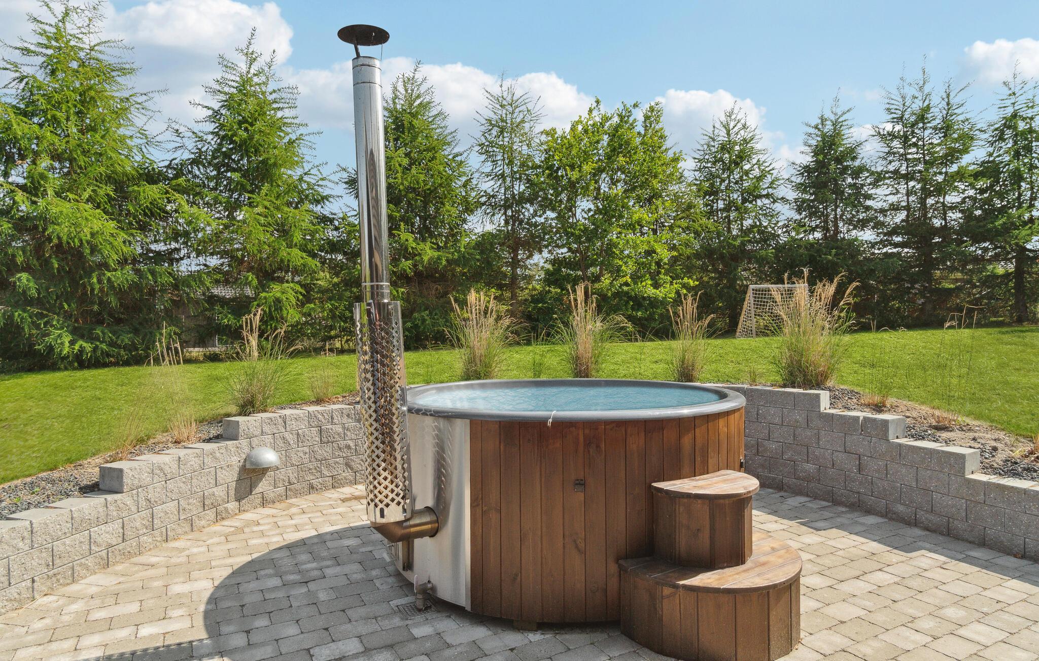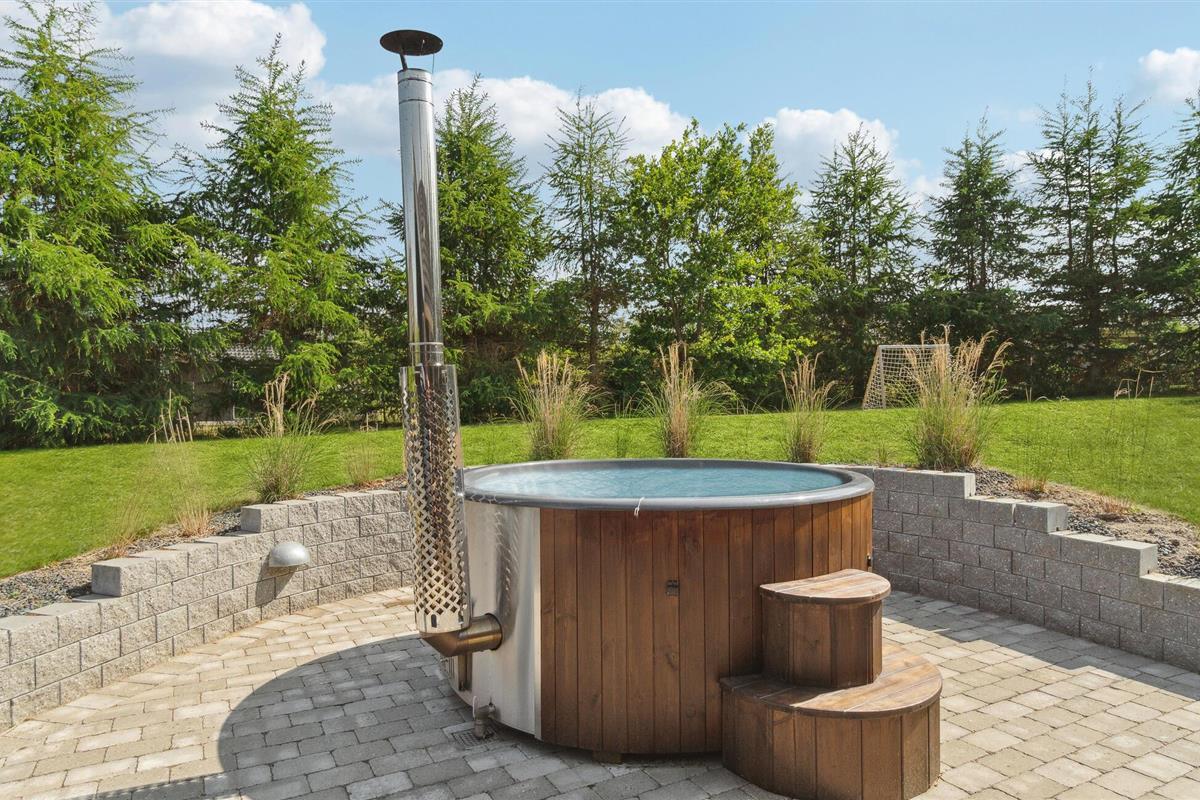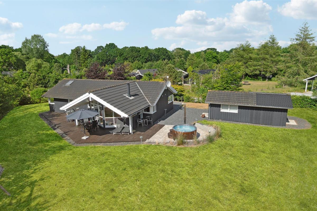 Ontspan in een modern vakantiehuis nabij het strand van Fjellerup met whirlpool, sauna en speeltuin voor kinderen.