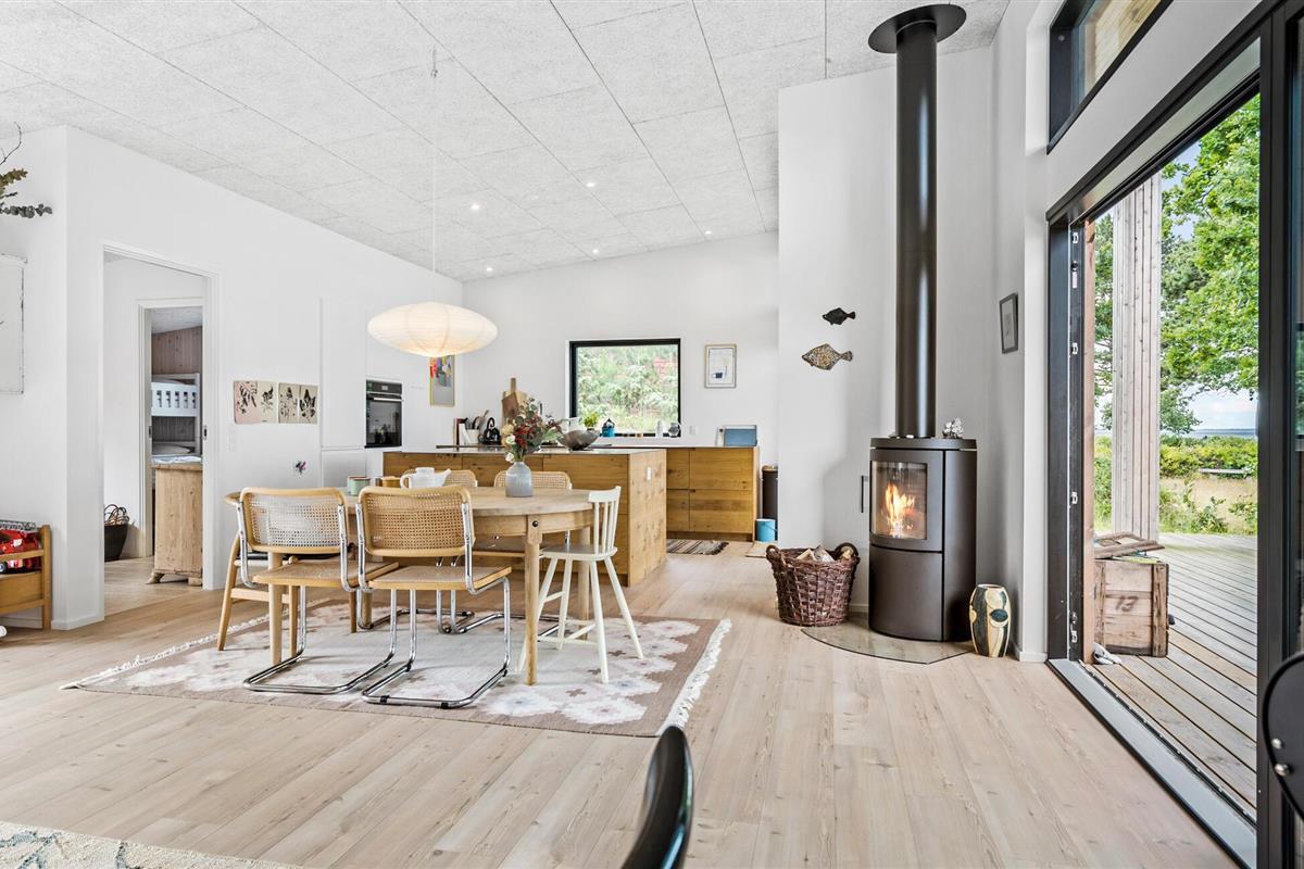 Reis naar Fjellerup Strand en betreed dit uitnodigende huis, dat het binnenleven combineert met het buitenleven en het uitzicht op zee door de grote panoramische ramen. De ruime woonkamer wordt het hart van het vakantiehuis, want hier kom je samen om te koken in de moderne keuken, te eten en te ontspannen op de banken. Geniet van de smaakvolle kamers met je geliefden en breng aangename uren door op het houten terras dat het hele huis omringt en je zon of schaduw biedt voor je maaltijden en bijeenkomsten buiten, afhankelijk van het tijdstip van de dag. Hoe dan ook, je kunt verliefd worden op het uitzicht op zee en gewoon je badhanddoek omgooien en naar het zandstrand wandelen.