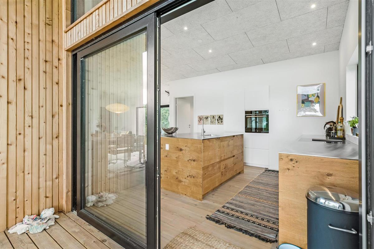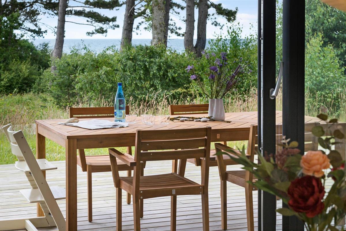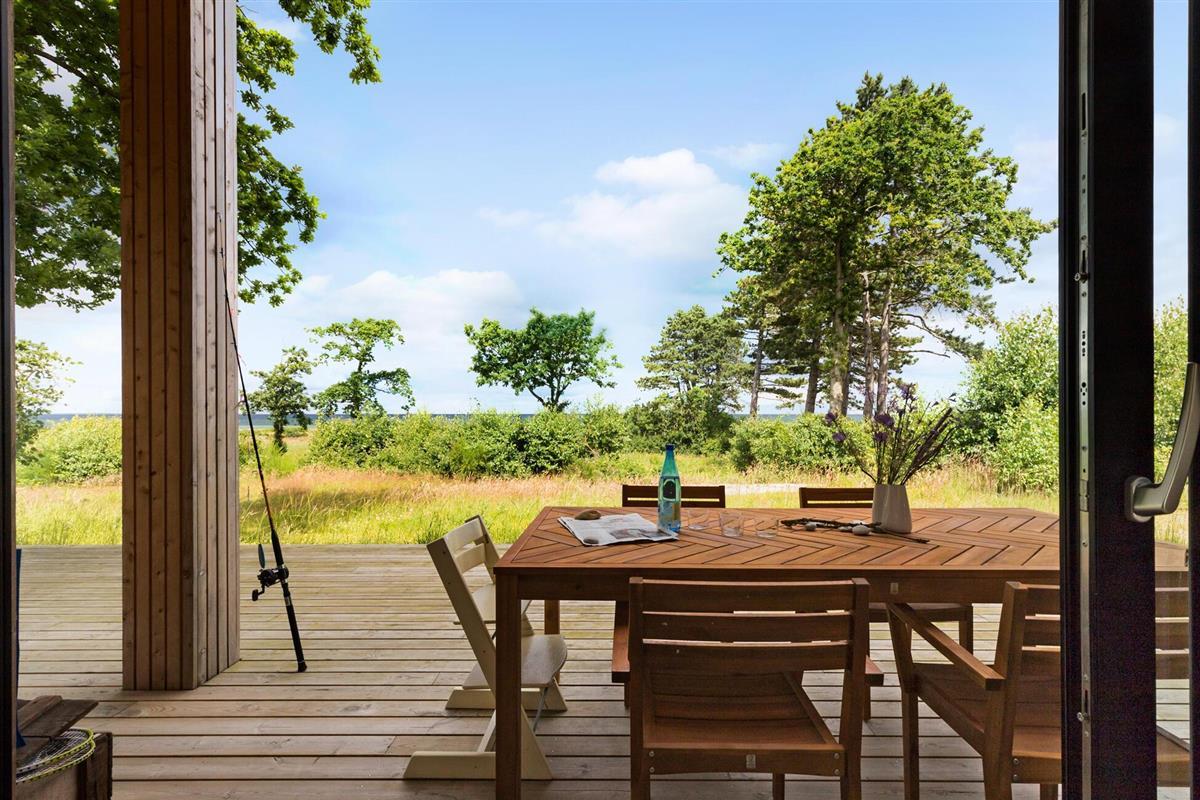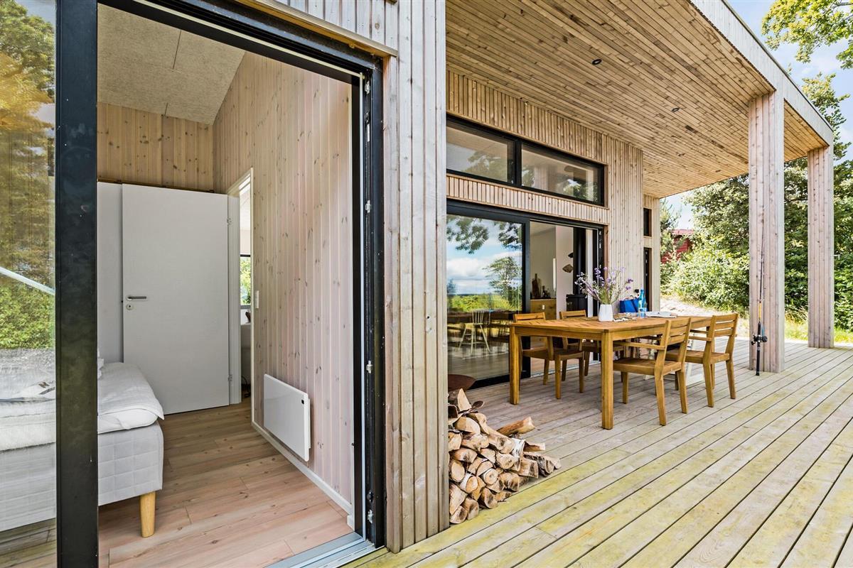Modern houten huis met panoramisch zeezicht en groot terras, direct aan het strand in Fjellerup.