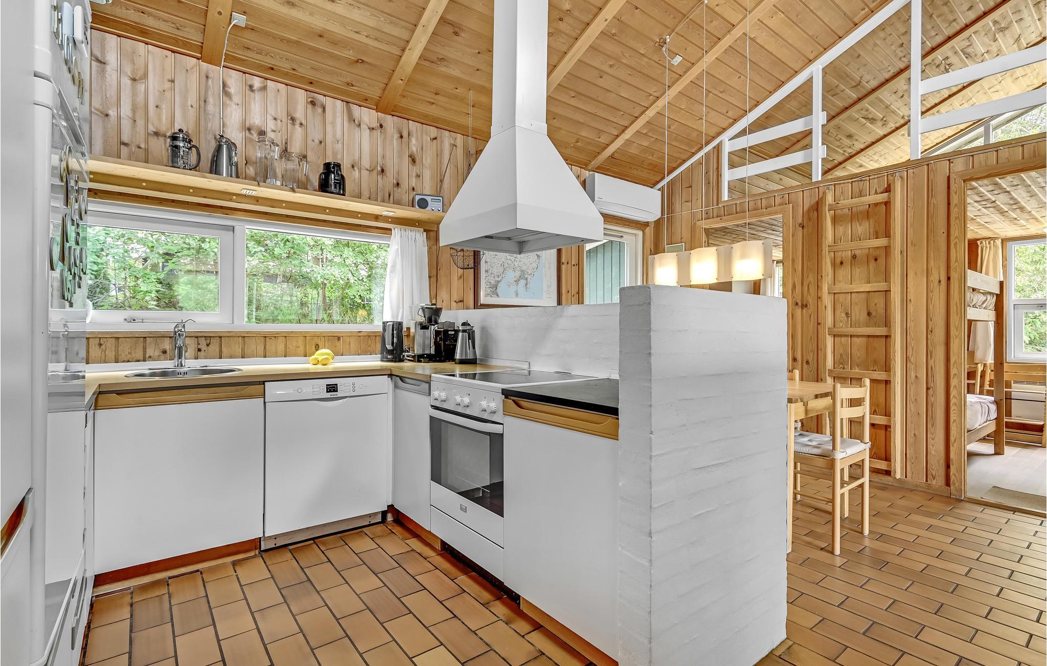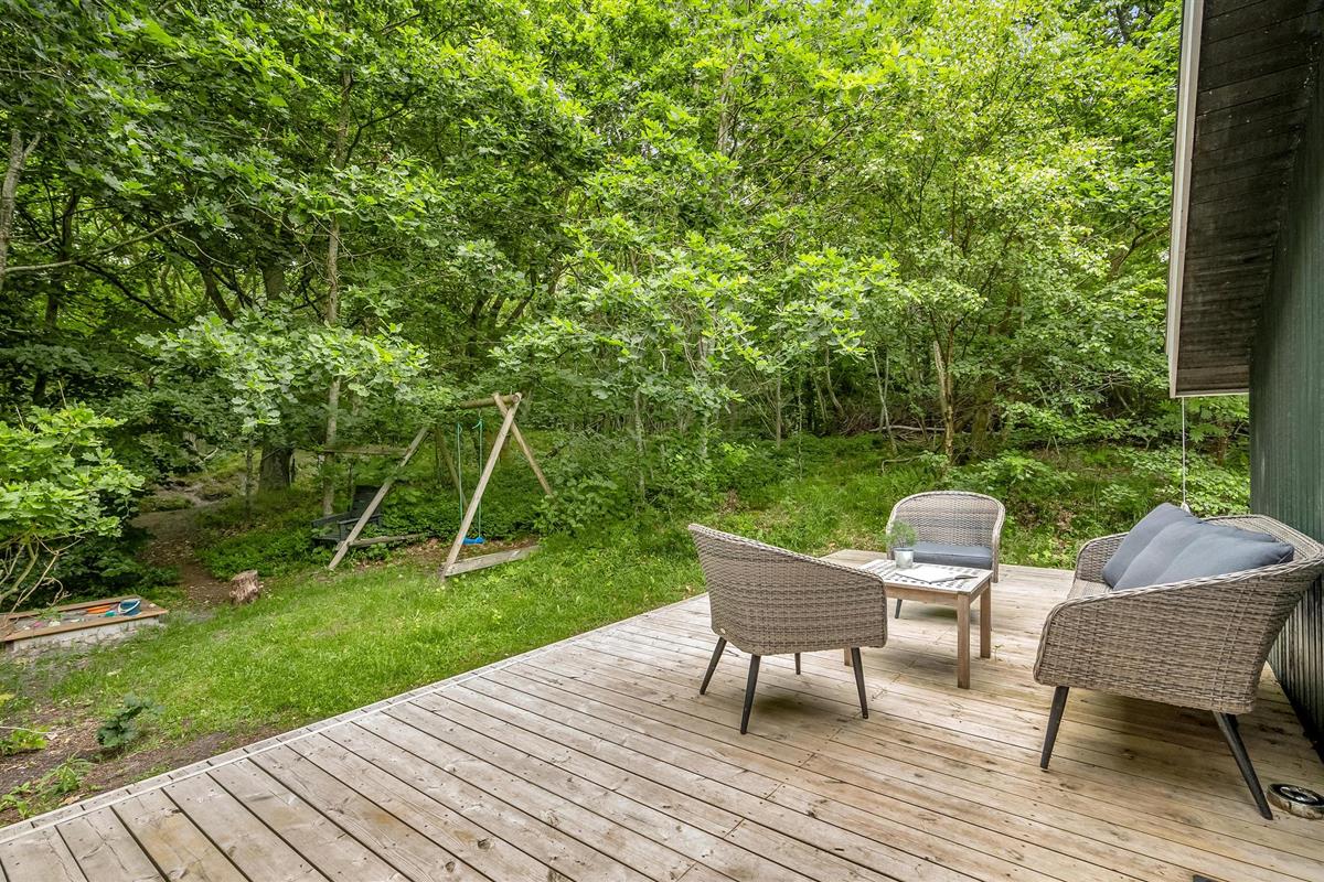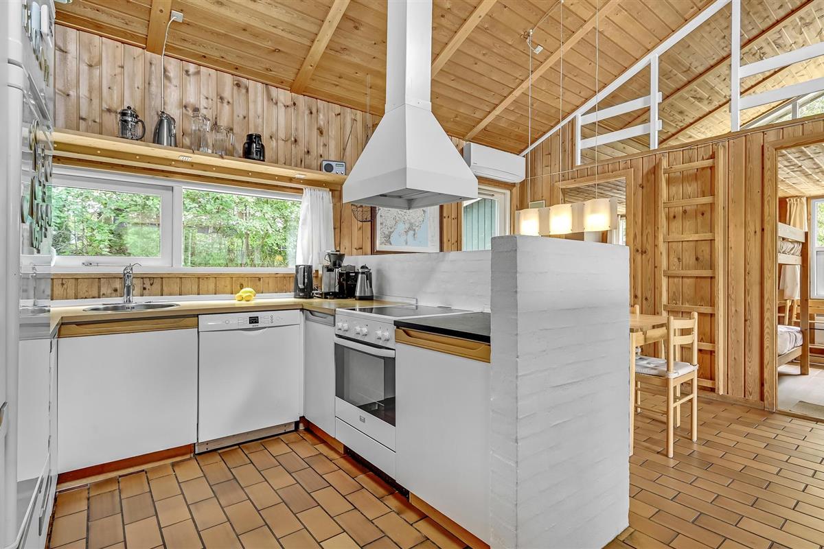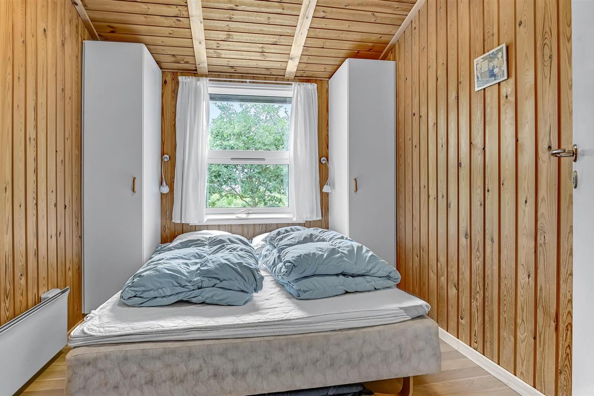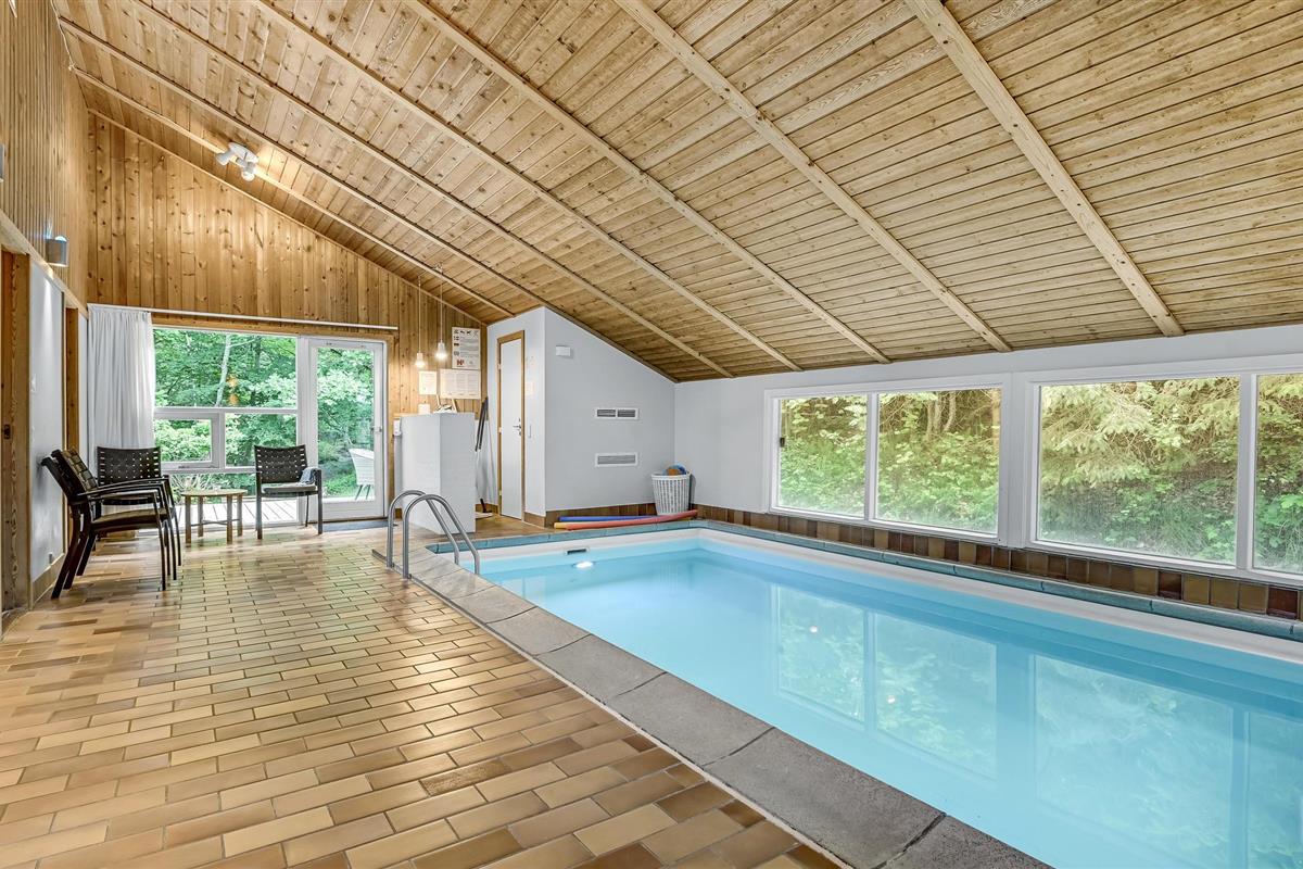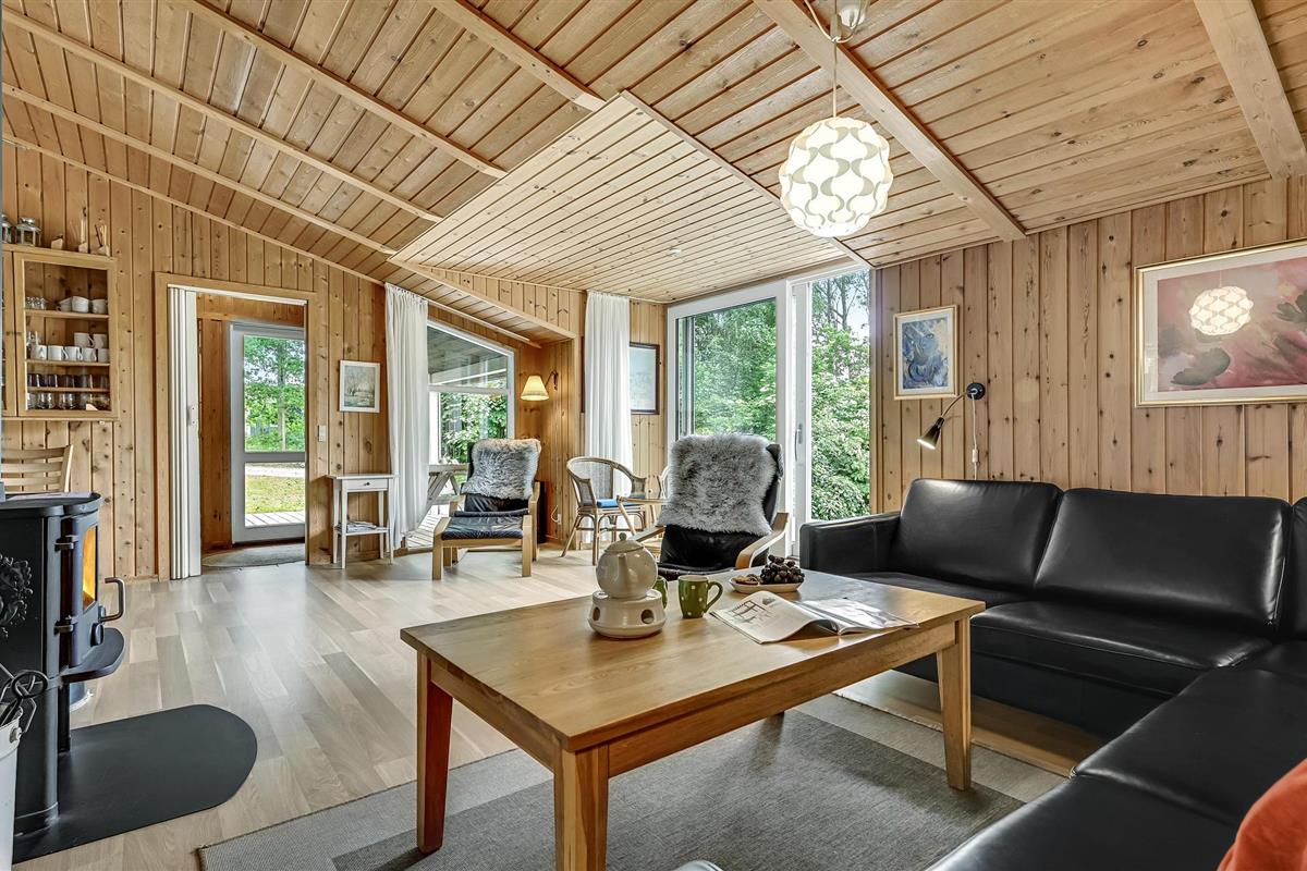 Het gezellige vakantiehuis ligt hoog op een heuvelachtig natuurperceel en op slechts 200 m van het mooie zandstrand. Het is goed geïsoleerd, onder andere met energieramen. De woonkamer met houtkachel is mooi ingericht en vooral gezellig als het vuur in de kachel knettert. De zwembadkamer van 50 m² en het zwembad van 18 m² zorgen ervoor dat u hier bij elk weer een goede en ontspannen vakantie kunt doorbrengen. Het huis heeft ook een kleine zolder waar de kinderen kunnen spelen. Er zijn ook matrassen voor extra slaapgelegenheid. Twee badkamers en vier ruime slaapkamers maken dit huis ideaal voor twee gezinnen. Het huis heeft aan drie zijden goede terrassen. De woning grenst in het oosten aan het bos Mejlgård Skov, geniet van het uitzicht op dit beschermde bos vanaf het ongestoorde terras achter het huis. Herten en ander wild komen vaak uit het bos op het terrein. Een 5 km lang fiets- en wandelpad begint op 100 m van het huis en voert u langs het water door het beschermde gebied naar Bønnerup. In Fjellerup Strand is er minigolf en goede visplekken.