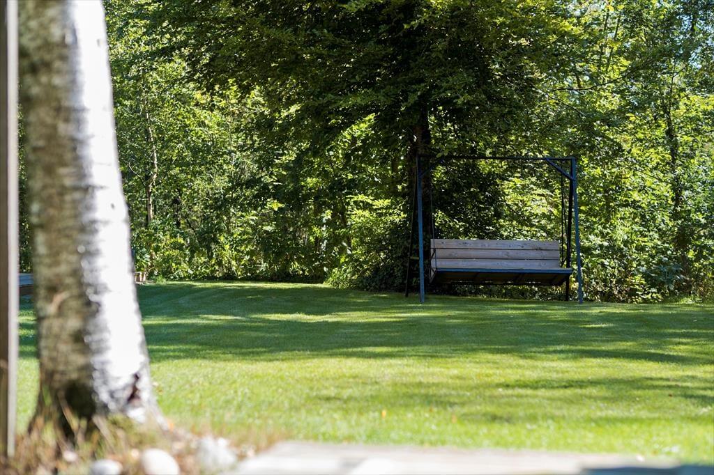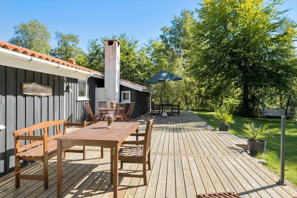 Der Name des Hauses ist Birkely, und es gibt auch mehrere schöne Birken auf dem grossen Naturgrundstück. Genau genommen fühlt es sich an, als ob Sie Ihre Ferien an einem Waldrand verbringen, denn auch die Rasenfläche des Hauses wird auf besonders schöne Weise von Grün umgeben, wodurch das Ferienleben draußen herrlich ungestört von statten gehen kann. Südlich und östlich des Ferienhauses breitet sich jeweils eine große Holzterrasse aus, und hier gibt es sowohl überdachte als auch offene Sitzgelegenheiten, zwischen denen Sie wählen können.