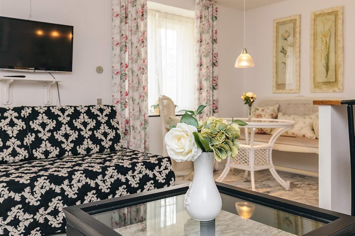 Lejligheden har egen terrasse, hvor du kan nyde morgensolen, slappe af med en god bog eller blot lade blikket glide ud over det grønne område. Atmosfæren er afslappet, stilfuld og ideel til både par, små familier og solo-rejsende, der ønsker at komme helt ned i gear.