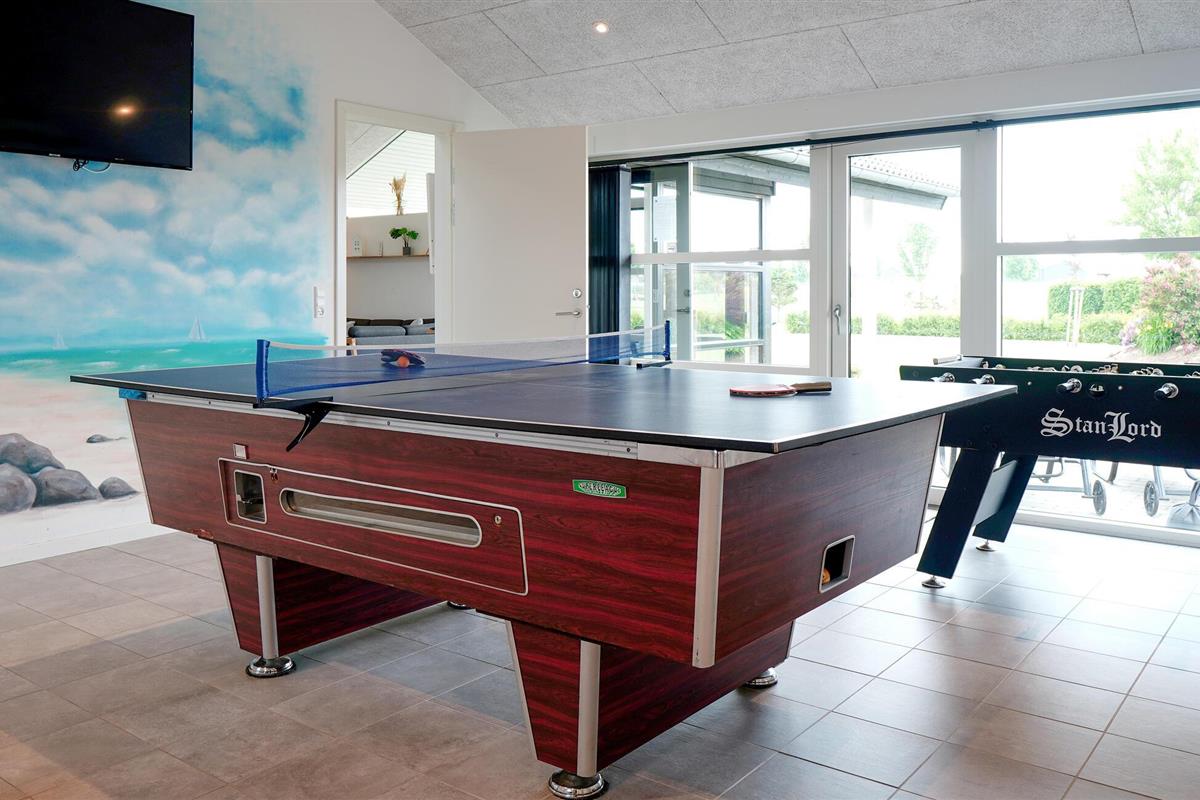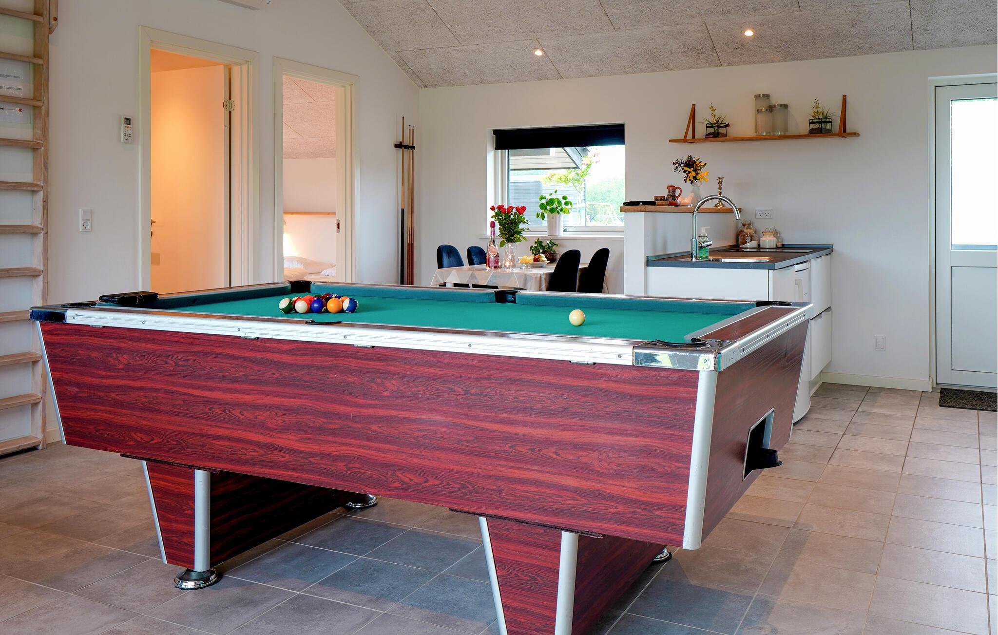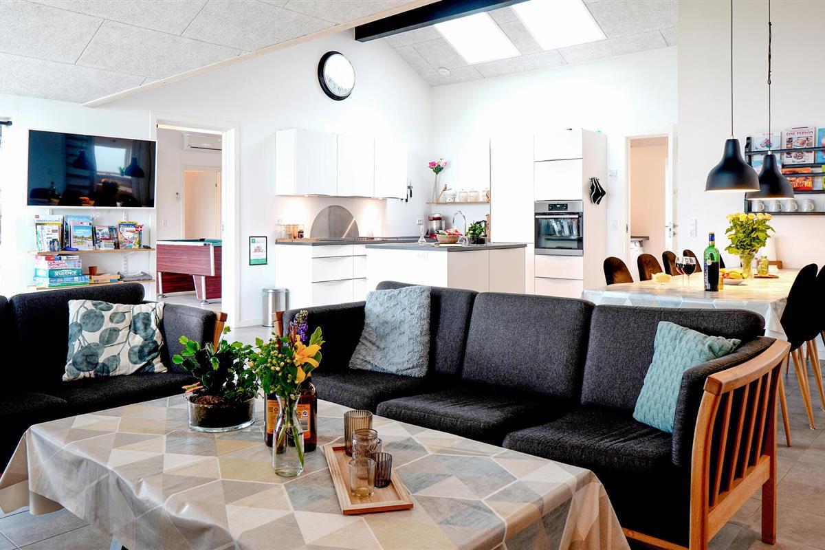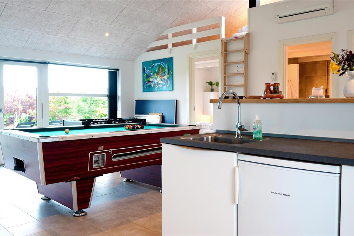 Dit mooie vakantiehuis ligt in een vakantiehuisgebied bij Flovt Strand, dat met zijn prachtige natuur en heerlijke zandstrand uitnodigt tot een geweldige vakantie. Het huis is licht ingericht met 4 goede slaapkamers. In de grote activiteitenruimte kunt u vele uren doorbrengen met tafelvoetbal en biljart. Verder is er een uitnodigende en ruime woonkamer met open keuken en eethoek. Daarnaast zijn er 2 mooie badkamers, waarvan één met een sauna, zodat u die pijnlijke spieren kunt ontspannen. Entertainment is voorzien met bobspil, tafeltennis en badminton.