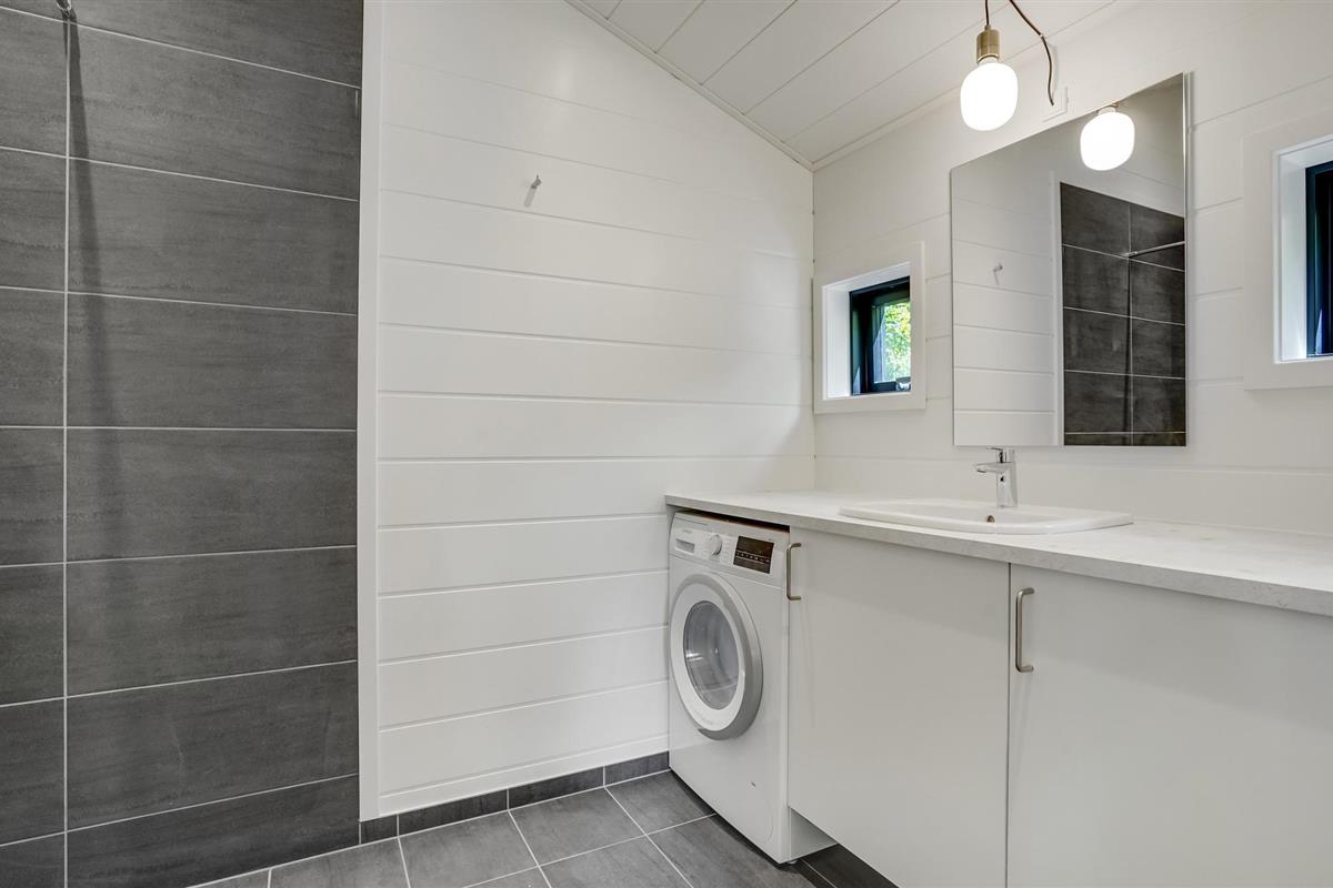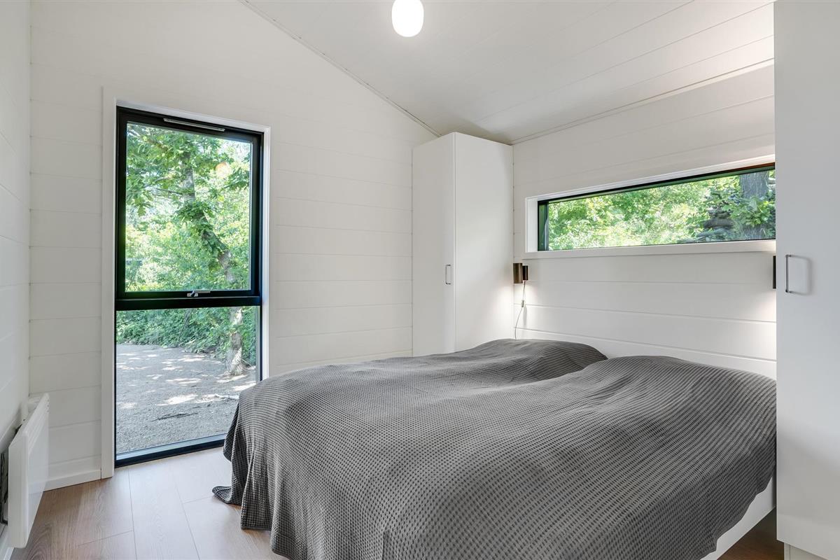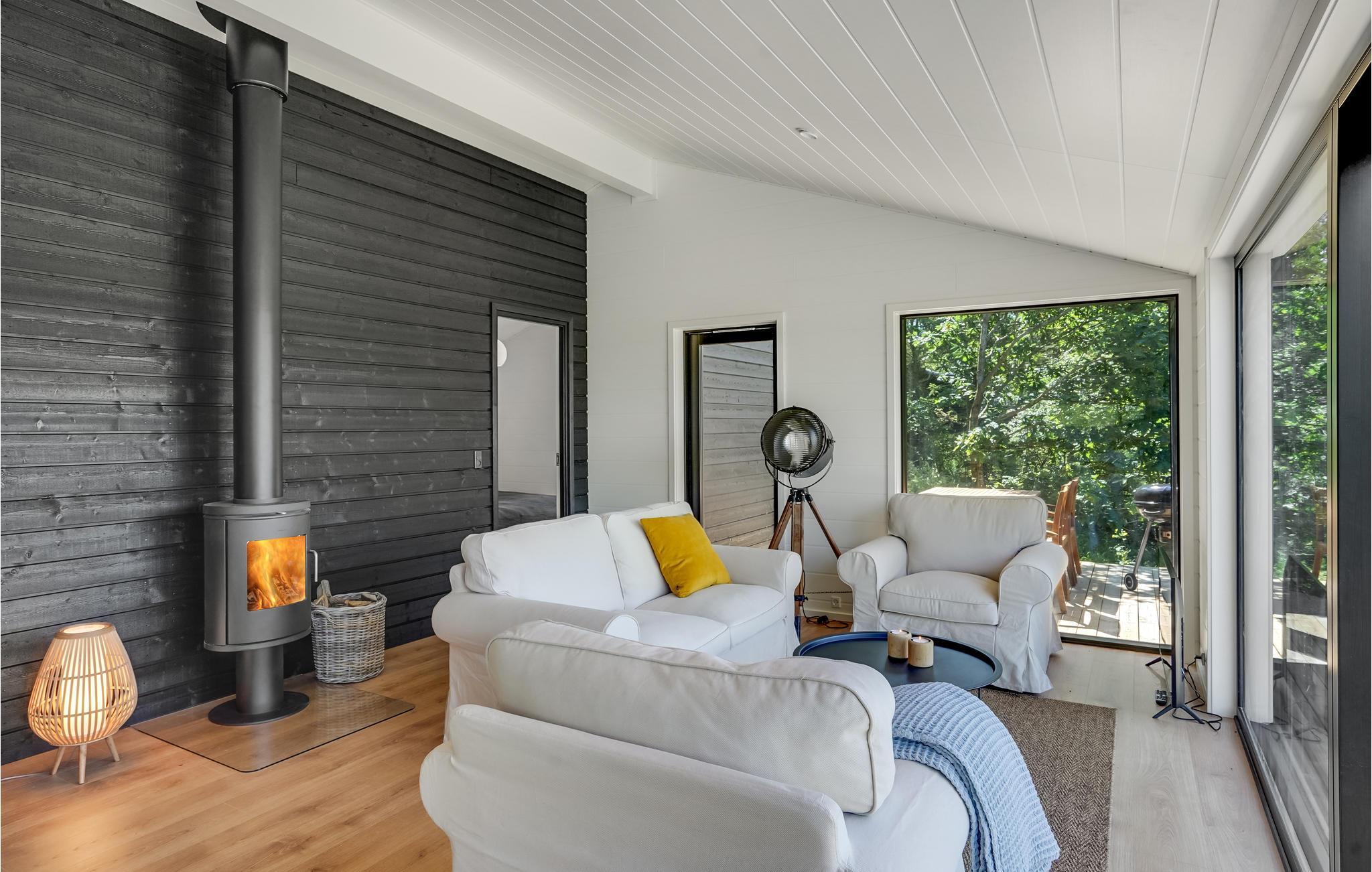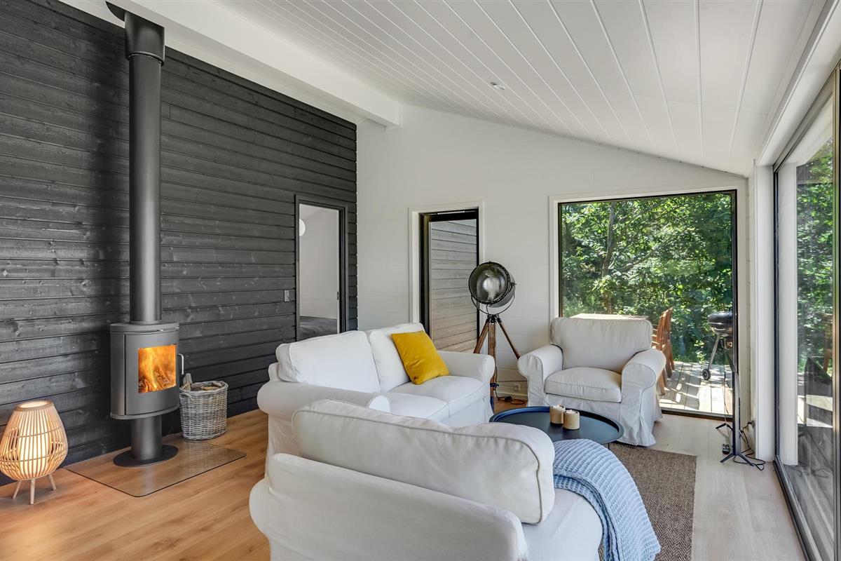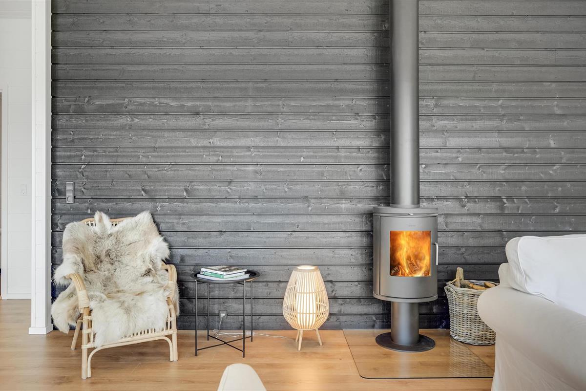Het huis is bijna volledig omgeven door houten terrassen, zodat u op elk moment van de dag kunt kiezen voor zon of schaduw. Er is een houtkachel in de woonkamer, maar die hoeft u in de zomer nauwelijks te gebruiken, want het huis heeft zoveel glaspartijen dat het automatisch wordt verwarmd.