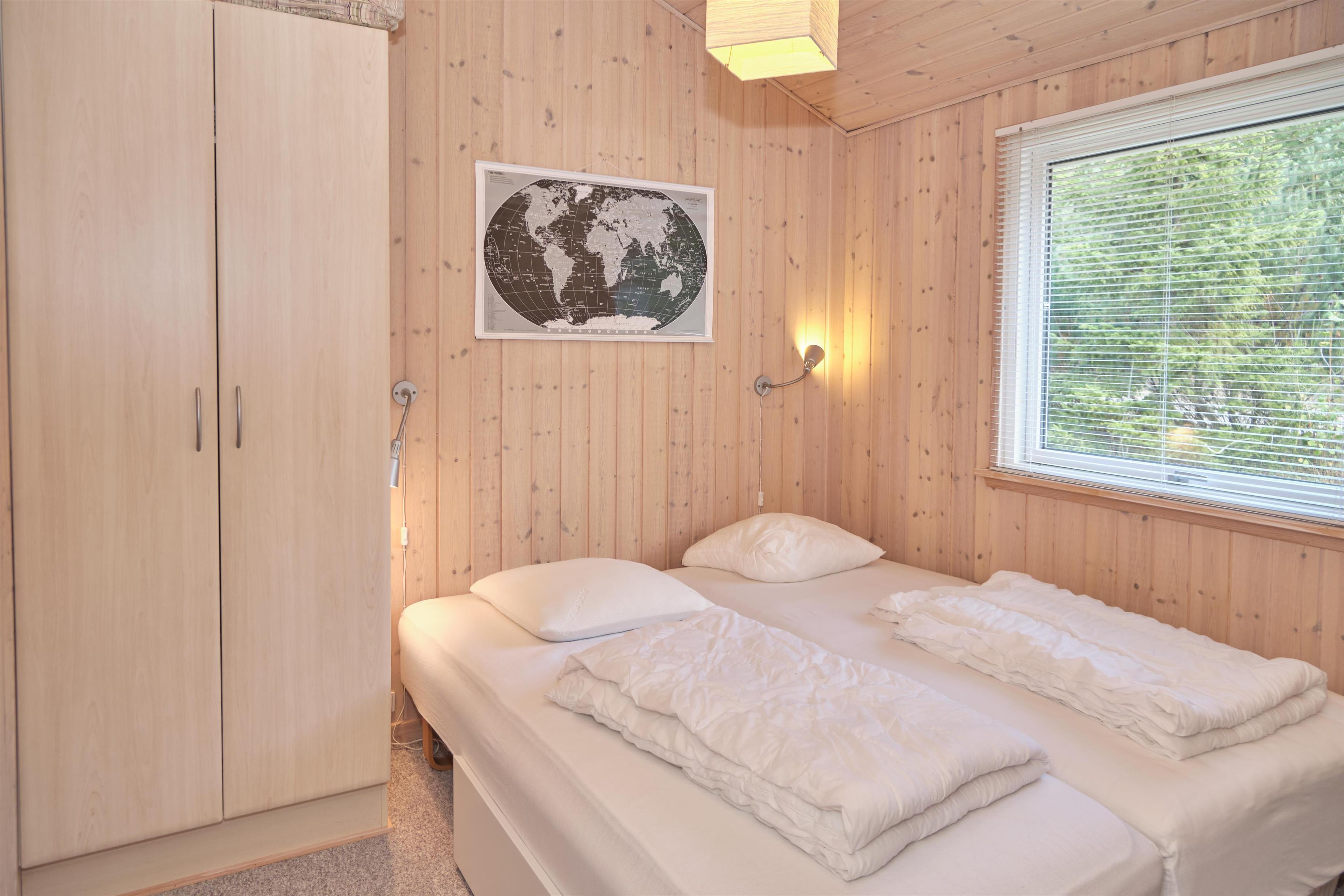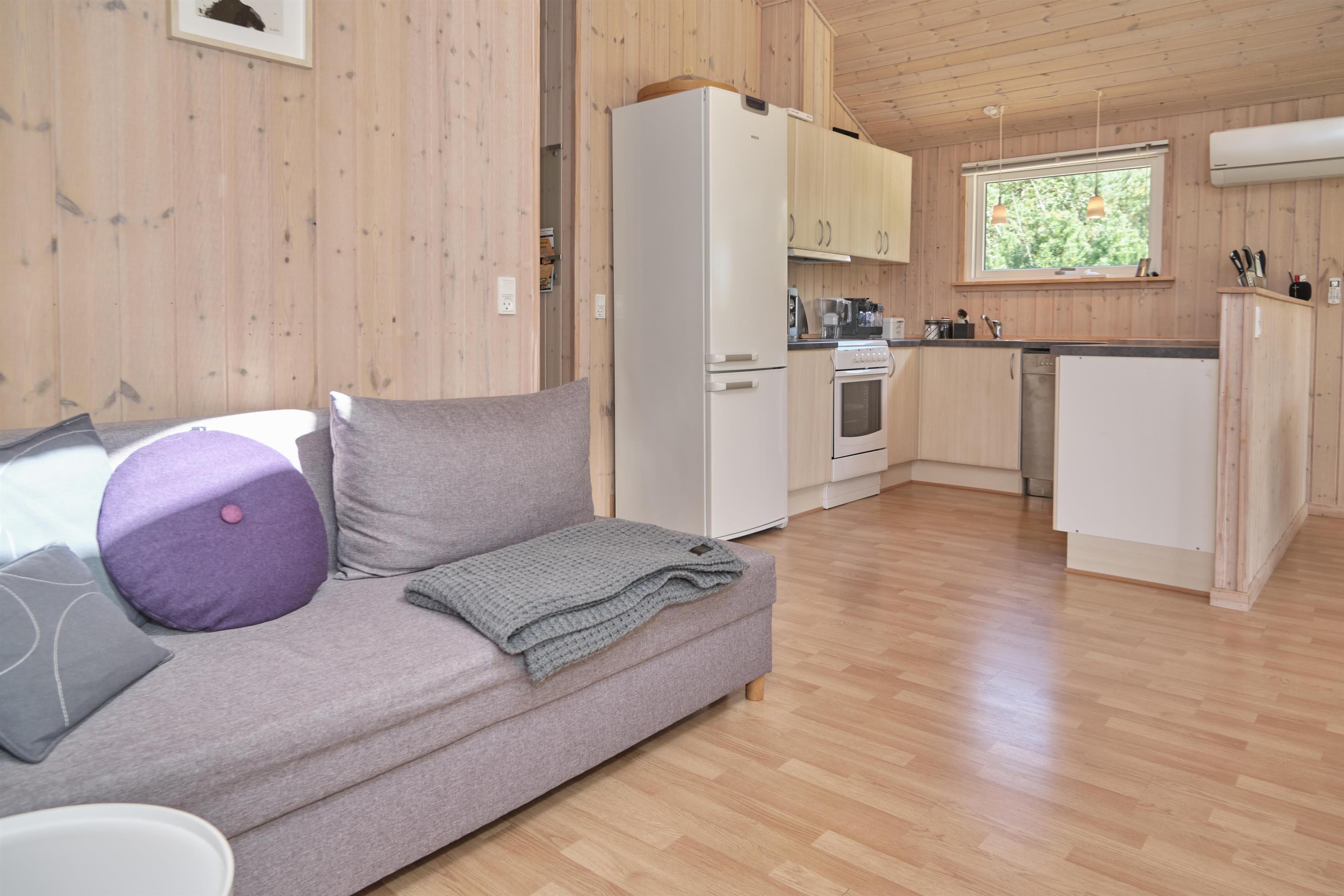 The house has a bright and welcoming interior with white-washed walls and vaulted ceilings. The well-appointed living room is open to the kitchen and includes a wood-burning stove, a dining area for seven, a cozy sofa corner, a radio, and a flat-screen TV with Chromecast—note that there are no channels, so all content must be streamed from a PC or another device. The modern kitchen is well-equipped with a ceramic cooktop and oven, refrigerator/freezer, dishwasher, and microwave. The house accommodates seven people across two large bedrooms with double beds and one smaller bedroom with a double bed and a single bed/bench. The lovely tiled bathroom includes underfloor heating, a shower, a spa bath, and a sauna, along with a washer and dryer. Internet access is available.