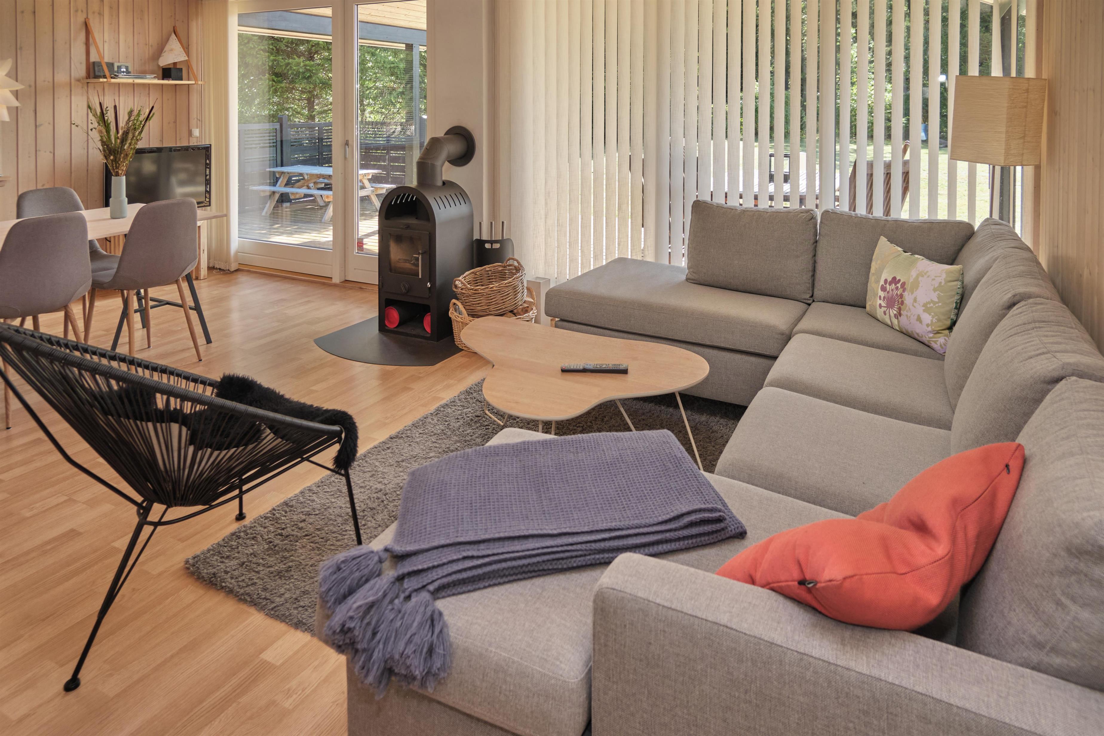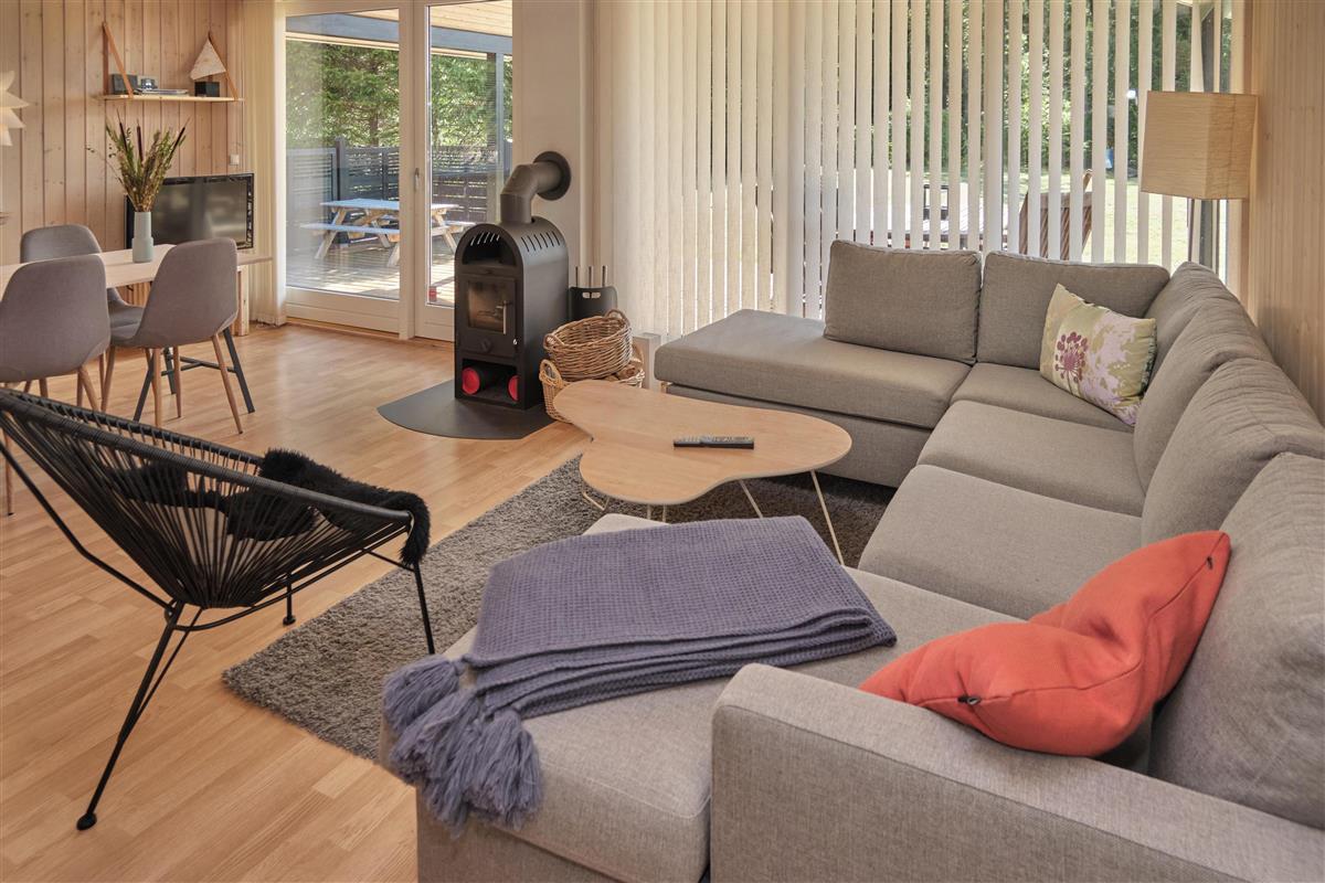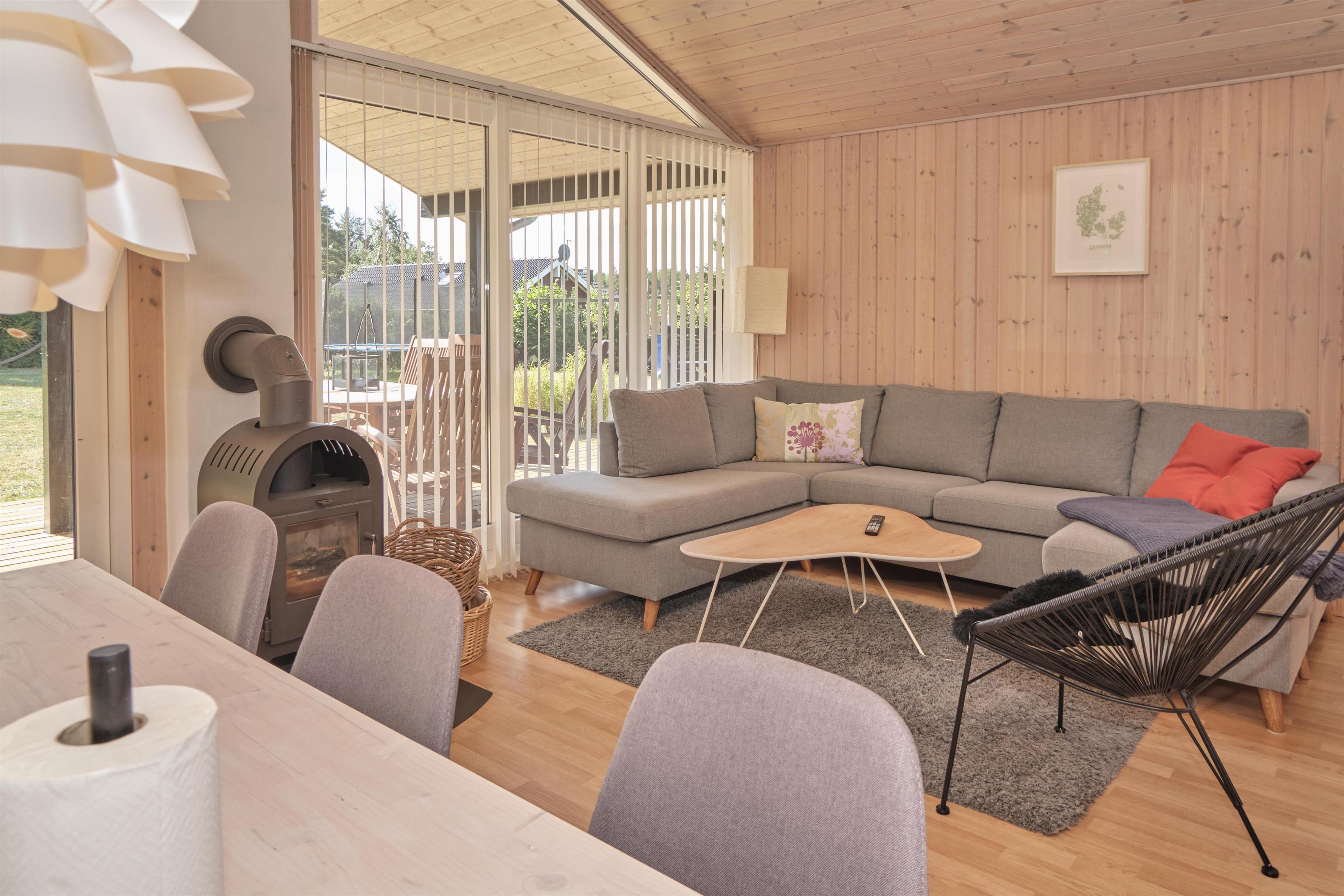 This newer, truly lovely holiday home is situated on a large, secluded natural plot in Fuglslev, north of Ebeltoft. It features a spacious, partially covered wooden terrace facing south, west, and east, allowing you to enjoy the sun all day. The terrace is furnished with outdoor seating, sun loungers, a parasol, and a grill, and the property includes a sandbox, trampoline, and play equipment for children—making it an ideal choice for families.