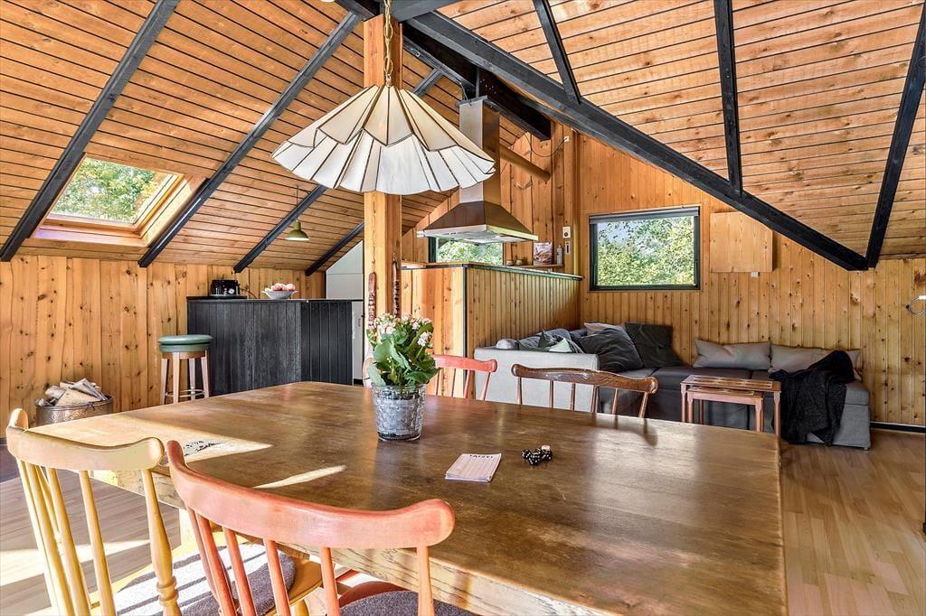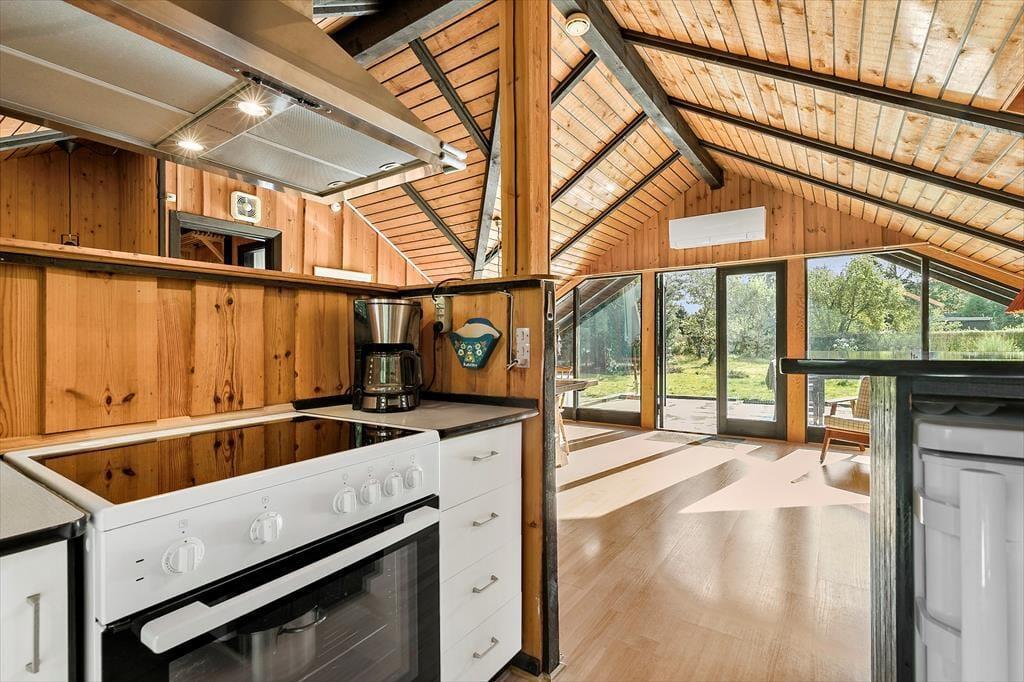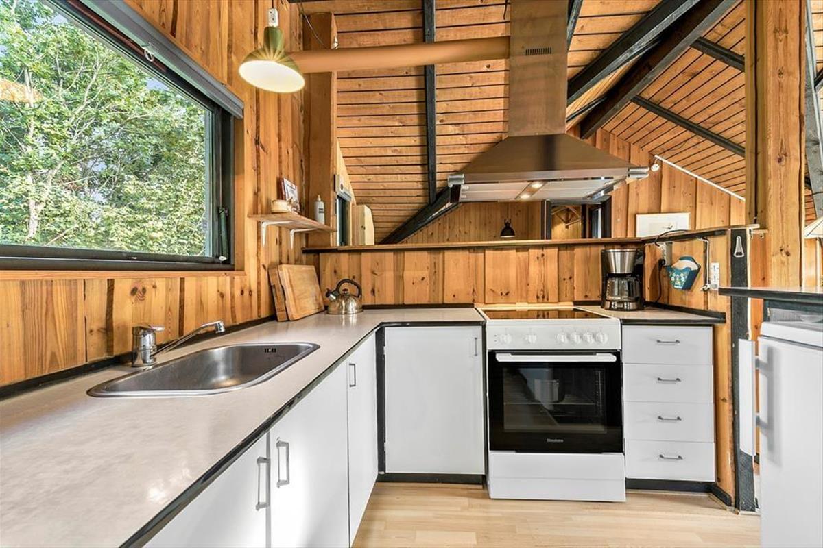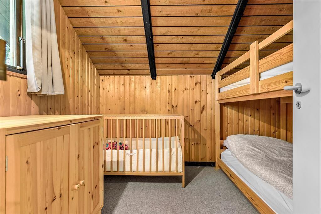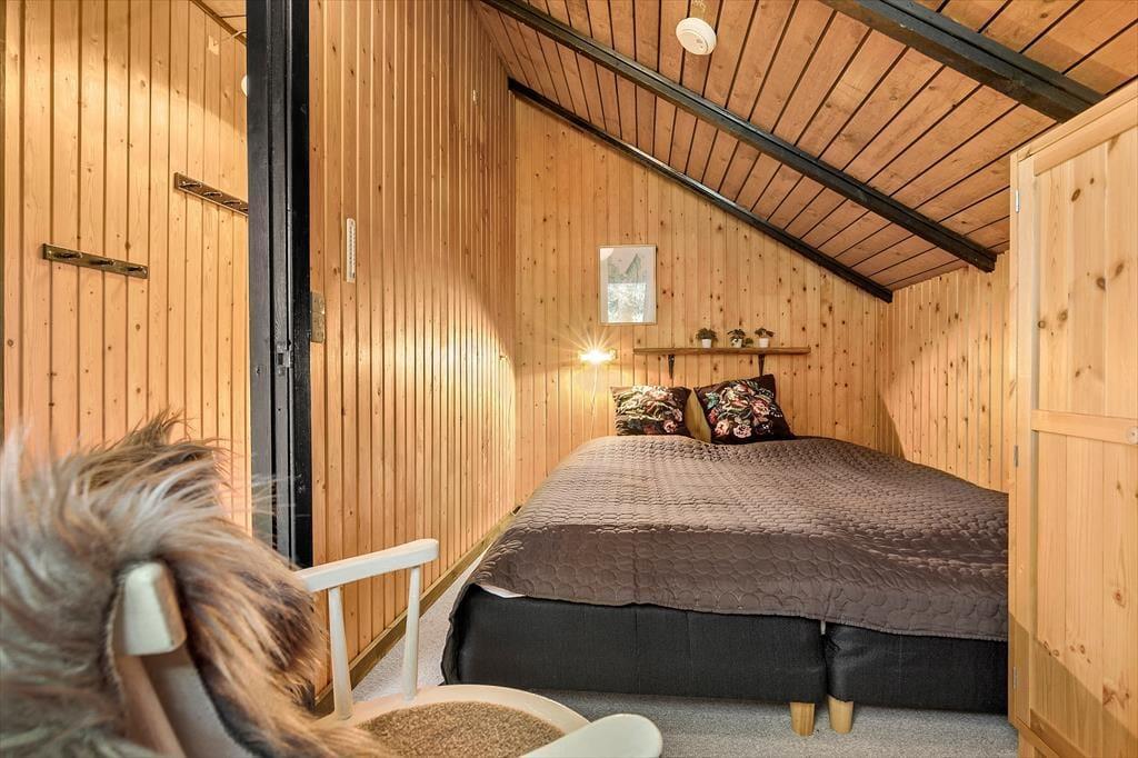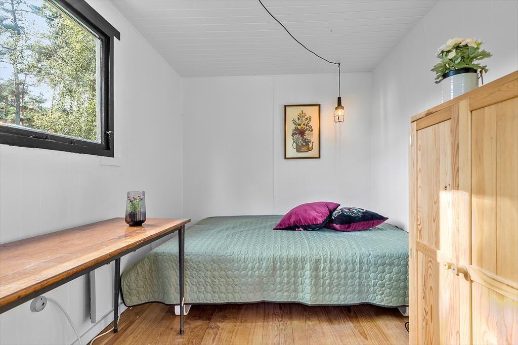 Dieses klassische Ferienhaus besticht unter anderem dank seiner schrägen Wände, der vielen Winkel und der hohen Decken mit unglaublich viel Charme und Gemütlichkeit. Die Küche, der Wohnraum und der Essbereich fügen sich zu einem hellen, offenen Raum zusammen, in dem ihr mit Ausblick in den Garten verwöhnt werdet. Der Garten ist bewusst sich selbst überlassen und präsentiert sich daher angenehm grün und natürlich. Das ältere Badezimmer ist funktionell und beinhaltet eine Dusche und eine Waschmaschine. Im Ferienhaus stehen zwei Schlafräume zur Verfügung. Einer der Räume empfängt dich mit einem Doppelbett, der andere mit einem Etagenbett und einem Gitterbettchen für den jüngsten Urlaubsgast. Das gemütliche Nebengebäude, das im Frühjahr, Sommer und Herbst nutzbar ist, beherbergt ein weiteres Doppelbett.