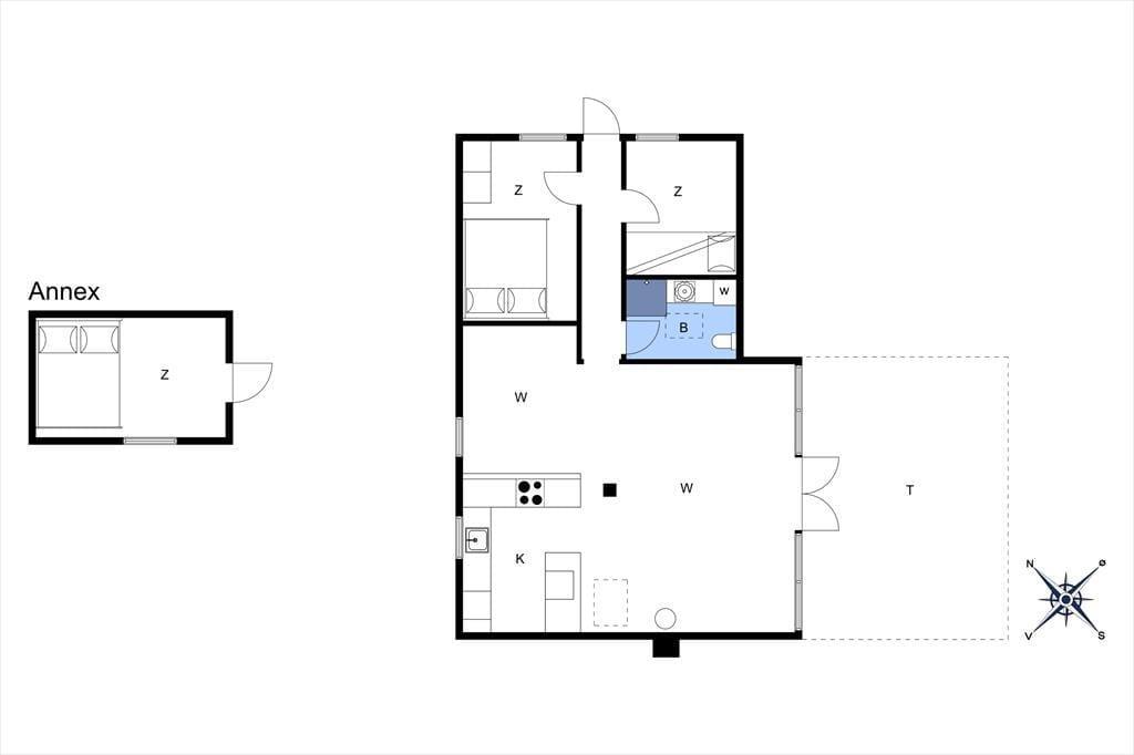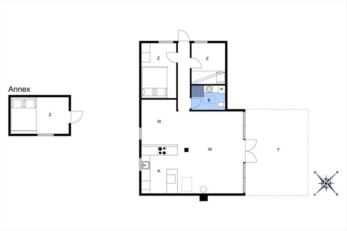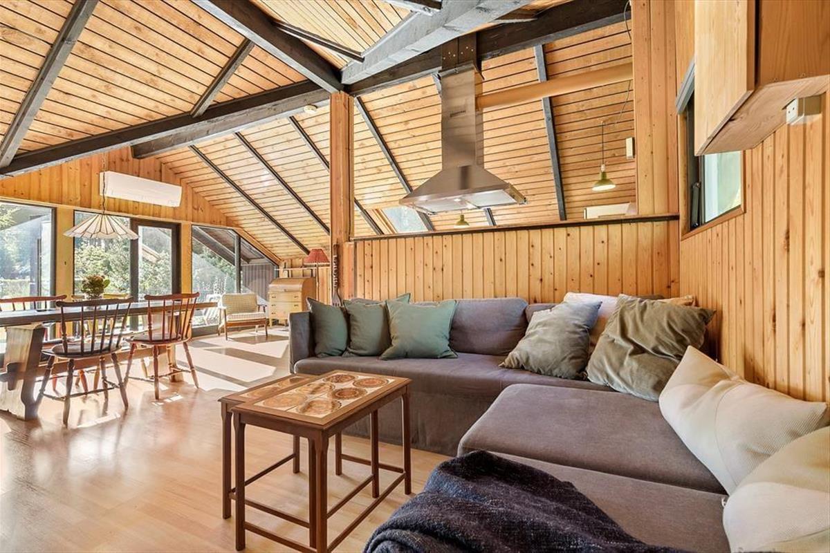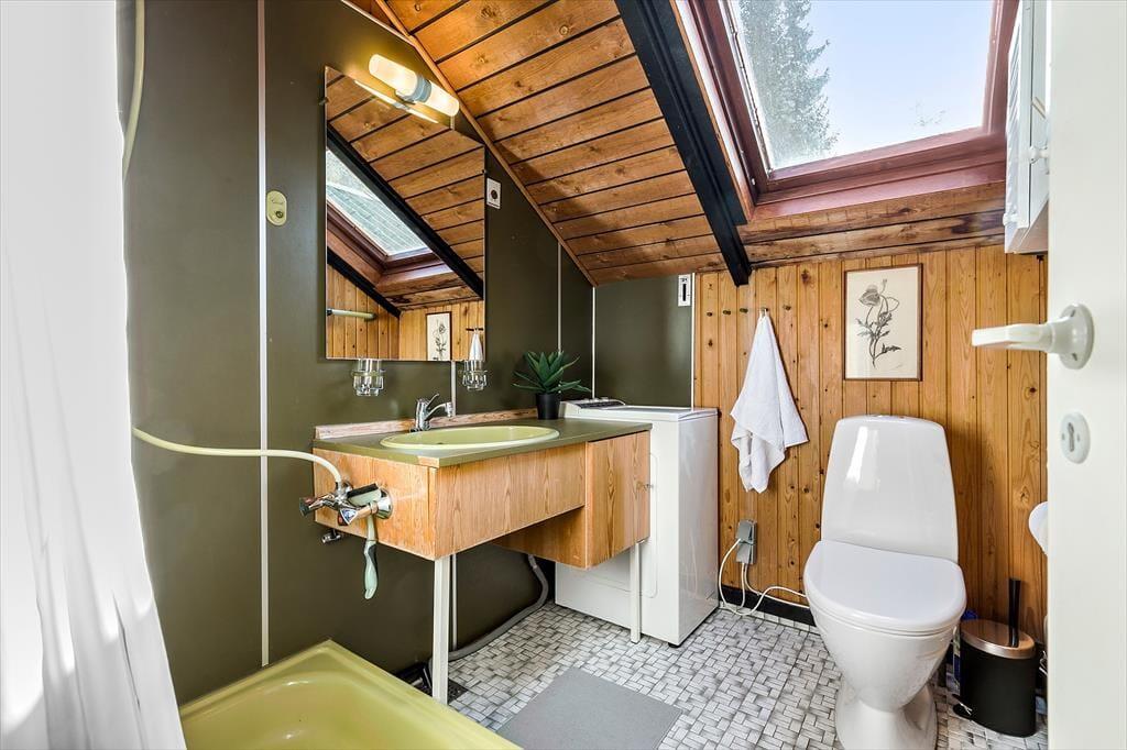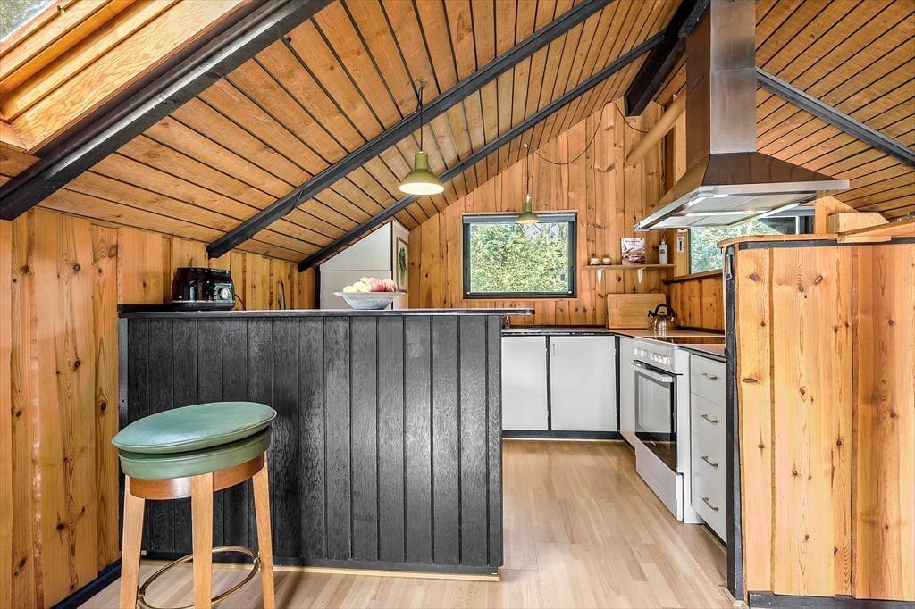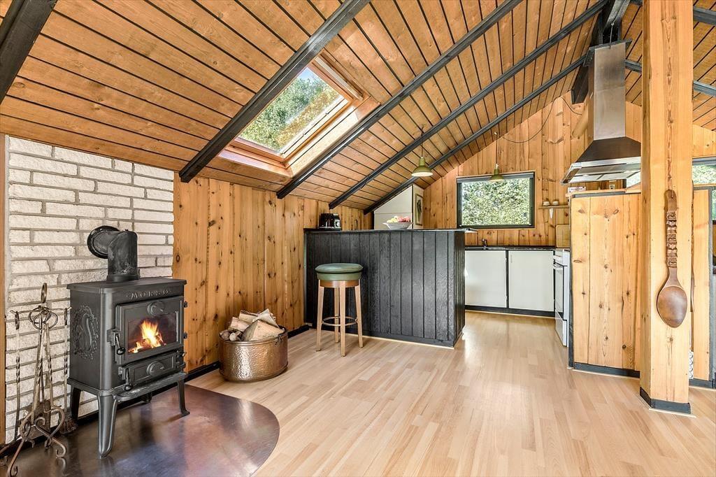 Dieses klassische Ferienhaus besticht unter anderem dank seiner schrägen Wände, der vielen Winkel und der hohen Decken mit unglaublich viel Charme und Gemütlichkeit. Die Küche, der Wohnraum und der Essbereich fügen sich zu einem hellen, offenen Raum zusammen, in dem ihr mit Ausblick in den Garten verwöhnt werdet. Der Garten ist bewusst sich selbst überlassen und präsentiert sich daher angenehm grün und natürlich. Das ältere Badezimmer ist funktionell und beinhaltet eine Dusche und eine Waschmaschine. Im Ferienhaus stehen zwei Schlafräume zur Verfügung. Einer der Räume empfängt dich mit einem Doppelbett, der andere mit einem Etagenbett und einem Gitterbettchen für den jüngsten Urlaubsgast. Das gemütliche Nebengebäude, das im Frühjahr, Sommer und Herbst nutzbar ist, beherbergt ein weiteres Doppelbett.