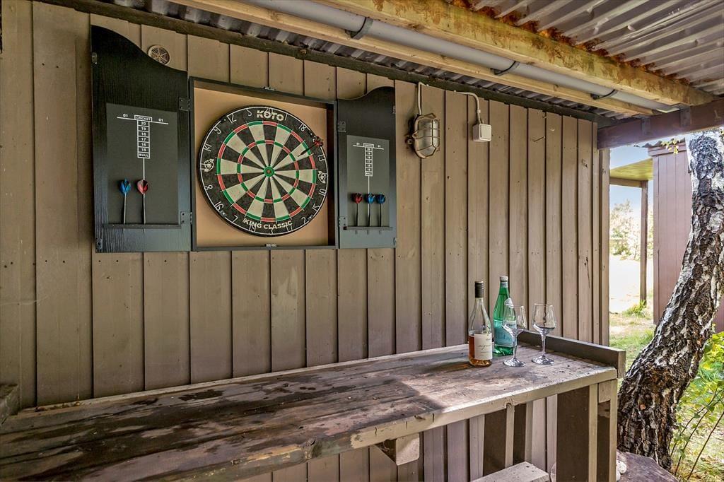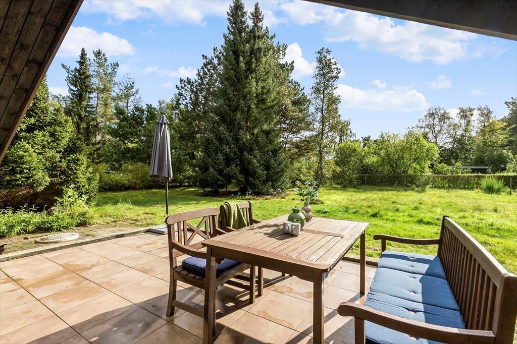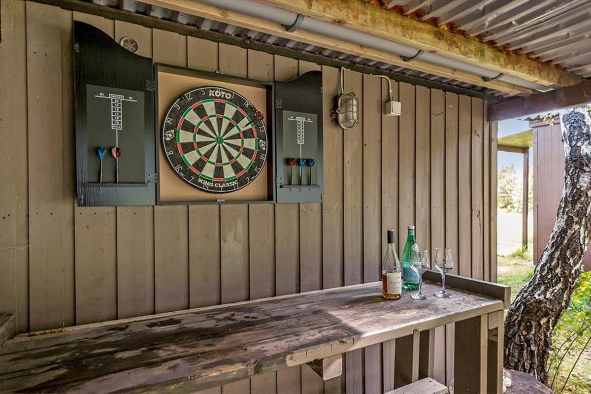 Der große Garten, der dein Haus umgibt, ist eine wahre Oase für Naturliebhaber. Kleine Pfade führen durch das hohe Gras und laden zum Entdecken der Wildpflanzen ein. Auf der teilweise überdachten Terrasse genießt du mit deinen Lieben sicher gern die täglichen Mahlzeiten - selbst an Tagen, an denen sich das Wetter nicht von seiner schönsten Seite zeigt. Im Carport könnt ihr zusammen die ein oder andere Meisterschaft im Dartsspiel ausfechten. Die Außenbereiche deines Ferienhauses sind perfekt, um viel Zeit mit der Familie zu verbringen und um sich beim Gezwitscher der Vögel in aller Ruhe zu entspannen.
